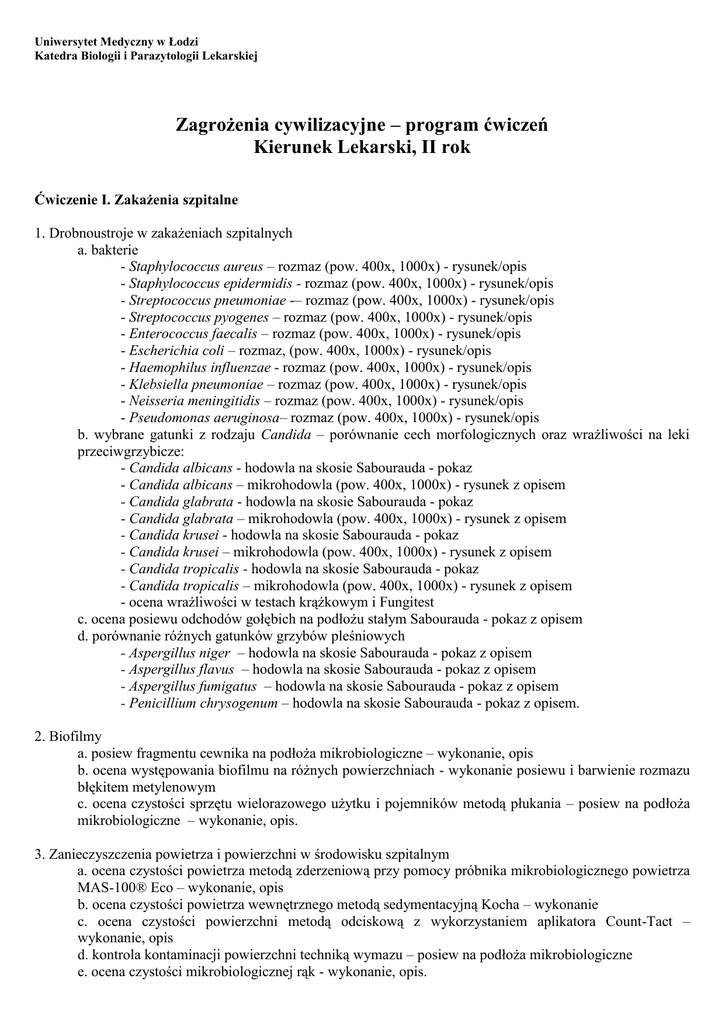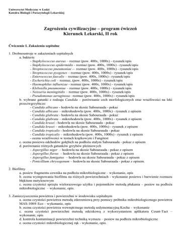 Uniwersytet Medyczny w Łodzi Katedra Biologii i Parazytologii Lekarskiej Zagrożenia cywilizacyjne – program ćwiczeń Kierunek Lekarski, II rok Ćwiczenie I. Zakażenia szpitalne 1. Drobnoustroje w zakażeniach szpitalnych a. bakterie - Staphylococcus aureus – rozmaz (pow. 400x, 1000x) - rysunek/opis - Staphylococcus epidermidis - rozmaz (pow. 400x, 1000x) - rysunek/opis - Streptococcus pneumoniae -– rozmaz (pow. 400x, 1000x) - rysunek/opis - Streptococcus pyogenes – rozmaz (pow. 400x, 1000x) - rysunek/opis - Enterococcus faecalis – rozmaz (pow. 400x, 1000x) - rysunek/opis - Escherichia coli – rozmaz, (pow. 400x, 1000x) - rysunek/opis - Haemophilus influenzae - rozmaz (pow. 400x, 1000x) - rysunek/opis - Klebsiella pneumoniae – rozmaz (pow. 400x, 1000x) - rysunek/opis - Neisseria meningitidis – rozmaz (pow. 400x, 1000x) - rysunek/opis - Pseudomonas aeruginosa– rozmaz (pow. 400x, 1000x) - rysunek/opis b. wybrane gatunki z rodzaju Candida – porównanie cech morfologicznych oraz wrażliwości na leki przeciwgrzybicze: - Candida albicans - hodowla na skosie Sabourauda - pokaz - Candida albicans – mikrohodowla (pow. 400x, 1000x) - rysunek z opisem - Candida glabrata - hodowla na skosie Sabourauda - pokaz - Candida glabrata – mikrohodowla (pow. 400x, 1000x) - rysunek z opisem - Candida krusei - hodowla na skosie Sabourauda - pokaz - Candida krusei – mikrohodowla (pow. 400x, 1000x) - rysunek z opisem - Candida tropicalis - hodowla na skosie Sabourauda - pokaz - Candida tropicalis – mikrohodowla (pow. 400x, 1000x) - rysunek z opisem - ocena wrażliwości w testach krążkowym i Fungitest c. ocena posiewu odchodów gołębich na podłożu stałym Sabourauda - pokaz z opisem d. porównanie różnych gatunków grzybów pleśniowych - Aspergillus niger – hodowla na skosie Sabourauda - pokaz z opisem - Aspergillus flavus – hodowla na skosie Sabourauda - pokaz z opisem - Aspergillus fumigatus – hodowla na skosie Sabourauda - pokaz z opisem - Penicillium chrysogenum – hodowla na skosie Sabourauda - pokaz z opisem. 2. Biofilmy a. posiew fragmentu cewnika na podłoża mikrobiologiczne – wykonanie, opis b. ocena występowania biofilmu na różnych powierzchniach - wykonanie posiewu i barwienie rozmazu błękitem metylenowym c. ocena czystości sprzętu wielorazowego użytku i pojemników metodą płukania – posiew na podłoża mikrobiologiczne – wykonanie, opis. 3. Zanieczyszczenia powietrza i powierzchni w środowisku szpitalnym a. ocena czystości powietrza metodą zderzeniową przy pomocy próbnika mikrobiologicznego powietrza MAS-100® Eco – wykonanie, opis b. ocena czystości powietrza wewnętrznego metodą sedymentacyjną Kocha – wykonanie c. ocena czystości powierzchni metodą odciskową z wykorzystaniem aplikatora Count-Tact – wykonanie, opis d. kontrola kontaminacji powierzchni techniką wymazu – posiew na podłoża mikrobiologiczne e. ocena czystości mikrobiologicznej rąk - wykonanie, opis. Ćwiczenie II. Wpływ używek na organizm człowieka 1. Ocena posiewów wykonanych na poprzednich zajęciach – stopień kontaminacji, interpretacja wyników a. cewnika b. różnych powierzchni c. sprzętu wielorazowego użytku i pojemników d. powietrza: - metodą zderzeniową - metodą sedymentacyjną Kocha 2. Rodzaje uzależnień: a. Alkoholizm - model zaburzenia widzenia po spożyciu alkoholu etylowego – prezentacja - wpływ spożywania alkoholu przez ciężarną na zarodek/płód – płodowy zespół alkoholowy – embriopatia i fetopatia alkoholowa – przezrocze pokaz. b. Narkomania - substancje psychoaktywne – plansza informacyjna Krajowego Biura ds. Przeciwdziałania Narkomanii, pokaz - rodzaje i wpływ substancji psychoaktywnych na organizm człowieka - tabela - Nasze dzieci i zagrożenia: Dopalacze – wypalacze – ulotka KBdsZN - wybrane testy polowe do wykrywania i wstępnego identyfikowania podejrzanych substancji – doświadczenie, pokaz z instrukcją - test wykrywania podejrzanych substancji w moczu – doświadczenie, pokaz c. Nikotynizm - model palacza – prezentacja - substancje toksyczne i rakotwórcze zawarte w dymie tytoniowym – rycina. Ćwiczenie III. Wybrane choroby cywilizacyjne 1. Alergie, astma – alergeny wziewne a. Alternaria sp. - hodowla na skosie Sabourauda – opis - zarodniki - prep. mikr. utrw. niebarw., pow. 100 x – rys. b. Cladosporium sp. - hodowla na skosie Sabourauda – opis - zarodniki - prep. mikr. utrw. niebarw., pow. 100 x – rys. c. alergeny roślinne - pyłki różnych roślin, prep. mikr. utrw. niebarw., pow. 100, 400 x – rys. d. roztocze kurzu domowego - prep. bezpśred. kurzu z pomieszczeń; - prep. mikr. utrw. niebarw., pow. 100 x – rys. 2. Czynniki ryzyka rozwoju chorób (nadwaga, otyłość, cukrzyca, zespół metaboliczny) – pomiar i analiza wskaźników: a. BMI - miernik oceny masy ciała b. obwód w pasie – miernik otyłości brzusznej c. WHR – miernik typu otyłości d. stężenie glukozy w krwi. 3. Ocena całkowitego ryzyka zgonu z powodu chorób układu krążenia w zależności od płci, wieku, skurczowego ciśnienia tętniczego, cholesterolu całkowitego i palenia tytoniu – tabele HeartSCORE, analiza.