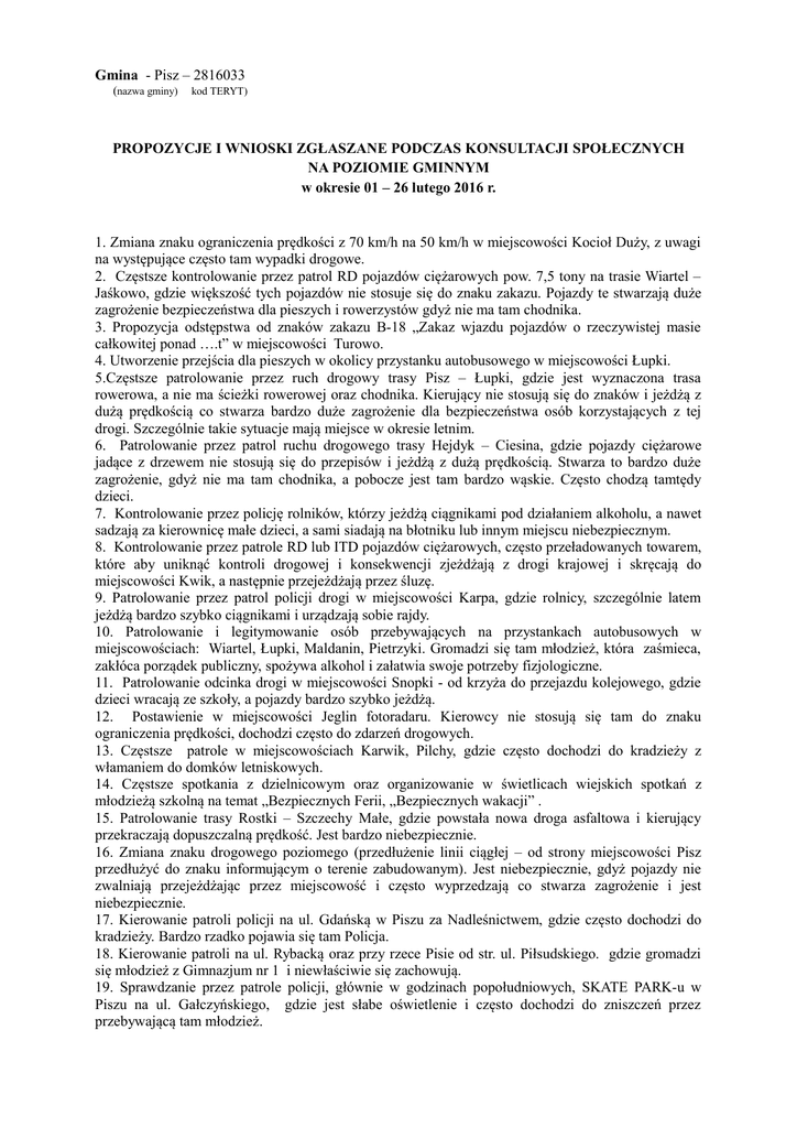 Gmina - Pisz – 2816033 (nazwa gminy) kod TERYT) PROPOZYCJE I WNIOSKI ZGŁASZANE PODCZAS KONSULTACJI SPOŁECZNYCH NA POZIOMIE GMINNYM w okresie 01 – 26 lutego 2016 r. 1. Zmiana znaku ograniczenia prędkości z 70 km/h na 50 km/h w miejscowości Kocioł Duży, z uwagi na występujące często tam wypadki drogowe. 2. Częstsze kontrolowanie przez patrol RD pojazdów ciężarowych pow. 7,5 tony na trasie Wiartel – Jaśkowo, gdzie większość tych pojazdów nie stosuje się do znaku zakazu. Pojazdy te stwarzają duże zagrożenie bezpieczeństwa dla pieszych i rowerzystów gdyż nie ma tam chodnika. 3. Propozycja odstępstwa od znaków zakazu B-18 „Zakaz wjazdu pojazdów o rzeczywistej masie całkowitej ponad ….t” w miejscowości Turowo. 4. Utworzenie przejścia dla pieszych w okolicy przystanku autobusowego w miejscowości Łupki. 5.Częstsze patrolowanie przez ruch drogowy trasy Pisz – Łupki, gdzie jest wyznaczona trasa rowerowa, a nie ma ścieżki rowerowej oraz chodnika. Kierujący nie stosują się do znaków i jeżdżą z dużą prędkością co stwarza bardzo duże zagrożenie dla bezpieczeństwa osób korzystających z tej drogi. Szczególnie takie sytuacje mają miejsce w okresie letnim. 6. Patrolowanie przez patrol ruchu drogowego trasy Hejdyk – Ciesina, gdzie pojazdy ciężarowe jadące z drzewem nie stosują się do przepisów i jeżdżą z dużą prędkością. Stwarza to bardzo duże zagrożenie, gdyż nie ma tam chodnika, a pobocze jest tam bardzo wąskie. Często chodzą tamtędy dzieci. 7. Kontrolowanie przez policję rolników, którzy jeżdżą ciągnikami pod działaniem alkoholu, a nawet sadzają za kierownicę małe dzieci, a sami siadają na błotniku lub innym miejscu niebezpiecznym. 8. Kontrolowanie przez patrole RD lub ITD pojazdów ciężarowych, często przeładowanych towarem, które aby uniknąć kontroli drogowej i konsekwencji zjeżdżają z drogi krajowej i skręcają do miejscowości Kwik, a następnie przejeżdżają przez śluzę. 9. Patrolowanie przez patrol policji drogi w miejscowości Karpa, gdzie rolnicy, szczególnie latem jeżdżą bardzo szybko ciągnikami i urządzają sobie rajdy. 10. Patrolowanie i legitymowanie osób przebywających na przystankach autobusowych w miejscowościach: Wiartel, Łupki, Maldanin, Pietrzyki. Gromadzi się tam młodzież, która zaśmieca, zakłóca porządek publiczny, spożywa alkohol i załatwia swoje potrzeby fizjologiczne. 11. Patrolowanie odcinka drogi w miejscowości Snopki - od krzyża do przejazdu kolejowego, gdzie dzieci wracają ze szkoły, a pojazdy bardzo szybko jeżdżą. 12. Postawienie w miejscowości Jeglin fotoradaru. Kierowcy nie stosują się tam do znaku ograniczenia prędkości, dochodzi często do zdarzeń drogowych. 13. Częstsze patrole w miejscowościach Karwik, Pilchy, gdzie często dochodzi do kradzieży z włamaniem do domków letniskowych. 14. Częstsze spotkania z dzielnicowym oraz organizowanie w świetlicach wiejskich spotkań z młodzieżą szkolną na temat „Bezpiecznych Ferii, „Bezpiecznych wakacji” . 15. Patrolowanie trasy Rostki – Szczechy Małe, gdzie powstała nowa droga asfaltowa i kierujący przekraczają dopuszczalną prędkość. Jest bardzo niebezpiecznie. 16. Zmiana znaku drogowego poziomego (przedłużenie linii ciągłej – od strony miejscowości Pisz przedłużyć do znaku informującym o terenie zabudowanym). Jest niebezpiecznie, gdyż pojazdy nie zwalniają przejeżdżając przez miejscowość i często wyprzedzają co stwarza zagrożenie i jest niebezpiecznie. 17. Kierowanie patroli policji na ul. Gdańską w Piszu za Nadleśnictwem, gdzie często dochodzi do kradzieży. Bardzo rzadko pojawia się tam Policja. 18. Kierowanie patroli na ul. Rybacką oraz przy rzece Pisie od str. ul. Piłsudskiego. gdzie gromadzi się młodzież z Gimnazjum nr 1 i niewłaściwie się zachowują. 19. Sprawdzanie przez patrole policji, głównie w godzinach popołudniowych, SKATE PARK-u w Piszu na ul. Gałczyńskiego, gdzie jest słabe oświetlenie i często dochodzi do zniszczeń przez przebywającą tam młodzież. 20. Sprawdzanie przez patrole klatek schodowych w bloku przy ul. Piaskowej oraz ul. Grunwaldzkiej, gdzie młodzież pali papierosy i zaśmieca. 21. Większe respektowanie przez patrole przepisów dotyczących wyprowadzania zwierząt na smyczy. 22. Zmiana oznakowania lub zwracania uwagi osobom przyjeżdżającym do banku lub urzędu, którzy parkują pojazdy w miejscach, które są przeznaczone tylko dla mieszkańców ul. Okopowej. 23. Utworzenie ścieżek rowerowych w miejscowości Pisz do miejscowości Wiartel, Szeroki Bór Piski, Babrosty, Łupki. 24. Patrolowanie rejonów przystanków autobusowych w Piszu szczególnie na ul. Klementowskiego oraz pustostanu przy zakładzie SKLEJKA, gdzie młodzież dokonuje zniszczeń. 25. Sprawdzanie ogrodów działkowych w Piszu , w sezonie letnim, przez policyjne patrole rowerowe 26. Utworzenie monitoringu miejskiego, szczególnie na ul. Wyzwolenia oraz Pl. Daszyński w Piszu, gdzie często w godzinach popołudniowo – nocnych gromadzi się młodzież i zakłóca ład i porządek publiczny. 27. Skierowanie patroli policyjnych na ul. Trzcinową w Piszu, gdzie za Parafią w lasku gromadzi się młodzież , która niewłaściwie się zachowuje. 27. Skierowanie patroli na Al. Turystów w Piszu, pojazdy bardzo szybko jeżdżą. P 28. Skierowanie patroli policyjnych na oś. Wschód, gdzie za Parafią w lasku gromadzi się młodzież, która niewłaściwie się zachowuje, spożywa alkohol, a nawet może dochodzić do handlu lub zażywania środków odurzających. 29. Skierowanie patroli policyjnych w rejon cmentarza przy ul. Mickiewicza, gdzie młodzież się niewłaściwie zachowuje. 30. Skierowanie patroli na ul. Kościuszki za tzw. KINEM, gdzie w godzinach wieczornych i nocnych gromadzi się młodzież, często dochodzi do bójek, zakłócają ład i porządek publiczny. 31. Zmiana organizacji ruchu lub zamontowan