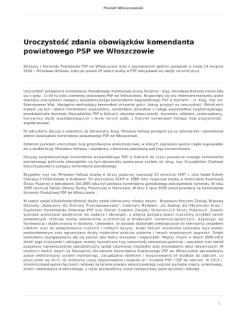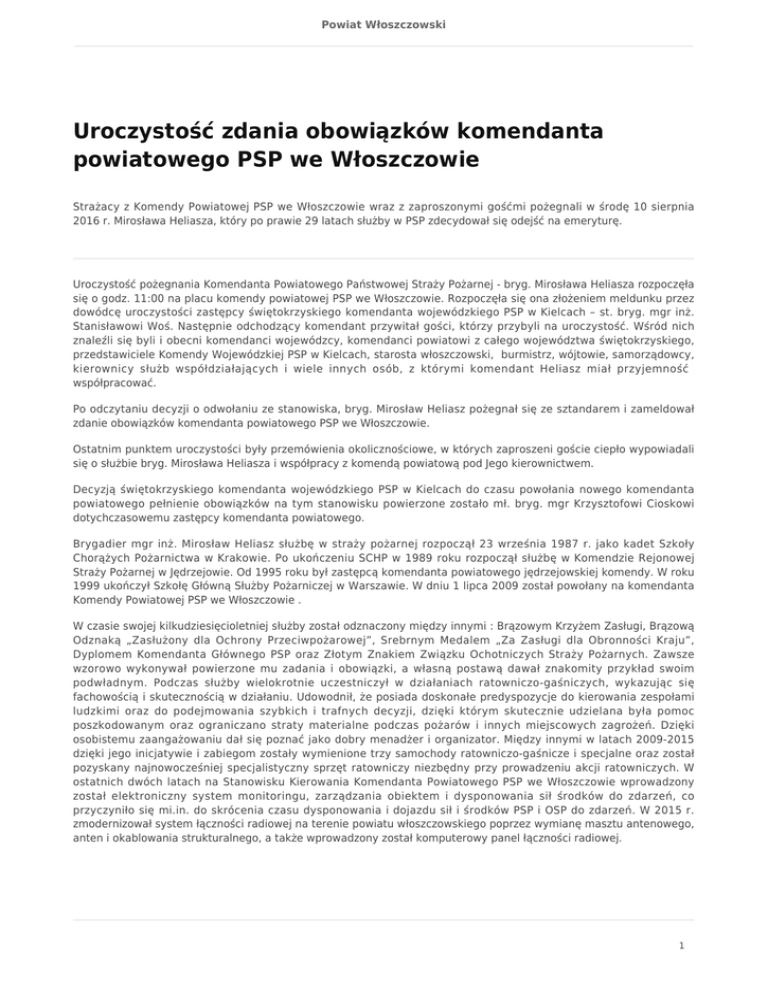 Powiat Włoszczowski Uroczystość zdania obowiązków komendanta powiatowego PSP we Włoszczowie Strażacy z Komendy Powiatowej PSP we Włoszczowie wraz z zaproszonymi gośćmi pożegnali w środę 10 sierpnia 2016 r. Mirosława Heliasza, który po prawie 29 latach służby w PSP zdecydował się odejść na emeryturę. Uroczystość pożegnania Komendanta Powiatowego Państwowej Straży Pożarnej - bryg. Mirosława Heliasza rozpoczęła się o godz. 11:00 na placu komendy powiatowej PSP we Włoszczowie. Rozpoczęła się ona złożeniem meldunku przez dowódcę uroczystości zastępcy świętokrzyskiego komendanta wojewódzkiego PSP w Kielcach – st. bryg. mgr inż. Stanisławowi Woś. Następnie odchodzący komendant przywitał gości, którzy przybyli na uroczystość. Wśród nich znaleźli się byli i obecni komendanci wojewódzcy, komendanci powiatowi z całego województwa świętokrzyskiego, przedstawiciele Komendy Wojewódzkiej PSP w Kielcach, starosta włoszczowski, burmistrz, wójtowie, samorządowcy, kierownicy służb współdziałających i wiele innych osób, z którymi komendant Heliasz miał przyjemność współpracować. Po odczytaniu decyzji o odwołaniu ze stanowiska, bryg. Mirosław Heliasz pożegnał się ze sztandarem i zameldował zdanie obowiązków komendanta powiatowego PSP we Włoszczowie. Ostatnim punktem uroczystości były przemówienia okolicznościowe, w których zaproszeni goście ciepło wypowiadali się o służbie bryg. Mirosława Heliasza i współpracy z komendą powiatową pod Jego kierownictwem. Decyzją świętokrzyskiego komendanta wojewódzkiego PSP w Kielcach do czasu powołania nowego komendanta powiatowego pełnienie obowiązków na tym stanowisku powierzone zostało mł. bryg. mgr Krzysztofowi Cioskowi dotychczasowemu zastępcy komendanta powiatowego. Brygadier mgr inż. Mirosław Heliasz służbę w straży pożarnej rozpoczął 23 września 1987 r. jako kadet Szkoły Chorążych Pożarnictwa w Krakowie. Po ukończeniu SCHP w 1989 roku rozpoczął służbę w Komendzie Rejonowej Straży Pożarnej w Jędrzejowie. Od 1995 roku był zastępcą komendanta powiatowego jędrzejowskiej komendy. W roku 1999 ukończył Szkołę Główną Służby Pożarniczej w Warszawie. W dniu 1 lipca 2009 został powołany na komendanta Komendy Powiatowej PSP we Włoszczowie . W czasie swojej kilkudziesięcioletniej służby został odznaczony między innymi : Brązowym Krzyżem Zasługi, Brązową Odznaką „Zasłużony dla Ochrony Przeciwpożarowej”, Srebrnym Medalem „Za Zasługi dla Obronności Kraju”, Dyplomem Komendanta Głównego PSP oraz Złotym Znakiem Związku Ochotniczych Straży Pożarnych. Zawsze wzorowo wykonywał powierzone mu zadania i obowiązki, a własną postawą dawał znakomity przykład swoim podwładnym. Podczas służby wielokrotnie uczestniczył w działaniach ratowniczo-gaśniczych, wykazując się fachowością i skutecznością w działaniu. Udowodnił, że posiada doskonałe predyspozycje do kierowania zespołami ludzkimi oraz do podejmowania szybkich i trafnych decyzji, dzięki którym skutecznie udzielana była pomoc poszkodowanym oraz ograniczano straty materialne podczas pożarów i innych miejscowych zagrożeń. Dzięki osobistemu zaangażowaniu dał się poznać jako dobry menadżer i organizator. Między innymi w latach 2009-2015 dzięki jego inicjatywie i zabiegom zostały wymienione trzy samochody ratowniczo-gaśnicze i specjalne oraz został pozyskany najnowocześniej specjalistyczny sprzęt ratowniczy niezbędny przy prowadzeniu akcji ratowniczych. W ostatnich dwóch latach na Stanowisku Kierowania Komendanta Powiatowego PSP we Włoszczowie wprowadzony został elektroniczny system monitoringu, zarządzania obiektem i dysponowania sił środków do zdarzeń, co przyczyniło się mi.in. do skrócenia czasu dysponowania i dojazdu sił i środków PSP i OSP do zdarzeń. W 2015 r. zmodernizował system łączności radiowej na terenie powiatu włoszczowskiego poprzez wymianę masztu antenowego, anten i okablowania strukturalnego, a także wprowadzony został komputerowy panel łączności radiowej. 1 Powiat Włoszczowski Źródło: strona internetowa Komendy Powiatowej PSP we Włoszczowie 2