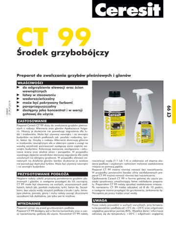 CT 99 Środek grzybobójczy WŁAŚCIWOŚCI do odgrzybiania elewacji oraz ścian wewnętrznych łatwy w stosowaniu wodorozcieńczalny może być pokrywany farbami paroprzepuszczalny dostępny jako koncentrat i w wersji gotowej do użycia CT 99 CERESIT CT_99_KT_03.10 Preparat do zwalczania grzybów pleśniowych i glonów ZASTOSOWANIE Preparat Ceresit CT 99 służy do zwalczania grzybów pleśniowych z rodzaju Alternaria oraz glonów Apatococcus Vulgaris. Niszczy je skutecznie nie powodując zagrożenia dla ludzi i środowiska. Może być używany wewnątrz i na zewnątrz budynków na takich podłożach jak: powłoki malarskie, tynki, beton itp. Grzyby z rodzaju Alternaria dominują głównie w środowisku zewnętrznym ale w obecnym czasie z uwagi na wysoką szczelność pomieszczeń występują coraz częściej wewnątrz budynków. Kolonizują zazwyczaj zawilgocone i zakurzone ściany oraz okolice okien i parapetów. W przypadku wysokiego stężenia zarodników stanowią zagrożenie dla osób uczulonych na alergeny grzybowe. W przypadku elewacji narażonych na działanie glonów bardzo skutecznie je zwalcza nie powodując destrukcji tynków. Może być używany wewnątrz i na zewnątrz budynków. PRZYGOTOWANIE PODŁOŻA Najpierw należy ustalić przyczynę powstawania grzybów pleśniowych i glonów, a następnie przystąpić do ich usunięcia. CT 99 może być stosowany na suchych, oczyszczonych podłożach, takich jak: powłoki malarskie, tynki, beton itp. Szczotkami, bez użycia wody, oczyścić podłoże z brudu i pyłu. Istniejące pleśnie, porosty, glony i mchy należy usunąć drucianymi szczotkami tak dokładnie, jak tylko jest to możliwe. WYKONANIE Preparat nanosi się przed gruntowaniem podłoża. Preparat CT 99 dostępny jest w formie koncentratu oraz w wersji rozcieńczonej, gotowej do użycia. Koncentrat CT 99 należy rozcieńczyć wodą (1:1 lub 1:4) w zależności od stopnia skażenia podłoża i uzyskanym roztworem malować zaatakowane miejsca za pomocą pędzla. Preparat CT 99 można również nanosić bez rozcieńczenia. W przypadku powierzchni bardzo silnie zainfekowanych preparat CT 99 można nanosić również bez rozcieńczenia. Opakowanie Ceresit CT 99 w formie gotowej do użycia posiada spryskiwacz umożliwiający łatwe nakładanie preparatu. Preparatem CT 99 należy spryskać zaatakowane miejsca. Po naniesieniu CT 99 trzeba odczekać od 8 do 10 godzin, a następnie można przystąpić do gruntowania, tynkowania itp. Narzędzia po pracy trzeba umyć wodą. UWAGA Prace należy prowadzić w suchych warunkach, przy temperaturze powietrza i podłoża od +5°C do +25°C oraz wilgotności względnej powietrza poniżej 80%. Wszelkie dane i informacje odnoszą się do temperatury +20°C i wilgotności względnej powietrza 60%. W innych warunkach należy uwzględnić krótszy lub dłuższy czas schnięcia materiału. CT 99 zawiera organiczne biocydy, mogące podrażniać oczy, skórę i drogi oddechowe. Podczas pracy nie wolno palić ani spożywać posiłków. Stosować rękawice i okulary ochronne. Wszelkie zachlapania preparatem natychmiast zmywać wodą. W przypadku kontaktu z oczami spłukiwać je przez kilka minut bieżącą wodą i zasięgnąć porady lekarza. Pomieszczenia po zastosowaniu preparatu należy wietrzyć do zaniku zapachu przed oddaniem ich do użytku. Preparat trzymać z dala od żywności. Chronić przed dziećmi. ZALECENIA Niniejsza karta techniczna określa zakres stosowania materiału i sposób prowadzenia robót, ale nie może zastąpić zawodowego przygotowania wykonawcy. Oprócz podanych informacji prace należy wykonywać zgodnie ze sztuką budowlaną i zasadami BHP. Producent gwarantuje jakość wyrobu, natomiast nie ma wpływu na warunki i sposób jego użycia. W przypadku wątpliwości należy wykonać własne próby stosowania. Wraz z ukazaniem się tej instrukcji tracą ważność instrukcje wcześniejsze. DANE TECHNICZNE Baza: roztwór biocydów organicznych Gęstość: ok. 1,0 kg/dm3 Proporcje mieszania koncentratu: od 2 l do 4 l wody na 1 l CT 99 Temperatura stosowania: od +5°C do +25°C Czas schnięcia: ok. 4 godz. Orientacyjne zużycie: - roztwór 1:1 - roztwór 1:4 - preparat gotowy do użycia od 0,12 do 0,14 l/m2 od 0,04 do 0,06 l/m2 od 0,06 do 0,07 l/m2 Wyrób posiada atest Państwowego Zakładu Higieny HK/B/1697/01/2009 oraz pozwolenie Ministra Zdrowia nr 2427/05 na obrót produktem biobójczym. Do 12 miesięcy od daty produkcji przy składowaniu w chłodnych warunkach i w oryginalnych, nieuszkodzonych opakowaniach. Chronić przed mrozem! OPAKOWANIA Plastikowe pojemniki 1 l, plastikowe pojemniki z dozownikiem 0,5 l. Henkel Polska Sp. z o.o. ul. Domaniewska 41, 02-672 Warszawa Centralny Dział Obsługi Klienta: Tel. (+48) 41 371 01 00 • Fax (+48) 41 374 22 22 www.ceresit.pl • infolinia: 800 120 241 Buduj korzystając z profesjonalnych rozwiązań. CERESIT CT_99_KT_03.10 CT 99 SKŁADOWANIE