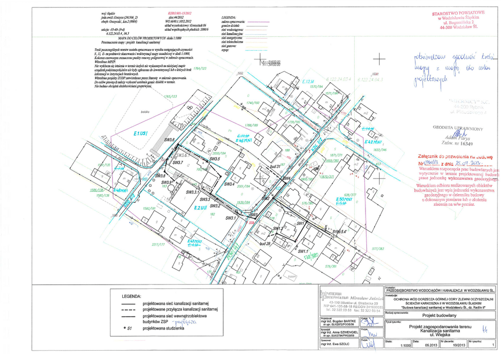 woj: śląskie jedn.ewid.:Gorzyce (241506 2) obręb: Gorzyczki km.2 (0004) STAROSTWO PO.MATOWE, W Wodzis ławiu ś laskim ul. Bogurni ń ska 2 44-300 Wod2ls ław śl. KFRG:801-15 2012 zlec:44/2012 WG.6640.1.1052.2012 układ wysokościowy: Kronsztadt 86 układ wspólrzędnych płaskich: 2000/6 sekcja: -5540- (9-d) 6.122.24.03.4, 04.3 MAPA DO CELÓW PROJEKTOWYCH skala NOW Przeznaczenie mapy : projekt kanalizacji sanitarnej Treść poszczególnych warstw zosta ła opracowana w wyniku nast ępujących czynno ści: S, U, E- na podstawie skanowania i wektoryzacji mapy zasadniczej w skali 1:1000, Kolorem czerwonym zaznaczono punkty osnowy poligonowej w zab-esie opracowania. Wla-eslono MPZP. Nie wyklucza si ę istnienia tv terenie inn.kb me wykazanych na niniejszej mapie urządzeń podziemnyckktóre nie bytyzg łoszone do inwentaryzacji lub o których brak f 764,7'123 informacji w instytucjach branżowych. IVID-eślono projekty ZbDP zatwierdzone przez Starost ę w mb-cale opracowania. Do celów prawnych należy wykona ć ustalenia granic dziatek w terenie. Nie badano obciążeń sluzebnościand uuntoni, LEGENDA: zakres opracowania: granice dziatek: sieć wodociągowa: sieć kanalizacyjna. Sieć energeczna: sieć teletechniczna sieć gazowa: mpzp: \X— 51600. oo 34100.00 6\--) (&)(£)-.1 icQ2 102$2 F:1 2,M 1570/194 ł ',V65/1.23 boisko QEODETA UP WINIONY EtUsf Ad W3.6 E 4 PIN/ ł M Pałys 7,a w. nr 6349 1622/346 1871/J71 Za łącznik d:-) pozwoiEnia nc.4iLw ę 1869/380 Nr k 3.8 • U/Ą 3 z elnic: 9j- 13( Warunkiem rozpocz ę cia prac budowlanych je!. wytyczenie w terenie projektowanej budo« przez jednostk ę wykonawstwa geodezyjnam ' -ii<V07,3 SW3.9 Warunkiem odbioru realizowanych obiektów budowlanych jest wpis jednostki wykonawstwa geodezyjnego w dzienniku budowy o dokonanym pomiarze lub o z łożeniu zleeenia na w/w pomiar. 15✓ 1586 <7 1585/138 SW3.3 E21111 SW3.2 SW3.1 .5.4' 2217/177 57/.58.5 579/381 kl basen Inwestor: PRZEDSI Ę BIORSTWO WODOCI ĄGÓW I KANALIZACJI W WODZIS ŁAWIU Ś L. 1"1_,YfFV.IEMH LEGENDA: ,747,5'0,514, '61 projektowana sie ć kanalizacji sanitarnej projektowane przyłącza kanalizacji sanitarnej Inwestycja: jc,..:,<?:,!?, OCHRONA WÓD DORZECZA GÓRNEJ ODRY ZLEWNI OCZYSZCZALNI Ś CIEKÓW KARKOSZKA II W WODZISŁAWIU Ś LĄSKIM "Budowa kanalizacji sanitarnej w Wodzisławiu 6i., dz. Radlin II" 43-190 Mikolów ul. Stra ż acka 29 MP 641-10(3-88-18 REGON 24160958.: 'tel. 32 392 03 53 fax: 32 322 03 54 Rodzaj opracowania: ==-0.0172.4.13177 S1 projektowana sie ć wewn ątrzobiektowa budynków ZSP G2C., projektował, mgr in ż . Bogdan BARTKE projektowana studzienka Sprawdził: Tytuł rysunku: nr upr. SLK/2872/POOS/09 Projekt zagospodarowania terenu Kanalizacja sanitarna ul. Wiejska Podpis; mgr inż . Anna SZWENGIEL nr upr. SLKi2784/PW0S/09 Opracował mgr inż . Ewa SZOLC Projekt budowlany P S: odpis : P , ,;\;-\łż ) Skala: Data: 1:1000 Nr zlecenia: 05.2013 10/2013 Nr rysunku: