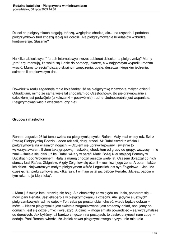 Rodzina katolicka - Pielgrzymka w minirozmiarze poniedziałek, 06 lipca 2009 14:36 Dzieci na pielgrzymkach biegają, tańczą, względnie chodzą, ale… na rzęsach. I podobno pielgrzymkowy trud znoszą lepiej niż dorośli. Ale pielgrzymowanie kilkulatków wzbudza kontrowersje. Słusznie? Na kilku „dzieciowych” forach internetowych wrze: zabierać dziecko na pielgrzymkę? Mamy „pro” argumentują, że wokół są ludzie do pomocy, lekarze, a w najgorszym wypadku można wrócić. Mamy „przeciw” piszą o skrajnym zmęczeniu, upale, deszczu i kiepskim jedzeniu, salmonelli po pierwszym dniu. Również w realu zagadnęła mnie koleżanka: iść na pielgrzymkę z czwórką małych dzieci? Odradziłam, mimo że sama wiele lat chodziłam do Częstochowy. Bo pielgrzymowanie z dzieckiem jest podwójnie (u koleżanki – poczwórnie) trudne. Jednocześnie jest wspaniałe. Pielgrzymować więc z dzieckiem, czy nie? Grupowa maskotka Renata Legucka 26 lat temu wzięła na pielgrzymkę synka Rafała. Mały miał wtedy rok. Szli z Praską Pielgrzymką Rodzin. Jeden rok szli, drugi, trzeci. Aż Rafał zszedł z wózka i pielgrzymował na własnych nogach. – Czułem się uprzywilejowany i świetnie to wykorzystywałem. Byłem taką grupową maskotką: chodziłem od grupy do grupy, wszyscy mnie znali – śmieje się, dziś już ks. Rafał, wikary w parafii Matki Bożej Nieustającej Pomocy w Duczkach pod Wołominem. Rafał z mamą chodzili jeszcze wiele lat. Czasem dołączał do nich starszy brat Rafała, Zbigniew. A gdy Zbigniew się ożenił – również i jego żona. A potem także ich dzieci. Najtwardszym małym pielgrzymem wśród Leguckich jest syn Zbigniewa – Jaś. Ma dziesięć lat, pielgrzymował już kilka razy. I w maju pytał już babcię Renatę: „Idziesz babciu w tym roku, to ja idę z tobą”. – Mam już swoje lata i troszkę się boję. Ale chociażby ze względu na Jasia, postaram się – mówi pani Renata. Jest ekspertką w pielgrzymowaniu z dziećmi. Ale „jedynie słusznych” pielgrzymkowych rad nie daje: – To trzeba po prostu lubić i chcieć, wtedy będzie dobrze – mówi. – Nasza pielgrzymka jest świetnie zorganizowana: jest smaczny obiad, nocujemy po domach, jest się gdzie umyć i wysuszyć. A dzieci – mogę śmiało powiedzieć – są wytrzymalsze od dorosłych. Jak byliśmy już bardzo zmęczeni na postojach, to Jasiek przynosił nam zupę! – dodaje. Pani Renata twierdzi, że Jasiek nawet pielgrzymkowego kryzysu nie miał (dla 1/3 Rodzina katolicka - Pielgrzymka w minirozmiarze poniedziałek, 06 lipca 2009 14:36 niewtajemniczonych: pojawia się po kilku dniach marszu i objawia słowami: „dalej nie idę”. W większości przypadków kończy się w Częstochowie). – Raz Jaśkowi noga spuchła. Mówię mu: „tata zabierze cię do domu”, a on w płacz, że nie chce. Wymoczyłam mu tę nogę w wodzie z solą. I następnego dnia pobiegł dalej. Maluchy dają rady „Pobiegł” to właściwe określenie, bo pielgrzymkowe dzieci najczęściej biegiem docierają na postój. – Ile się naskaczą, nahasają, nadrobią kilometrów – opowiada ks. prałat Zenon Majcher, współorganizator Praskiej Pielgrzymki Rodzin. – I nie narzekają tak jak dorośli. – Musimy stopować dzieci i nie pozwalamy na eksploatowanie sił – dopowiada ks. Rafał Legucki, który przez ostatnich kilka lat pielgrzymował już jako opiekun grupy Białej w Praskiej Pielgrzymce Rodzin. To chyba jedyna pielgrzymkowa grupa w Polsce, w której idą same dzieci. – Po pierwszym dniu marszu proponujemy dzieciom przejście do ich grupy – mówi ks. Majcher. – Dzieci idą pod opieką księży i kleryków z tzw. podejściem, mają własny program katechetyczny, dużo śpiewają. – To dobry pomysł: gdy szedłem jako dziecko, jeszcze nie było grupy Białej i dzieci szły razem z rodzicami. Teraz rodzice mają własne modlitwy, rozważania i konferencje, dzieci własne. Dostosowane do wieku i potrzeb – mówi ks. Rafał. Grupa Biała jest niewielka: to około 40 dzieci w wieku 6–14 lat. Zdarzają się i przedszkolaki. Gdy grupę obserwują przechodnie, nie mogą wyjść z podziwu: jak takie maluchy dają radę? Co zrobić, żeby dziecięca gromada, w miarę równo i spokojnie, przeszła kilkaset kilometrów? – My, opiekunowie, musimy iść tyłem, żeby mieć z dzieciakami kontakt wzrokowy. Dużo się bawimy, na przykład w grę w rodzaju poloneza: robimy szpaler z rąk i ostatnie dziecko przebiega pod nim do przodu. Bezpieczeństwo musi być! Gdy Boguś Kowalski szedł na swoją drugą pielgrzymkę, miał osiem lat. Szli z ojcem, szli, aż się mały zgubił. Gdy się odnalazł, ojciec – na osuszenie łez – dał mu 10 zł. – No i wykombinowałem, że jeśli znów się pogubię i dozbieram kilkadziesiąt złotych, to piłkę sobie kupię – wspomina ze śmiechem dorosły już ks. Bogusław, proboszcz parafii pw. św. Wincentego à Paulo w Otwocku. – Po trzecim, „kontrolowanym” zgubieniu, ojciec gubić mi się zakazał. Tyle sympatyczna anegdota. Ale żeby nie dopuścić do naprawdę trudnych i niebezpiecznych sytuacji, pielgrzymkowe służby porządkowe mają uszy i oczy szeroko otwarte. W grupach na bezpieczeństwo dzieci zwraca się szczególną uwagę: pilnują ich rodzice i inni pielgrzymi. – Nasza grupa jest specyficzna, bo dzieci idą samodzielnie, a z rodzicami spotykają się na postojach i podczas noclegu. Dbamy więc o nie wyjątkowo: musimy iść równo, zabezpieczamy lewą stronę kolumny, żeby żadnemu dziecku nie przyszło do głowy przejść na drugą stronę – mówi ks. Rafał Legucki. 2/3 Rodzina katolicka - Pielgrzymka w minirozmiarze poniedziałek, 06 lipca 2009 14:36 – Zawsze się nas pytali, jak to robimy, że idziemy z trójką dzieci i idziemy pierwsi. A dzieci nie wariują i nie stwarzają problemów – wspomina Jacek Niechoda, który z żoną Urszulą oraz dziećmi – Luizą, Blanką i Miłoszem chodzili 10 razy z Pi