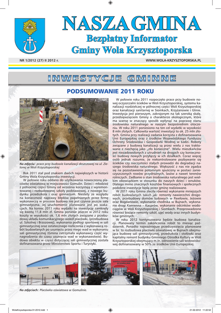 NASZA GMINA Bezpłatny Informator Gminy Wola Krzysztoporska NR 1/2012 (27) II 2012 r. WWW.WOLA-KRZYSZTOPORSKA.PL inwestycje gminne PODSUMOWANIE 2011 ROKU Na zdjęciu: prace przy budowie kanalizacji deszczowej na ul. Zielonej w Woli Krzysztoporskiej Rok 2011 stał pod znakiem dwóch największych w historii Gminy Wola Krzysztoporska inwestycji. W połowie roku oddano do użytkowania nowoczesną placówkę oświatową w miejscowości Gomulin. Dzieci i młodzież z północnej części Gminy od września korzystają z wyremontowanej i rozbudowanej szkoły podstawowej, z nowego budynku przedszkola i oraz gimnazjum. Niestety ze względu na konieczność naprawy błędów popełnionych przez firmę wykonawczą w procesie budowy nie jest czynna jeszcze sala gimnastyczna. Jej uruchomienie planowane jest po wakacjach. Na koniec 2011 roku wydatki na inwestycję zamknęły się kwotą 11,8 mln zł. Gmina poniesie jeszcze w 2012 roku koszty w wysokości ok. 1,6 mln złotych związane z przebudową układu komunikacyjnego wokół placówki, (przebudowa ul. Szkolnej i Brzozowej), wykonania podłogi sportowej w sali gimnastycznej oraz ostatecznego rozliczenia z wykonawcą robót budowlanych po usunięciu przez niego wad w wykonaniu sali gimnastycznej (Gmina zatrzymała wykonawcy część wynagrodzenia do czasu usunięcia wad w wykonawstwie). Budowa obiektu w części dotyczącej sali gimnastycznej została dofinansowana przez Ministerstwo Sportu i Turystyki. W połowie roku 2011 rozpoczęto prace przy budowie nowej oczyszczalni ścieków w Woli Krzysztoporskiej, systemu kanalizacji rozdzielczej w północnej części Woli Krzysztoporskiej oraz kanalizacji sanitarnej w Siomkach, Krzyżanowie i Glinie. Inwestycja jest pierwszym, zakrojonym na tak szeroką skalę, przedsięwzięciem Gminy o charakterze ekologicznym, które ma szansę w znaczący sposób wpłynąć na poprawę stanu środowiska naturalnego w naszym bezpośrednim otoczeniu. W roku 2011 poniesiono na ten cel wydatki w wysokości 8 mln złotych. Całkowita wartość inwestycji to ok. 25 mln złotych. Gmina przy realizacji zadania korzysta z dofinansowania Unii Europejskiej oraz z środków Wojewódzkiego Funduszu Ochrony Środowiska i Gospodarki Wodnej w Łodzi. Roboty związane z budową kanalizacji są przez wielu z nas traktowane z niechęcią jako „zło konieczne”. Wielu mieszkańców jest niezadowolonych z utrudnień na drogach czy konieczności budowy nowych przyłączy w ich działkach. Coraz więcej osób jednak rozumie, że niekontrolowane pozbywanie się ścieków czy nieczystości stałych prowadzi do degradacji naszego środowiska naturalnego. Większość z nas nie zgadza się na pozostawienie potomnym spuścizny w postaci zanieczyszczonych rowów przydrożnych, lasów a nawet terenów rolniczych. Zadbanie o stan środowiska naturalnego jest wielkim obowiązkiem w stosunku do naszych dzieci i wnuków. Dlatego mimo znacznych kosztów finansowych i społecznych podobne inwestycje będą przez gminę realizowane. W 2011 roku Gmina zleciła również wykonanie mniejszych robót budowlanych takich jak: remonty nawierzchni drogowych, przebudowy domów ludowych w Pawłowie, Jeżowie oraz Bogdanowie, wykonanie chodnika w Bujnach, wykonanie drogi Kamienna – Kacprów, wykonanie odcinków wodociągów w Woli Krzysztoporskiej i Siomkach. Przeprowadzono również bieżące remonty szkół, ujęć wody oraz innych budynków gminnych. W roku 2012 kontynuowana będzie budowa kanalizacji. Planowany termin zakończenia robót to miesiąc październik. Ponadto najważniejsze przedsięwzięcia planowane w br. to rozbudowa placówki oświatowej w Bujnach obejmująca budowę sali gimnastycznej, przedszkola i stołówki oraz kapitalny remont budynku Gminnego Ośrodka Kultury w Woli Krzysztoporskiej obejmujący m.in. odnowienie sali widowiskowej dofinansowany w 50% ze środków Unii Europejskiej. Na zdjęciach: Placówka oświatowa w Gomulinie. WolaKrzysztoporska 01-2012.indd 1 21-02-2012 11:22:52 informacje bieżące z obrad gminy XIV sesja Rady Gminy Wola Krzysztoporska odbyła się w dniu 25 listopada 2011 r. w Urzędzie Gminy Wola Krzysztoporska. Wójt Gminy złożył sprawozdanie z wykonania uchwał i z działalności między sesjami, z udziału w spotkaniach, naradach i imprezach okolicznościowych, przedstawił także wyniki kontroli przeprowadzonej w Zarządzie Nieruchomościami. Pytania radnych dotyczyły działalności Zespołu Interdyscyplinarnego a także corocznego spisu inwentaryzacyjnego w osiedlowej kotłowni. Sprawozdania z działalności przedstawiły następujące Komisje Rady Gminy: Komisja Rewizyjna (przedstawiła protokół z kontroli w zakresie zamówień publicznych), Komisja Zdrowia, Spraw Socjalnych i Porządku Publicznego, Komisja Samorządowa Oświaty, Kultury i Sportu, Komisja Budżetu, Finansów i Rozwoju Gospodarczego. Skarbnik Gminy omówił projekt uchwały Rady Gminy w sprawie zmiany budżetu i w budżecie gminy na rok 2011, który został zaopiniowany pozytywnie. Uchwała w tej sprawie została podjęta większością głosów. Skarbnik Gminy omówił ponadto projekt uchwały w sprawie zmiany Wieloletniej Prognozy Finansowej Gminy Wola Krzysztoporska na lata 2011 – 2025, ta uchwała również została podjęta większością głosów. Podjęto również uchwałę w sprawie obniżenia ceny skupu żyta dla celów wymiaru podatku rolnego na terenie gminy do kwoty 48,00 zł za 1 q. Omówiony został projekt uchwały w sprawie określenia wysokości stawek podatku od nieruchomości oraz wprowadzenia zwolnień. Komisja Budżetu, Finansów i Rozwoju Gospodarczego Rady Gminy wnioskowała o obniżenie podatku: od budynków lub ich części, pozostałych, w tym zajętych na prowadzenie odpłatnej statutowej działalności pożytku publicznego przez organizacje pożytku publicznego od 1 m² powierzchni - do kwoty 5,50 zł • podatku od gruntów pozostałych, w tym zajętych na prowadzenie odpłatnej statutowej działalno