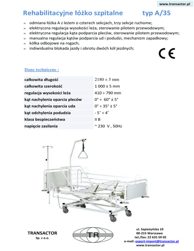 www.transactor.pl Rehabilitacyjne łóżko szpitalne • • • • • • typ A/3S odmiana łóżka A z leżem o czterech sekcjach, trzy sekcje ruchome; elektryczna regulacja wysokości leża, sterowanie pilotem przewodowym; elektryczna regulacja kąta podparcia pleców, sterowanie pilotem przewodowym; manualna regulacja kątów podparcia ud i podudzi, mechanizm zapadkowy; kółka odbojowe na rogach; indiwidualna blokada jazdy i obrotu dwóch kół jezdnych; Dane techniczne : całkowita długość 2180 ± 5 mm całkowita szerokość 1 000 ± 5 mm regulacja wysokości leża 410 ÷ 790 mm kąt nachylenia oparcia pleców 0° ÷ 60° ± 5° kąt nachylenia oparcia uda 0° ÷ 35° ± 5° kąt odchylenia podudzia - 5˚ ÷ 4˚ klasa bezpieczeństwa II B napięcie zasilania ~ 230 V , 50Hz TRANSACTOR Sp. z o.o. ul. Sapieżyńska 10 00-215 Warszawa tel./fax: 22 635 59 02 e-mail: [email protected] www.transactor.pl