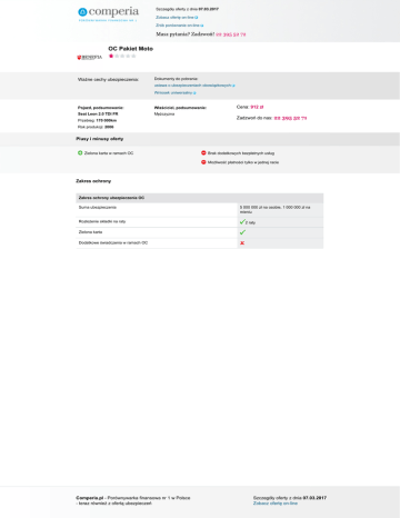 Szczegóły oferty z dnia 07.03.2017 Zobacz ofertę on-line Zrób porównanie on-line Masz pytania? Zadzwoń! 22 395 52 72 OC Pakiet Moto Ważne cechy ubezpieczenia: Dokumenty do pobrania: ustawa o ubezpieczeniach obowiązkowych Wniosek uniwersalny Pojazd, podsumowanie: Właściciel, podsumowanie: Seat Leon 2.0 TDI FR Mężczyzna Przebieg: 170 000km Cena: 912 zł Zadzwoń do nas: 22 395 52 71 Rok produkcji: 2006 Plusy i minusy oferty Zielona karta w ramach OC Brak dodatkowych bezpłatnych usług Możliwość płatności tylko w jednej racie Zakres ochrony Zakres ochrony ubezpieczenia OC Suma ubezpieczenia Rozłożenie składki na raty 5 000 000 zł na osobie, 1 000 000 zł na mieniu 2 raty Zielona karta Dodatkowe świadczenia w ramach OC Comperia.pl - Porównywarka finansowa nr 1 w Polsce - teraz również z ofertą ubezpieczeń Powered by TCPDF (www.tcpdf.org) Szczegóły oferty z dnia 07.03.2017 Zobacz ofertę on-line