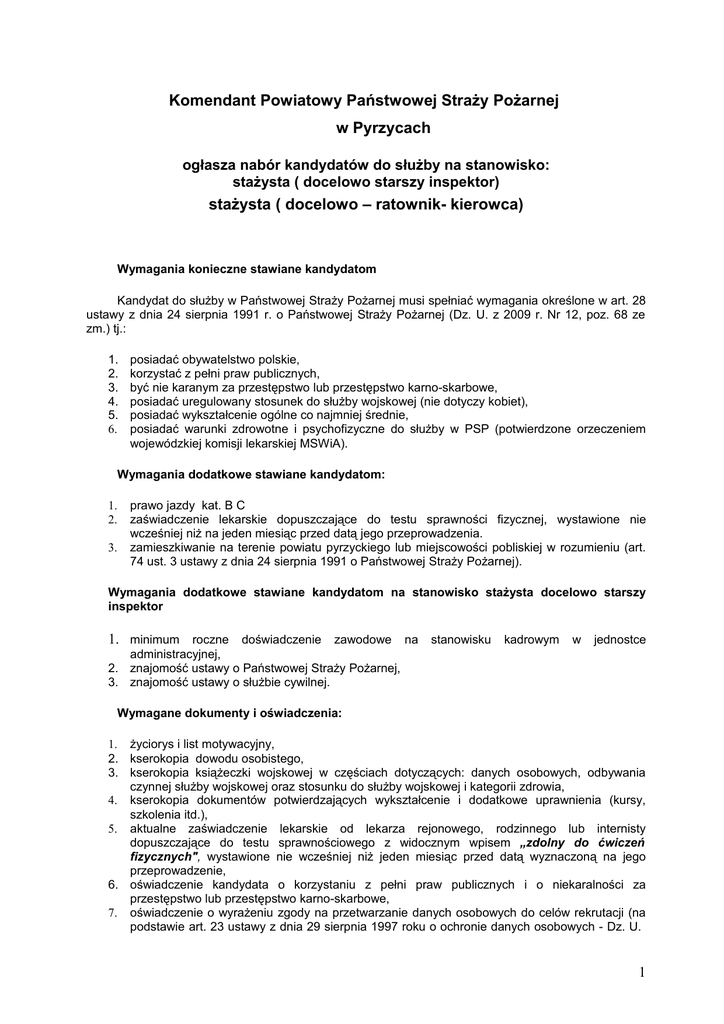 Komendant Powiatowy Państwowej Straży Pożarnej w Pyrzycach ogłasza nabór kandydatów do służby na stanowisko: stażysta ( docelowo starszy inspektor) stażysta ( docelowo – ratownik- kierowca) Wymagania konieczne stawiane kandydatom Kandydat do służby w Państwowej Straży Pożarnej musi spełniać wymagania określone w art. 28 ustawy z dnia 24 sierpnia 1991 r. o Państwowej Straży Pożarnej (Dz. U. z 2009 r. Nr 12, poz. 68 ze zm.) tj.: 1. 2. 3. 4. 5. 6. posiadać obywatelstwo polskie, korzystać z pełni praw publicznych, być nie karanym za przestępstwo lub przestępstwo karno-skarbowe, posiadać uregulowany stosunek do służby wojskowej (nie dotyczy kobiet), posiadać wykształcenie ogólne co najmniej średnie, posiadać warunki zdrowotne i psychofizyczne do służby w PSP (potwierdzone orzeczeniem wojewódzkiej komisji lekarskiej MSWiA). Wymagania dodatkowe stawiane kandydatom: 1. 2. 3. prawo jazdy kat. B C zaświadczenie lekarskie dopuszczające do testu sprawności fizycznej, wystawione nie wcześniej niż na jeden miesiąc przed datą jego przeprowadzenia. zamieszkiwanie na terenie powiatu pyrzyckiego lub miejscowości pobliskiej w rozumieniu (art. 74 ust. 3 ustawy z dnia 24 sierpnia 1991 o Państwowej Straży Pożarnej). Wymagania dodatkowe stawiane kandydatom na stanowisko stażysta docelowo starszy inspektor 1. minimum roczne doświadczenie zawodowe na stanowisku kadrowym w jednostce administracyjnej, 2. znajomość ustawy o Państwowej Straży Pożarnej, 3. znajomość ustawy o służbie cywilnej. Wymagane dokumenty i oświadczenia: 1. życiorys i list motywacyjny, 2. kserokopia dowodu osobistego, 3. kserokopia książeczki wojskowej w częściach dotyczących: danych osobowych, odbywania czynnej służby wojskowej oraz stosunku do służby wojskowej i kategorii zdrowia, 4. kserokopia dokumentów potwierdzających wykształcenie i dodatkowe uprawnienia (kursy, szkolenia itd.), 5. aktualne zaświadczenie lekarskie od lekarza rejonowego, rodzinnego lub internisty dopuszczające do testu sprawnościowego z widocznym wpisem „zdolny do ćwiczeń fizycznych", wystawione nie wcześniej niż jeden miesiąc przed datą wyznaczoną na jego przeprowadzenie, 6. oświadczenie kandydata o korzystaniu z pełni praw publicznych i o niekaralności za przestępstwo lub przestępstwo karno-skarbowe, 7. oświadczenie o wyrażeniu zgody na przetwarzanie danych osobowych do celów rekrutacji (na podstawie art. 23 ustawy z dnia 29 sierpnia 1997 roku o ochronie danych osobowych - Dz. U. 1 z 2002 r. Nr 101, poz.926 ze zm.) o treści „wyrażam zgodę na przetwarzanie moich danych osobowych do celów związanych z rekrutacją”. 8. ankieta kandydata do służby. Dokumenty wymienione w punktach 1 , 6 , 7 , 8 powinny być własnoręcznie podpisane. Zainteresowani proszeni są o składanie wyżej wymienionych dokumentów w terminie do 28.07.2010 r. do godziny 15:30 w sekretariacie Komendy osobiście lub drogą pocztową na adres: Komenda Powiatowa Państwowej Straży Pożarnej w Pyrzycach ul. Stargardzka 29 74-200 Pyrzyce REKRUTACJA I POSTĘPOWANIE Rekrutację prowadzić będzie Komisja Kwalifikacyjna, powołana przez Komendanta Powiatowego PSP w Pyrzycach, która zweryfikuje zgodność złożonych ofert ze stawianymi wymaganiami, dokona oceny złożonych dokumentów za pomocą punktów gratyfikacyjnych, podda kandydatów ocenie sprawności fizycznej oraz przeprowadzi rozmowę kwalifikacyjną z kandydatami. Rekrutacja ma charakter 5 etapowy: I etap postępowania kwalifikacyjnego: weryfikacja złożonych ofert pod kątem stawianych wymagań oraz dokonanie oceny złożonych dokumentów za pomocą punktów gratyfikacyjnych. Z dalszego postępowania zostaną wyłączeni kandydaci, których oferty nie będą spełniały stawianych wymagań formalnych lub będą niekompletne. Wyniki kwalifikacji wstępnej zostaną opublikowane na stronie internetowej oraz tablicy ogłoszeń w siedzibie Komendy Powiatowej w terminie do 02 sierpnia 2010 r. Oferty o pracę rozstrzygnięte negatywnie nie będą zwracane i zostaną komisyjnie zniszczone. Punktacja gratyfikująca posiadane uprawnienia i umiejętności jest następująca: Preferowane wymagania Liczba punktów Uprawnienia w zakresie prowadzenia pojazdów mechanicznych: - prawo jazdy kat. CE Uprawnienia do obsługi sprzętu silnikowego i poddozorowego stosowanego w PSP: 5 - uprawnienia do obsługi zbiorników ciśnieniowych 2 uprawnienia do obsługi agregatów prądotwórczych 4 2 Kwalifikacje w zawodzie ratownik medyczny 5 Kwalifikacje i uprawnienia w zakresie ratownictwa wodnego, nurkowania i obsługi sprzętu pływającego: - ratownik WOPR 2 - sternik motorowodny, stermotorzysta 4 Wyszkolenie pożarnicze oraz staż w jednostkach ochrony przeciwpożarowej: - udokumentowane członkostwo w OSP członka czynnego powyżej 3 lat 3 - udokumentowane szkolenia wg wymagań dla czynnych członków OSP 3 kurs kwalifikacyjny szeregowych PSP lub równoważny 5 - kurs kwalifikacyjny podoficerów PSP lub równoważny 5 Poziom i profil wykształcenia - wykształcenie średnie techniczne: energetyczne, elektryczne, mechaniczne, chemiczne, samochodowe 3 wykształcenie wyższe o kierunku przydatnym w PSP – energetyczne, elektryczne, mechaniczne, chemiczne, samochodowe, ratownictwo - medyczne 4 Za dodatkowe uprawnienia kandydat może otrzymać maksymalnie 20 pkt. II etap postępowania kwalifikacyjnego: poddanie kandydatów ocenie sprawności fizycznej obejmującej: 1. próbę wydolnościową, 2. test sprawności fizycznej, 3. próbę akrofobii – wejście na drabinę mechaniczną. Do oceny sprawności fizycznej przystąpią kandydaci zakwalifikowani w I etapie. Kandydat przystępujący do oceny sprawności fizycznej powinien posiadać dowód osobisty, strój i obuwie sportowe. Ocena sprawności fizycznej przeprowadzona zostanie zgodnie z Rozporządzeniem Ministra Spraw Wewnętrznych i Administracji z dnia 27 października 2005 r. w sprawie zakresu, trybu i częstot