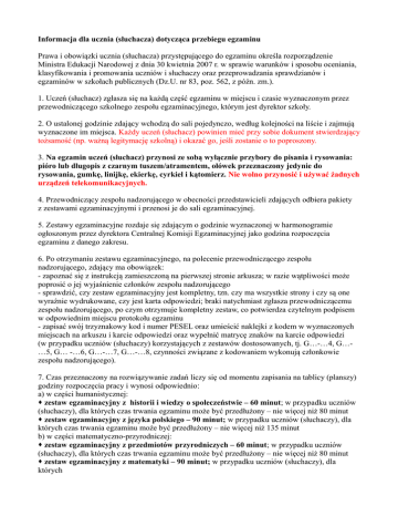 Informacja dla ucznia (słuchacza) dotycząca przebiegu egzaminu Prawa i obowiązki ucznia (słuchacza) przystępującego do egzaminu określa rozporządzenie Ministra Edukacji Narodowej z dnia 30 kwietnia 2007 r. w sprawie warunków i sposobu oceniania, klasyfikowania i promowania uczniów i słuchaczy oraz przeprowadzania sprawdzianów i egzaminów w szkołach publicznych (Dz.U. nr 83, poz. 562, z późn. zm.). 1. Uczeń (słuchacz) zgłasza się na każdą część egzaminu w miejscu i czasie wyznaczonym przez przewodniczącego szkolnego zespołu egzaminacyjnego, którym jest dyrektor szkoły. 2. O ustalonej godzinie zdający wchodzą do sali pojedynczo, według kolejności na liście i zajmują wyznaczone im miejsca. Każdy uczeń (słuchacz) powinien mieć przy sobie dokument stwierdzający tożsamość (np. ważną legitymację szkolną) i okazać go, jeśli zostanie o to poproszony. 3. Na egzamin uczeń (słuchacz) przynosi ze sobą wyłącznie przybory do pisania i rysowania: pióro lub długopis z czarnym tuszem/atramentem, ołówek przeznaczony jedynie do rysowania, gumkę, linijkę, ekierkę, cyrkiel i kątomierz. Nie wolno przynosić i używać żadnych urządzeń telekomunikacyjnych. 4. Przewodniczący zespołu nadzorującego w obecności przedstawicieli zdających odbiera pakiety z zestawami egzaminacyjnymi i przenosi je do sali egzaminacyjnej. 5. Zestawy egzaminacyjne rozdaje się zdającym o godzinie wyznaczonej w harmonogramie ogłoszonym przez dyrektora Centralnej Komisji Egzaminacyjnej jako godzina rozpoczęcia egzaminu z danego zakresu. 6. Po otrzymaniu zestawu egzaminacyjnego, na polecenie przewodniczącego zespołu nadzorującego, zdający ma obowiązek: - zapoznać się z instrukcją zamieszczoną na pierwszej stronie arkusza; w razie wątpliwości może poprosić o jej wyjaśnienie członków zespołu nadzorującego - sprawdzić, czy zestaw egzaminacyjny jest kompletny, tzn. czy ma wszystkie strony i czy są one wyraźnie wydrukowane, czy jest karta odpowiedzi; braki natychmiast zgłasza przewodniczącemu zespołu nadzorującego, po czym otrzymuje kompletny zestaw, co potwierdza czytelnym podpisem w odpowiednim miejscu protokołu egzaminu - zapisać swój trzyznakowy kod i numer PESEL oraz umieścić naklejki z kodem w wyznaczonych miejscach na arkuszu i karcie odpowiedzi oraz wypełnić matrycę znaków na karcie odpowiedzi (w przypadku uczniów (słuchaczy) korzystających z zestawów dostosowanych, tj. G…-…4, G……5, G… -…6, G…-…7, G…-…8, czynności związane z kodowaniem wykonują członkowie zespołu nadzorującego). 7. Czas przeznaczony na rozwiązywanie zadań liczy się od momentu zapisania na tablicy (planszy) godziny rozpoczęcia pracy i wynosi odpowiednio: a) w części humanistycznej: zestaw egzaminacyjny z historii i wiedzy o społeczeństwie – 60 minut; w przypadku uczniów (słuchaczy), dla których czas trwania egzaminu może być przedłużony – nie więcej niż 80 minut zestaw egzaminacyjny z języka polskiego – 90 minut; w przypadku uczniów (słuchaczy), dla których czas trwania egzaminu może być przedłużony – nie więcej niż 135 minut b) w części matematyczno-przyrodniczej: zestaw egzaminacyjny z przedmiotów przyrodniczych – 60 minut; w przypadku uczniów (słuchaczy), dla których czas trwania egzaminu może być przedłużony – nie więcej niż 80 minut zestaw egzaminacyjny z matematyki – 90 minut; w przypadku uczniów (słuchaczy), dla których czas trwania egzaminu może być przedłużony – nie więcej niż 135 minut c) w części z języka obcego nowożytnego: zestaw egzaminacyjny na poziomie podstawowym – 60 minut; w przypadku uczniów (słuchaczy), dla których czas trwania egzaminu może być przedłużony – nie więcej niż 80 minut zestaw egzaminacyjny na poziomie rozszerzonym – 60 minut; w przypadku uczniów (słuchaczy), dla których czas trwania egzaminu może być przedłużony – nie więcej niż 90 minut. 8. Przewodniczący zespołu nadzorującego zapisuje na tablicy (planszy), w miejscu widocznym dla każdego zdającego, czas rozpoczęcia i zakończenia rozwiązywania zadań. W przypadku egzaminu z języka obcego nowożytnego bezpośrednio po zapisaniu czasu rozpoczęcia i zakończenia rozwiązywania zadań odtworzone zostaje nagranie z płyty CD. 9. Zdający rozwiązuje zadania i zapisuje odpowiedzi w wyznaczonych miejscach wyłącznie długopisem lub piórem z czarnym tuszem/atramentem (tylko rysunki wykonuje ołówkiem). 10. Zdający zaznacza odpowiedzi do zadań zamkniętych na karcie odpowiedzi (nie dotyczy uczniów (słuchaczy) niewidomych, słabowidzących, niesłyszących i słabosłyszących, z upośledzeniem umysłowym w stopniu lekkim, niesprawnych ruchowo oraz uczniów ze specyficznymi trudnościami w uczeniu się). 11. W czasie pracy z zestawem egzaminacyjnym zdający pracuje samodzielnie i nie zakłóca przebiegu egzaminu, a w szczególności: a) nie opuszcza sali egzaminacyjnej (tylko w szczególnie uzasadnionej sytuacji może opuścić salę po uzyskaniu pozwolenia przewodniczącego zespołu nadzorującego i przy zachowaniu warunków uniemożliwiających kontaktowanie się zdającego z innymi osobami, z wyjątkiem konieczności skorzystania z pomocy medycznej) b) nie opuszcza wyznaczonego mu w sali miejsca c) w żadnej formie nie porozumiewa się z innymi zdającymi d) nie wypowiada uwag i komentarzy e) nie zadaje żadnych pytań dotyczących zadań egzaminacyjnych. 12. W przypadku - stwierdzenia niesamodzielnego rozwiązywania zadań egzaminacyjnych przez ucznia (słuchacza) - wniesienia przez ucznia (słuchacza) do sali egzaminacyjnej urządzenia telekomunikacyjnego albo korzystania przez ucznia (słuchacza) z urządzenia telekomunikacyjnego w sali egzaminacyjnej - zakłócania przez ucznia (słuchacza) prawidłowego przebiegu egzaminu w sposób utrudniający pracę pozostałym uczniom (słuchaczom) przewodniczący szkolnego zespołu egzaminacyjnego przerywa 