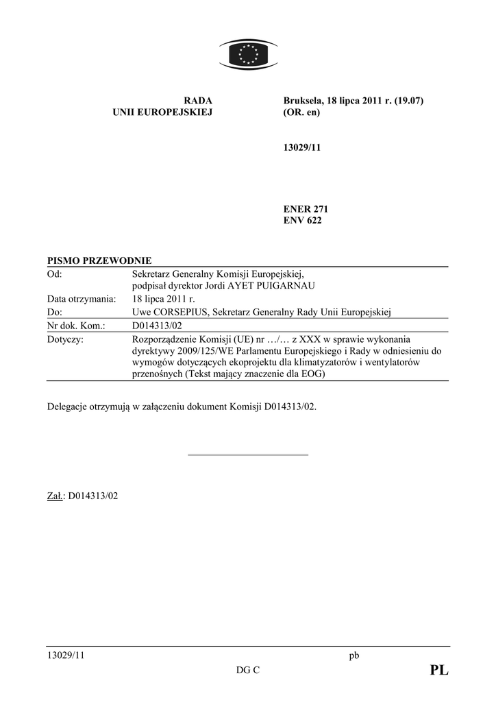 RADA UNII EUROPEJSKIEJ Bruksela, 18 lipca 2011 r. (19.07) (OR. en) 13029/11 ENER 271 ENV 622 PISMO PRZEWODNIE Od: Sekretarz Generalny Komisji Europejskiej, podpisał dyrektor Jordi AYET PUIGARNAU Data otrzymania: 18 lipca 2011 r. Do: Uwe CORSEPIUS, Sekretarz Generalny Rady Unii Europejskiej Nr dok. Kom.: D014313/02 Dotyczy: Rozporządzenie Komisji (UE) nr …/… z XXX w sprawie wykonania dyrektywy 2009/125/WE Parlamentu Europejskiego i Rady w odniesieniu do wymogów dotyczących ekoprojektu dla klimatyzatorów i wentylatorów przenośnych (Tekst mający znaczenie dla EOG) Delegacje otrzymują w załączeniu dokument Komisji D014313/02. Zał.: D014313/02 13029/11 pb DG C PL KOMISJA EUROPEJSKA Bruksela, dnia XXX […](2011) XXX wersja ostateczna ROZPORZĄDZENIE KOMISJI (UE) nr …/… z XXX w sprawie wykonania dyrektywy 2009/125/WE Parlamentu Europejskiego i Rady w odniesieniu do wymogów dotyczących ekoprojektu dla klimatyzatorów i wentylatorów przenośnych (Tekst mający znaczenie dla EOG) PL PL D014313/02 ROZPORZĄDZENIE KOMISJI (UE) nr …/… z XXX w sprawie wykonania dyrektywy 2009/125/WE Parlamentu Europejskiego i Rady w odniesieniu do wymogów dotyczących ekoprojektu dla klimatyzatorów i wentylatorów przenośnych (Tekst mający znaczenie dla EOG) KOMISJA EUROPEJSKA, uwzględniając Traktat o funkcjonowaniu Unii Europejskiej, uwzględniając dyrektywę Parlamentu Europejskiego i Rady 2009/125/WE z dnia 21 października 2009 r. ustanawiającą ogólne zasady ustalania wymogów dotyczących ekoprojektu dla produktów związanych z energią1, w szczególności jej art. 15 ust. 1, po konsultacji z Forum Konsultacyjnym ds. Ekoprojektu, a także mając na uwadze, co następuje: PL (1) Zgodnie z dyrektywą 2009/125/WE wymogi dotyczące ekoprojektu powinny być określane przez Komisję dla produktów związanych z energią, których wielkość sprzedaży we Wspólnocie jest znacząca, które mają znaczące oddziaływanie na środowisko naturalne i które wykazują znaczący potencjał w zakresie poprawy ich oddziaływania na środowisko poprzez odpowiednie zaprojektowanie, bez powodowania nadmiernych kosztów. (2) Artykuł 16 ust. 2 lit. a) dyrektywy 2009/125/WE stanowi, że zgodnie z procedurą określoną w art. 19 ust. 3 i z uwzględnieniem kryteriów określonych w art. 15 ust. 2 oraz po konsultacji z Forum Konsultacyjnym ds. Ekoprojektu Komisja wprowadza odpowiednio środki wykonawcze dla produktów posiadających duży potencjał redukcji emisji gazów cieplarnianych w sposób oszczędny, takich jak produkty należące do systemów ogrzewania, wentylacji i klimatyzacji. (3) Służby Komisji wykonały badanie przygotowawcze w celu dokonania analizy aspektów technicznych, środowiskowych i ekonomicznych dotyczących klimatyzatorów i wentylatorów przenośnych, które są zwykle używane w gospodarstwach domowych i niewielkich placówkach handlowych. Badanie przeprowadzono przy udziale zainteresowanych stron z UE i państw trzecich, a jego wyniki zostały podane do publicznej wiadomości. 1 Dz.U. L 285 z 31.10.2009, s. 10. 1 PL (4) Podstawowe aspekty środowiskowe produktów objętych rozporządzeniem, określone jako istotne dla celów niniejszego rozporządzenia, to: zużycie energii w fazie użytkowania i poziom mocy akustycznej. W badaniu przygotowawczym określono również potencjalny wyciek czynnika chłodniczego jako istotny aspekt środowiskowy w postaci bezpośrednich emisji gazów cieplarnianych, stanowiący średnio 10-20 % bezpośrednich i pośrednich emisji gazów cieplarnianych. (5) Jak wskazano w badaniu przygotowawczym i potwierdzono w trakcie oceny skutków, brakuje informacji o efektywności wentylatorów przenośnych. Jednakże w celu zapewnienia istotnych informacji organom nadzoru rynku i umożliwienia skutecznego monitorowania rynku na potrzeby ustalenia minimalnych wymogów w zakresie efektywności energetycznej w przyszłości, wymogi określone dla wentylatorów przenośnych, a dotyczące informacji o produkcie, nakazywać będą umieszczenie w widocznym miejscu na produkcie informacji o efektywności produktu i o metodzie jej pomiaru. Określono ponadto wymogi dotyczące trybów czuwania i wyłączenia dla wentylatorów przenośnych. (6) Oszacowano, iż roczne zużycie energii elektrycznej przez produkty, których dotyczy niniejsze rozporządzenie, wyniosło w UE 30 TWh w 2005 r. Przewiduje się, że jeżeli nie zostaną podjęte żadne szczególne środki, roczne zużycie energii wzrośnie w 2020 r. do 74 TWh. Z przeprowadzonego badania przygotowawczego wynika, że zużycie energii elektrycznej przez produkty, których dotyczy niniejsze rozporządzenie, można znacznie zmniejszyć. (7) Badanie przygotowawcze wykazało, że spełnienie wymogów dotyczących innych parametrów ekoprojektu, o których mowa w części 1 załącznika I do dyrektywy 2009/125/WE, nie jest konieczne, jako że zużycie energii elektrycznej i poziom mocy akustycznej w fazie użytkowania stanowią najistotniejsze aspekty środowiskowe. (8) Ponieważ czynniki chłodnicze zostały uwzględnione w ramach rozporządzenia (WE) 842/2006 Parlamentu Europejskiego i Rady z dnia 17 maja 2006 r. w sprawie niektórych fluorowanych gazów cieplarnianych2, w niniejszym rozporządzeniu nie określono żadnych specjalnych wymogów dotyczących czynników chłodniczych. W ramach wymogów dotyczących ekoprojektu proponuje się premię w celu ukierunkowania rynku na wykorzystanie czynników chłodniczych o mniejszej uciążliwości oddziaływania. Premia będzie skutkowała obniżeniem minimalnych wymogów dotyczących efektywności energetycznej dla urządzeń, w których stosuje się czynniki chłodnicze o niskim współczynniku ocieplenia globalnego. (9) Klimatyzatory mogą stanowić część systemów instalowanych w budynkach. W przepisach krajowych opierających się między innymi na dyrektywie w sprawie charakterystyki energetycznej budynków (2010/31/UE wersja przekształcona)3 można 