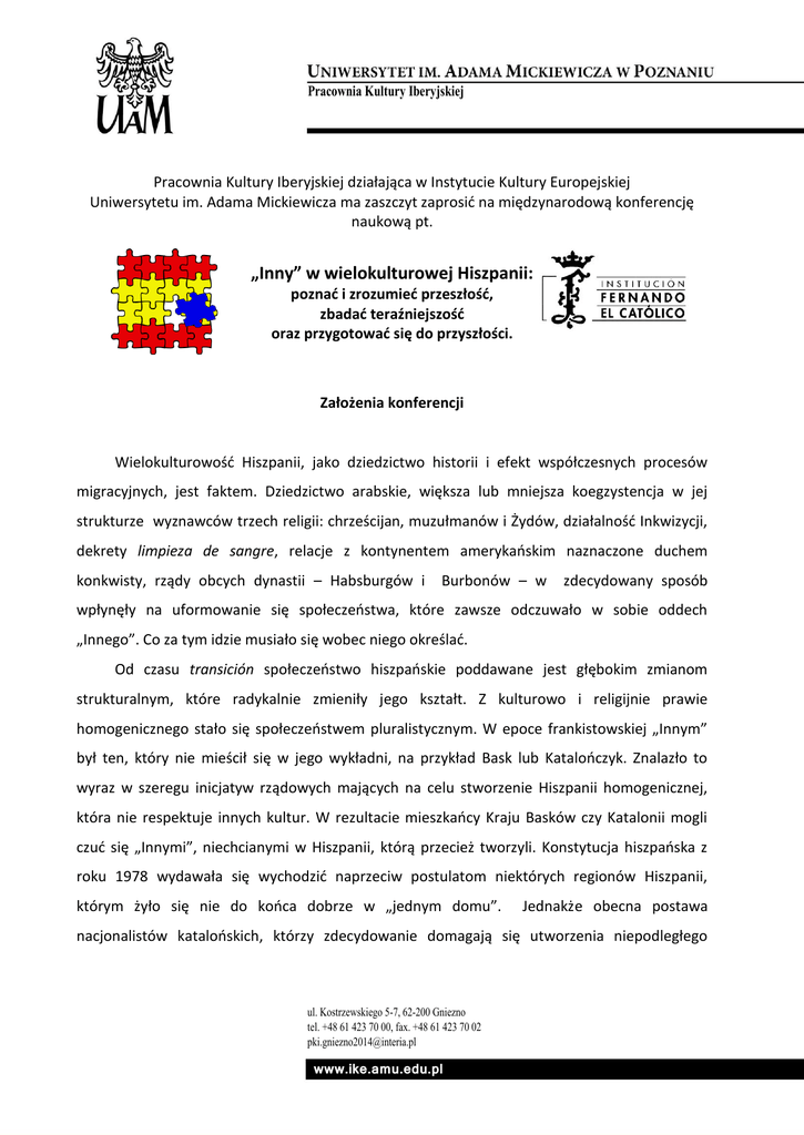 Pracownia Kultury Iberyjskiej Pracownia Kultury Iberyjskiej działająca w Instytucie Kultury Europejskiej Uniwersytetu im. Adama Mickiewicza ma zaszczyt zaprosić na międzynarodową konferencję naukową pt. „Inny” w wielokulturowej Hiszpanii: poznać i zrozumieć przeszłość, zbadać teraźniejszość oraz przygotować się do przyszłości. Założenia konferencji Wielokulturowość Hiszpanii, jako dziedzictwo historii i efekt współczesnych procesów migracyjnych, jest faktem. Dziedzictwo arabskie, większa lub mniejsza koegzystencja w jej strukturze wyznawców trzech religii: chrześcijan, muzułmanów i Żydów, działalność Inkwizycji, dekrety limpieza de sangre, relacje z kontynentem amerykańskim naznaczone duchem konkwisty, rządy obcych dynastii – Habsburgów i Burbonów – w zdecydowany sposób wpłynęły na uformowanie się społeczeństwa, które zawsze odczuwało w sobie oddech „Innego”. Co za tym idzie musiało się wobec niego określać. Od czasu transición społeczeństwo hiszpańskie poddawane jest głębokim zmianom strukturalnym, które radykalnie zmieniły jego kształt. Z kulturowo i religijnie prawie homogenicznego stało się społeczeństwem pluralistycznym. W epoce frankistowskiej „Innym” był ten, który nie mieścił się w jego wykładni, na przykład Bask lub Katalończyk. Znalazło to wyraz w szeregu inicjatyw rządowych mających na celu stworzenie Hiszpanii homogenicznej, która nie respektuje innych kultur. W rezultacie mieszkańcy Kraju Basków czy Katalonii mogli czuć się „Innymi”, niechcianymi w Hiszpanii, którą przecież tworzyli. Konstytucja hiszpańska z roku 1978 wydawała się wychodzić naprzeciw postulatom niektórych regionów Hiszpanii, którym żyło się nie do końca dobrze w „jednym domu”. Jednakże obecna postawa nacjonalistów katalońskich, którzy zdecydowanie domagają się utworzenia niepodległego ul. Kostrzewskiego 5-7, 62-200 Gniezno tel. +48 61 423 70 00, fax. +48 61 423 70 02 [email protected] www.ike.amu.edu.pl Pracownia Kultury Iberyjskiej państwa katalońskiego jasno pokazuje, że niektórzy Katalończycy ciągle czują się „Innymi” w wielokulturowej Hiszpanii. Zmiany, jakie miały miejsce w Hiszpanii od lat 90. ubiegłego wieku, zwłaszcza rozwój modelu neoliberalnego w sposób zasadniczy zdeterminowały społeczne, ekonomiczne, polityczne i kulturowe implikacje współczesnych migracji w Hiszpanii. Dotyczy to również kierunków migracji: do grupy imigrantów z krajów Ameryki Łacińskiej, dołączyli przybysze z innych regionów, zwłaszcza z Afryki i Europy Wschodniej. Dla państwa akceptującego wielokulturowość kluczowa stała się tolerancja „Innego”, jako wartość zapewniająca funkcjonowanie społeczeństwa bez większych konfliktów. Znalazło to wyraz w dyskursie politycznym państwa i szeregu rządowych inicjatywach programowych. Wydarzenia ostatnich lat wyraźnie pokazują, że Hiszpania stanowi dla wielu imigrantów idealne miejsce do życia. Codziennie informacje telewizyjne przekazujące dramatyczne relacje o tym, jak kolejne fale imigrantów z krajów afrykańskich próbują przedostać się przez Ceutę na hiszpańską ziemię tylko to potwierdzają. Można zaryzykować stwierdzenie, że Hiszpania jest dla nich swego rodzaju rajem, takim jakim kiedyś dla żeglarzy z wypraw Kolumba była Ameryka, do której dopłynęli. Ale, czy w tak rozumianej wielokulturowości chodzi o rzeczywistą integrację „Innego” czy raczej o kontrolę i włączenie go w rynek, co pokazał obecny kryzys? Czy ostatnie deklaracje rządowe w sprawie przyznania wygnanym przez Królów Katolickich Żydom obywatelstwa Hiszpanii bez konieczności wyrzekania się przez nich obywatelstwa izraelskiego, należy odczytywać jako reakcję na kryzys czy jako gest zadośćuczynienia po 500 latach? Czy współczesna Hiszpania jest przestrzenią zapewniającą sprawiedliwe relacje z innością, czy raczej zwykłą „kolekcję” kultur z nowymi formami oficjalnego dyskursu? Czy wielokulturowość hiszpańską należy postrzegać w symetrycznych relacjach między odmiennymi kulturami, czy raczej w optyce działania dominującej kultury „narodowej”? Odpowiedź na te i inne pytania wymaga spojrzenia interdyscyplinarnego, stąd konferencja adresowana jest do antropologów, kulturoznawców, historyków, politologów, socjologów, pedagogów i prawników zainteresowanych Hiszpanią. Analiza hiszpańskiego ul. Kostrzewskiego 5-7, 62-200 Gniezno tel. +48 61 423 70 00, fax. +48 61 423 70 02 [email protected] www.ike.amu.edu.pl Pracownia Kultury Iberyjskiej przykładu może dostarczyć interesujących wniosków dla krytycznej refleksji nad modelem wielokulturowości w wymiarze globalnym. dr Filip Kubiaczyk Kierownik Pracowni Kultury Iberyjskiej Patronat honorowy: Institución „Fernando el Católico”, Saragossa (Hiszpania) Sekretarz konferencji: dr Emilia Twarowska-Antczak Kontakt elektroniczny: [email protected] *** Termin konferencji: 3-4 grudnia 2014 roku Organizatorzy konferencji zastrzegają sobie prawo wyboru 25 najlepszych zgłoszeń, których tematyka najpełniej wpisywać się będzie w założenia programowe konferencji. Uczestnicy konferencji mają zapewnioną publikację tekstów pokonferencyjnych w ramach serii wydawniczej Studia Europaea Gnesnensia http://steurgn.pl/ (w odrębnej monografii lub w czasopiśmie naukowym - 7 punktów na ministerialnej liście czasopism punktowanych). Warunkiem publikacji będzie uzyskanie pozytywnej recenzji wydawniczej. ul. Kostrzewskiego 5-7, 62-200 Gniezno tel. +48 61 423 70 00, fax. +48 61 423 70 02 [email protected] www.ike.amu.edu.pl