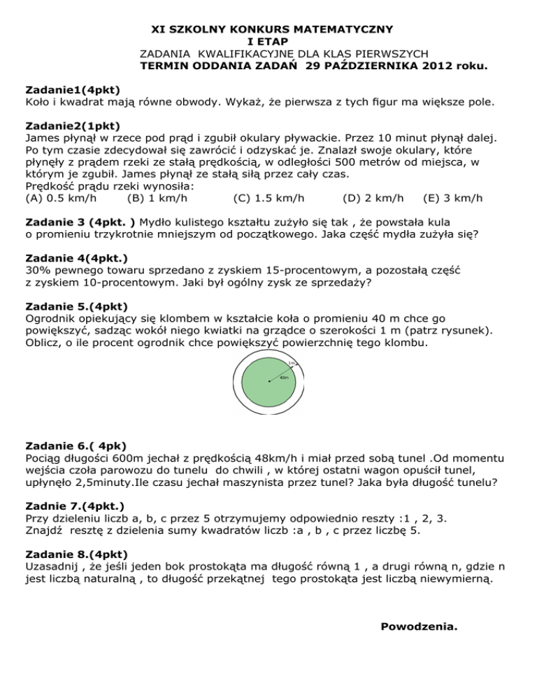XI SZKOLNY KONKURS MATEMATYCZNY I ETAP ZADANIA KWALIFIKACYJNE DLA KLAS PIERWSZYCH TERMIN ODDANIA ZADAŃ 29 PAŹDZIERNIKA 2012 roku. Zadanie1(4pkt) Koło i kwadrat mają równe obwody. Wykaż, że pierwsza z tych figur ma większe pole. Zadanie2(1pkt) James płynął w rzece pod prąd i zgubił okulary pływackie. Przez 10 minut płynął dalej. Po tym czasie zdecydował się zawrócić i odzyskać je. Znalazł swoje okulary, które płynęły z prądem rzeki ze stałą prędkością, w odległości 500 metrów od miejsca, w którym je zgubił. James płynął ze stałą siłą przez cały czas. Prędkość prądu rzeki wynosiła: (A) 0.5 km/h (B) 1 km/h (C) 1.5 km/h (D) 2 km/h (E) 3 km/h Zadanie 3 (4pkt. ) Mydło kulistego kształtu zużyło się tak , że powstała kula o promieniu trzykrotnie mniejszym od początkowego. Jaka część mydła zużyła się? Zadanie 4(4pkt.) 30% pewnego towaru sprzedano z zyskiem 15-procentowym, a pozostałą część z zyskiem 10-procentowym. Jaki był ogólny zysk ze sprzedaży? Zadanie 5.(4pkt) Ogrodnik opiekujący się klombem w kształcie koła o promieniu 40 m chce go powiększyć, sadząc wokół niego kwiatki na grządce o szerokości 1 m (patrz rysunek). Oblicz, o ile procent ogrodnik chce powiększyć powierzchnię tego klombu. Zadanie 6.( 4pk) Pociąg długości 600m jechał z prędkością 48km/h i miał przed sobą tunel .Od momentu wejścia czoła parowozu do tunelu do chwili , w której ostatni wagon opuścił tunel, upłynęło 2,5minuty.Ile czasu jechał maszynista przez tunel? Jaka była długość tunelu? Zadnie 7.(4pkt.) Przy dzieleniu liczb a, b, c przez 5 otrzymujemy odpowiednio reszty :1 , 2, 3. Znajdź resztę z dzielenia sumy kwadratów liczb :a , b , c przez liczbę 5. Zadanie 8.(4pkt) Uzasadnij , że jeśli jeden bok prostokąta ma długość równą 1 , a drugi równą n, gdzie n jest liczbą naturalną , to długość przekątnej tego prostokąta jest liczbą niewymierną. Powodzenia.