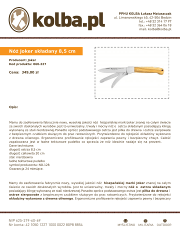 Nóż Joker składany 8,5 cm Producent: Joker Kod produktu: 060-227 Cena: 349,00 zł Opis: Mamy do zaoferowania fabrycznie nowy, wysokiej jakości nóż hiszpańskiej marki Joker znanej na całym świecie ze swoich doskonałych wyrobów. Jest to uniwersalny, trwały i mocny nóż o ostrzu składanym posiadający klingę wykonaną ze stali nierdzewnej.Ponadto oprócz podstawowego ostrza jest piłka do drewna i ostrze sierpowate z bezpiecznym czubkiem służącym do prac ratowniczych. Przytwierdzone do rękojeści okładziny wykonano z drewna oliwnego. Ergonomiczne profilowanie rękojeści zapewnia pewny i bezpieczny chwyt. Całość zapakowana jest w ładne tekturowe pudełko co sprawia że nóż idealnie nadaje się na prezent. Dane techniczne: długość ostrza 8,5 cm długość całkowita 20 cm stal: nierdzewna ładne tekturowe pudełko symbol producenta: NO-128 Gwarancja 24 miesiące. Mamy do zaoferowania fabrycznie nowy, wysokiej jakości nóż hiszpańskiej marki Joker znanej na całym świecie ze swoich doskonałych wyrobów. Jest to uniwersalny, trwały i mocny nóż o ostrzu składanym posiadający klingę wykonaną ze stali nierdzewnej.Ponadto oprócz podstawowego ostrza jest piłka do drewna i ostrze sierpowate z bezpiecznym czubkiem służącym do prac ratowniczych. Przytwierdzone do rękojeści okładziny wykonano z drewna oliwnego. Ergonomiczne profilowanie rękojeści zapewnia pewny i bezpieczny chwyt. Całość zapakowana jest w ładne tekturowe pudełko co sprawia że nóż idealnie nadaje się na prezent. Dane techniczne: ● ● ● ● ● długość ostrza 8,5 cm długość całkowita 20 cm stal: nierdzewna ładne tekturowe pudełko symbol producenta: NO-128 Gwarancja 24 miesiące.