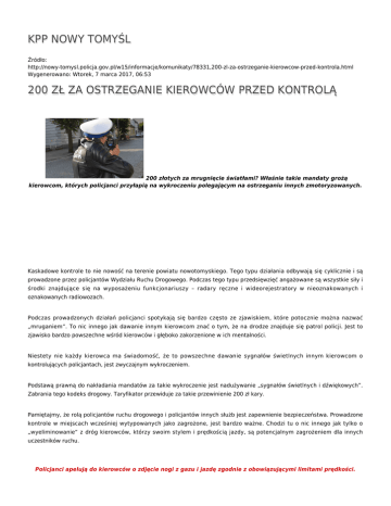 KPP NOWY TOMYŚL Źródło: http://nowy-tomysl.policja.gov.pl/w15/informacje/komunikaty/78331,200-zl-za-ostrzeganie-kierowcow-przed-kontrola.html Wygenerowano: Wtorek, 7 marca 2017, 06:53 200 ZŁ ZA OSTRZEGANIE KIEROWCÓW PRZED KONTROLĄ 200 złotych za mrugnięcie światłami? Właśnie takie mandaty grożą kierowcom, których policjanci przyłapią na wykroczeniu polegającym na ostrzeganiu innych zmotoryzowanych. Kaskadowe kontrole to nie nowość na terenie powiatu nowotomyskiego. Tego typu działania odbywają się cyklicznie i są prowadzone przez policjantów Wydziału Ruchu Drogowego. Podczas tego typu przedsięwzięć angażowane są wszystkie siły i środki znajdujące się na wyposażeniu funkcjonariuszy – radary ręczne i wideorejestratory w nieoznakowanych i oznakowanych radiowozach. Podczas prowadzonych działań policjanci spotykają się bardzo często ze zjawiskiem, które potocznie można nazwać „mruganiem”. To nic innego jak dawanie innym kierowcom znać o tym, że na drodze znajduje się patrol policji. Jest to zjawisko bardzo powszechne wśród kierowców i głęboko zakorzenione w ich mentalności. Niestety nie każdy kierowca ma świadomość, że to powszechne dawanie sygnałów świetlnych innym kierowcom o kontrolujących policjantach, jest zwyczajnym wykroczeniem. Podstawą prawną do nakładania mandatów za takie wykroczenie jest nadużywanie „sygnałów świetlnych i dźwiękowych”. Zabrania tego kodeks drogowy. Taryfikator przewiduje za takie przewinienie 200 zł kary. Pamiętajmy, że rolą policjantów ruchu drogowego i policjantów innych służb jest zapewnienie bezpieczeństwa. Prowadzone kontrole w miejscach wcześniej wytypowanych jako zagrożone, jest bardzo ważne. Chodzi tu o nic innego jak tylko o „wyeliminowanie” z dróg kierowców, którzy swoim stylem i prędkością jazdy, są potencjalnym zagrożeniem dla innych uczestników ruchu. Policjanci apelują do kierowców o zdjęcie nogi z gazu i jazdę zgodnie z obowiązującymi limitami prędkości. Pamiętajmy, że im szybciej jedziemy, tym bardziej musimy się liczyć z dłuższą drogą hamowania. Natomiast przy dużym natężeniu ruchu pojazdów, szybka jazda nie zawsze skróci nam czas podróży, a zagrożenie które jest spowodowane nadmierną prędkością i nieprawidłowym wyprzedzaniem może przynieść wiele nieszczęścia. Pamiętajmy, że kierowcy prowadzący auto z dużą prędkością muszą odpowiednio wcześniej sygnalizować zamiar zmiany kierunku jazdy lub pasa ruchu, a także zwiększyć odległość od poprzedzającego pojazdu. Tego rodzaju działania będą systematycznie przeprowadzane na drogach naszego powiatu. W ten sposób policjanci nowotomyskiej „drogówki” chcą zmobilizować kierowców do przestrzegania przepisów ruchu drogowego. Chcemy uświadomić wszystkim kierującym, że nie stosując się do przepisów Kodeksu Drogowego zagrażają nie tylko sobie, ale też innym uczestnikom ruchu drogowego. Ocena: 0/5 (0) Tweetnij