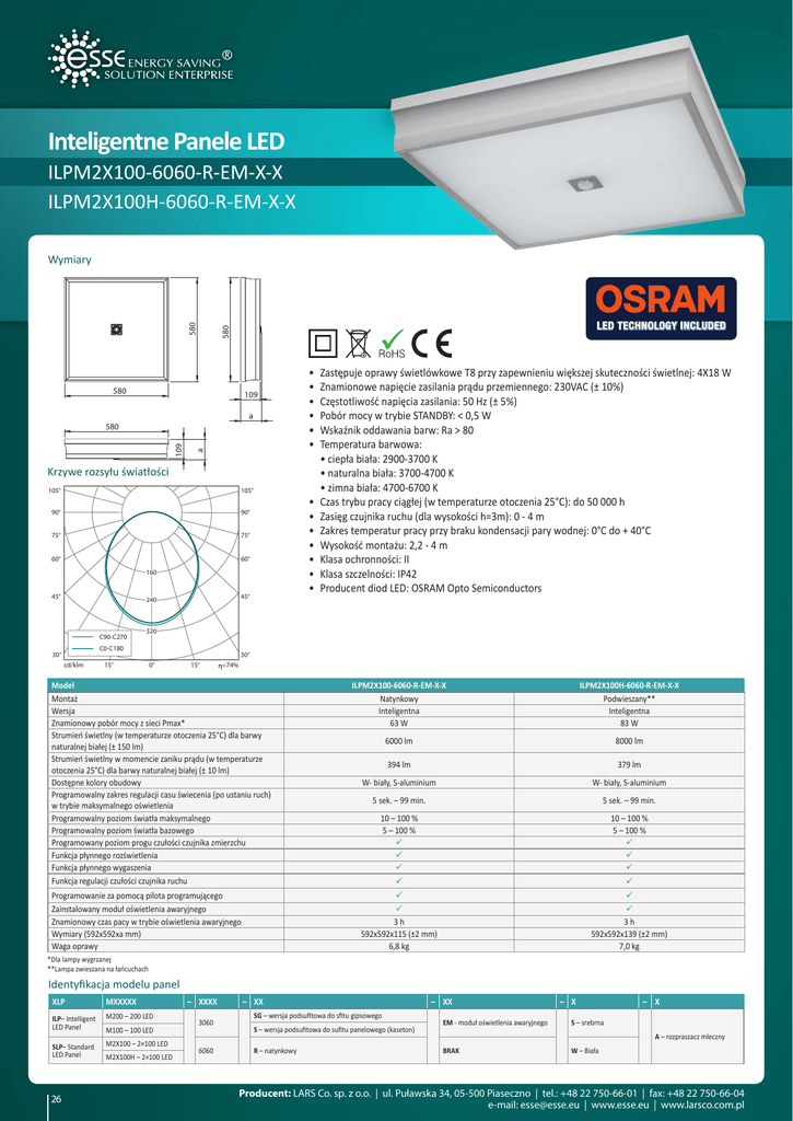 Inteligentne Panele LED ILPM2X100-6060-R-EM-X-X ILPM2X100H-6060-R-EM-X-X 580 580 Wymiary 580 109 a a 109 580 Krzywe rozsyłu światłości 105° 105° 90° 90° 75° 75° 60° 60° 160 45° 45° 240 C90-C270 320 C0-C180 30° cd/klm • Zastępuje oprawy świetlówkowe T8 przy zapewnieniu większej skuteczności świetlnej: 4X18 W • Znamionowe napięcie zasilania prądu przemiennego: 230VAC (± 10%) • Częstotliwość napięcia zasilania: 50 Hz (± 5%) • Pobór mocy w trybie STANDBY: < 0,5 W • Wskaźnik oddawania barw: Ra > 80 • Temperatura barwowa: • ciepła biała: 2900-3700 K • naturalna biała: 3700-4700 K • zimna biała: 4700-6700 K • Czas trybu pracy ciągłej (w temperaturze otoczenia 25°C): do 50 000 h • Zasięg czujnika ruchu (dla wysokości h=3m): 0 - 4 m • Zakres temperatur pracy przy braku kondensacji pary wodnej: 0°C do + 40°C • Wysokość montażu: 2,2 - 4 m • Klasa ochronności: II • Klasa szczelności: IP42 • Producent diod LED: OSRAM Opto Semiconductors 15° 30° 0° 15° =74% Model Montaż Wersja Znamionowy pobór mocy z sieci Pmax* Strumień świetlny (w temperaturze otoczenia 25°C) dla barwy naturalnej białej (± 150 lm) Strumień świetlny w momencie zaniku prądu (w temperaturze otoczenia 25°C) dla barwy naturalnej białej (± 10 lm) Dostępne kolory obudowy Programowalny zakres regulacji casu świecenia (po ustaniu ruch) w trybie maksymalnego oświetlenia Programowalny poziom światła maksymalnego Programowalny poziom światła bazowego Programowany poziom progu czułości czujnika zmierzchu Funkcja płynnego rozświetlenia Funkcja płynnego wygaszenia Funkcja regulacji czułości czujnika ruchu Programowanie za pomocą pilota programującego Zainstalowany moduł oświetlenia awaryjnego Znamionowy czas pacy w trybie oświetlenia awaryjnego Wymiary (592x592xa mm) Waga oprawy ILPM2X100-6060-R-EM-X-X Natynkowy Inteligentna 63 W ILPM2X100H-6060-R-EM-X-X Podwieszany** Inteligentna 83 W 6000 lm 8000 lm 394 lm 379 lm W- biały, S-aluminium W- biały, S-aluminium 5 sek. – 99 min. 5 sek. – 99 min. 10 – 100 % 5 – 100 % 10 – 100 % 5 – 100 % 3h 592x592x115 (±2 mm) 6,8 kg 3h 592x592x139 (±2 mm) 7,0 kg *Dla lampy wygrzanej **Lampa zwieszana na łańcuchach Identyfikacja modelu panel XLP MXXXXX ILP– Intelligent LED Panel M200 – 200 LED SLP– Standard LED Panel M2X100 – 2×100 LED 26 M100 – 100 LED M2X100H – 2×100 LED – XXXX 3060 6060 – XX SG – wersja podsufitowa do sfitu gipsowego S – wersja podsufitowa do sufitu panelowego (kaseton) R – natynkowy – XX – X EM - moduł oświetlenia awaryjnego S – srebrna BRAK W – Biała – X A – rozpraszacz mleczny Producent: LARS Co. sp. z o.o. | ul. Puławska 34, 05-500 Piaseczno | tel.: +48 22 750-66-01 | fax: +48 22 750-66-04 e-mail: [email protected] | www.esse.eu | www.larsco.com.pl
