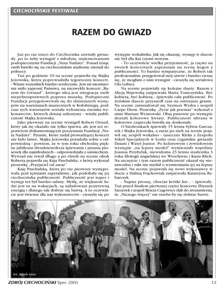 CIECHOCI¡SKIE FESTIWALE RAZEM DO GWIAZD Ju˝ po raz trzeci do Ciechocinka zawita∏y gwiazdy, po to ˝eby wystàpiç z m∏odym, utalentowanymi podopiecznymi Fundacji „Nuta Nadziei”. Ponad tysiàc osób bawi∏o si´ na ciechociƒskim stadionie niemal do pó∏nocy. Tu˝ po godzinie 19 na scenie pojawi∏a si´ Majka Je˝owska, która poprowadzi∏a tegoroczny koncert. - Witam wszystkich bardzo serdecznie. Jest mi niezmiernie mi∏o zaprosiç Paƒstwa, na niezwyk∏y koncert „Razem do Gwiazd”, którego ideà jest integracja osób niepe∏nosprawnych poprzez muzyk´. Podopieczni Fundacji przygotowywali si´ do dzisiejszych wyst´pów na warsztatach muzycznych w Ko∏obrzegu, podczas tych warsztatów zosta∏a wy∏oniona ósemka wykonawców, których dzisiaj us∏yszymy - wita∏a publicznoÊç Majka Je˝owska. Jako pierwszy na scenie wystàpi∏ Robert Orszu∏, który jak si´ okaza∏o nie tylko Êpiewa, ale jest te˝ reporterem dokumentujàcym poczynania Fundacji „Nuta Nadziei”. Pytanie, które zada∏ prowadzàcej koncert nie by∏o ∏atwe. Majka Je˝owska poradzi∏a sobie z odpowiedzià - powiem, ˝e w tym roku obchodz´ pi´kny jubileusz dwudziestolecia Êpiewania i pisania piosenek dla najm∏odszych - odpowiedzia∏a z uÊmiechem. Wywiad nie trwa∏ d∏ugo a po chwili na scenie obok Roberta pojawi∏a si´ Kaja Paschalska, z którà wykona∏ piosenk´ „Przyjaciel od zaraz” Kaj´ Paschalskà, która po raz pierwszy wyst´powa∏a pod t´˝niami zapytaliÊmy, jak podoba∏a si´ jej ciechociƒska publicznoÊç. PublicznoÊç jest super i wyst´p te˝ by∏ bardzo udany. MyÊl´, ˝e wi´kszoÊç ludzi jest tu na wakacjach, sà na∏adowani pozytywnà energià i dlatego tak dobrze si´ bawià. A to oczywiÊcie jest Êwietne dla nas wykonawców - cieszy∏a si´ po wyst´pie wokalistka. Jak si´ okazuj´, wyst´p w duecie nie by∏ dla Kai czymÊ nowym. - To oczywiÊcie wielka przyjemnoÊç, ja cz´sto na swoich koncertach zapraszam na scen´ kogoÊ z publicznoÊci. To bardzo sympatyczne, ˝e Robert tak profesjonalnie przygotowa∏ mój utwór i bardzo ciesz´ si´, ˝e mog∏am z nim wystàpiç - cieszy∏a si´ serialowa Ola Lubicz. Na scenie pojawia∏y si´ kolejne duety. Razem z Alicjà Majewskà zaÊpiewa∏a Marta Tomczyƒska. Byç kobietà, byç kobietà - Êpiewa∏a ca∏a publicznoÊç. Po ˝eƒskim duecie przyszed∏ czas na ostrzejsze granie. Na scenie zainstalowa∏ si´ Szymon Wydra i zespó∏ Carpe Diem. Piosenk´ „˚ycie jak poemat” wykona∏ z nimi Mariusz Wentowski. Obaj panowie po wyst´pie dostali kolorowe kwiaty. PublicznoÊç ubrana w kolorowe czapeczki bawi∏a si´ doskonale. O biedronkach Êpiewa∏y 15 letnia Sylwia Garczarek i Majka Je˝owska, a zaraz po nich na scenie pojawi∏ si´ zespó∏ wokalno - taneczny Kleks z Zespo∏u Szkó∏ Specjalnych w ¸odzi oraz cygaƒskie gwiazdy Dziani i Wasyl Junior. Po kolorowym i ˝ywio∏owym wyst´pie „na lepszy model” wymienia∏y wspólnie Joanna Przybylak, niewidoma 23 letnia studentka 3 roku filologii angielskiej we Wroc∏awiu i Kasia Klich. Na szcz´Êcie i tym razem publicznoÊç okaza∏ si´ niezawodna i nikt nie myÊla∏ o wymienianiu jej na lepszy model. Na scenie pojawiali si´ nowi wykonawcy w ducie z Halinà Fràckowiak zaÊpiewa∏a Katarzyna Rybarczyk. - Napisz prosz´, chocia˝ krótki list... - Êpiewa∏y. Tu˝ przed fina∏em pierwszej cz´Êci koncertu Zbyszek Szczerek i zespó∏ Bracia Cugowscy dali do zrozumienia, ˝e „Niczego wi´cej” nie trzeba by si´ dobrze bawiç. fot. Jakub Giza ZDRÓJ CIECHOCI¡SKI lipec 2005 12 WYWIAD ZDROJU MAMA STRASZNIE SI¢ DENERWOWA¸A Zanim wspólnie wszyscy uczestnicy zaÊpiewali piosenk´ fina∏owà na scenie pojawili si´ Marsza∏ek Województwa kujawsko - Pomorskiego Waldemar Achramowicz i Prezes Fundacji Nuta Nadziei Zofia Kirszenstein. Ogromnie si´ ciesz´, ˝e kolejny raz mogliÊmy si´ spotkaç w Ciechocinku, przyznam si´, ˝e Fundacja Nuta Nadziei organizuje wiele koncertów w ró˝nych miastach Polski, ale najch´tniej przyje˝d˝amy do Ciechocinka. - mówi∏a Prezes Fundacji. - Chcia∏bym w imieniu Was kujawsko - pomorskiej, ciechociƒskiej publicznoÊci serdecznie podzi´kowaç Pani Prezes i naszym m∏odym wykonawcom za tak znakomity koncert. Koncert, który jest faktycznie „Drogà do Gwiazd”, ale tak˝e „Nutà Nadziei”. Chcia∏bym te˝ przekazaç mi∏à wiadomoÊç, Zarzàd Województwa Kujawsko - Pomorskiego przekazuje, na r´ce Fundacji od nas wszystkich z zaproszeniem na rok 2006 kwot´ 10 tys. z∏otych dzi´kowa∏ marsza∏ek. Po podzi´kowaniach i zaproszeniach wszyscy wykonawcy udowodnili, ˝e „Marzenia si´ spe∏niajà” wykonujàc w∏aÊnie ten utwór Majki Je˝owskiej na zakoƒczenie pierwszej, rejestrowanej prze program 2 TVP, cz´Êci koncertu.. Po krótkiej przerwie technicznej, w trakcie której publicznoÊç korzysta∏a z by zdobyç autograf i zrobiç sobie zdj´cie z gwiazdami, na scenie pojawili si´ kolejni podopieczni Fundacji. Dla publicznoÊci zagrali Marta Rogalska z Aleksandrowa Kujawskiego, która w zesz∏ym roku zachwyci∏a wszystkich swoim wyst´pem,. Nie inaczej by∏o i tym razem, choç m∏oda artysta wystàpi∏a nie z zespo∏em, a tylko z towarzyszeniem gitary. Po niej na scenie zaprezentowa∏y si´ Ramona Wilman i Agnieszka Osowska. Nad stadionem powoli zapada∏ zmrok, gdy na scenie pojawi∏a si´ Halina Fràckowiak, w ten sposób rozpocz´∏a si´ trzecia cz´Êç koncertu. Nie by∏ to jednak ostatni recital tego wieczoru. Kolejnym wykonawcà, który poderwa∏ publicznoÊç z ∏awek by∏ Szymon Wydra i zespó∏ Carpe Diem. Pod scenà z ka˝dà chwilà przybywa∏o bawiàcych si´ osób. Nast´pnie przed ciechociƒskà publicznoÊcià wystàpi∏a Kasia Klich, zabaw´ zakoƒczy∏ wyst´p Dzianiego i Wasyla Juniora. Organizatorami III Festiwalu „Razem do Gwiazd” byli: Fundacja „Nuta Nadziei”, Urzàd Marsza∏kowski Województwa Kujawsko -