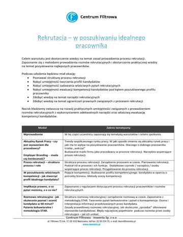Celem warsztatu jest dostarczenie wiedzy na temat zasad prowadzenia procesu rekrutacji. Zapoznanie się z metodami prowadzenia rozmów rekrutacyjnych i dostarczenie praktycznej wiedzy na temat pozyskiwania najlepszych pracowników. Podczas szkolenia będziesz miał okazję: Poznawać strukturę procesu rekrutacji Nabyć umiejętność tworzenia profili kandydatów Nabyć umiejętność zadawania właściwych pytań rekrutacyjnych Nabyć umiejętność ewaluacji kompetencji kandydatów pod kątem poszukiwanego profilu pracownika Zdobyć wiedzę na temat narzędzi rekrutacyjnych Zdobyć wiedzę na temat ograniczeń prawnych związanych z procesem rekrutacji Nacisk kładziemy zwłaszcza na rozwój praktycznych umiejętności związanych z prowadzeniem rozmów rekrutacyjnych z wykorzystaniem adekwatnych narzędzi oraz właściwą ewaluację kompetencji kandydatów. Moduł Zakres tematyczny Wprowadzenie W tej części uczestnicy zapoznają się tematyką warsztatów i celami spotkania. Aktualny Rynek Pracy - czy jest wyzwaniem dla pracodawcy? Trendy współczesnego rynku pracy. W jaki sposób zmienia się aktualny rynek pracy i jaki ma to wpływ na pozyskiwanie pracowników. Dlaczego o dobrego pracownika trzeba „walczyć” Budowanie marki firmy jako pracodawcy w procesie rekrutacji. Narzędzia wspierające proces rekrutacji. Employer Branding - moda czy konieczność? Proces rekrutacji – struktura procesu i role W poszukiwaniu właściwych kompetencji - jak stworzyć profil idealnego kandydata? Struktura procesu rekrutacji. Zarządzenie procesem w czasie. Planowanie rekrutacji. Podział ról w procesie i ich funkcje. Dodatkowe czynniki / narzędzia / osoby wspierające proces rekrutacji. Przygotowanie do procesu rekrutacji. Pojęcie kompetencji. Budowanie profilu kompetencyjnego kandydata w oparciu o potrzeby biznesu. Metody oceny kompetencji. Implikacje prawne, o co pytać możemy, a o co nie? Zapoznanie z regulacjami dotyczącymi procesu rekrutacji pracowników i rozmów rekrutacyjnych. Rozmowa rekrutacyjna - jak skutecznie poznać i ocenić kandydata w 60 minut? Pytania behawioralne i metodologia STAR. Struktura rozmowy rekrutacyjnej i zarządzenie rozmową w czasie. Zapoznanie z metodologią STAR. Tworzenie pytań behawioralne i pytań o komepetencje. Ocena i interpretacja informacji przedstawianych przez kandydata. Zasady prawidłowej rozmowy rekrutacyjnej. Jak skutecznie „sprzedać” oferowane stanowisko kandydatowi. Błędy najczęściej popełniane podczas rozmów przez osoby rekrutujące – jak ich unikać. Narzędzia rekrutacyjne - jak korzystać i kiedy? Ewaluacja rozmów rekrutacyjnych - wybór właściwego kandydata nie musi być trudny! Zapoznanie z dodatkowymi narzędziami wspierającymi rozmowę rekrutacyjną i proces rekrutacji. Zasady tworzenia business casów. Kiedy stosować dodatkowe narzędzia rekrutacyjne. Zapoznanie ze sposobami ewaluacji rozmów rekrutacyjnych i narzędziami wspierającymi podjęcie decyzji. Forma prowadzenia zajęć: Szkolenie zostanie poprowadzone w formie aktywnej z bogatą porcją ćwiczeń praktycznych. Nacisk podczas zajęć położony będzie na rozwijanie i doskonalenie praktycznych umiejętności. Podczas zajęć wykorzystane zostaną następujące metody pracy: praca w grupach, ćwiczenia praktyczne, dyskusja, symulacje Omówienie treści merytorycznych nastąpi w formie wniosków, dyskusji, wymiany doświadczeń między uczestnikami i mini wykładów.