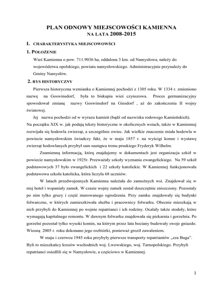 PLAN ODNOWY MIEJSCOWOŚCI KAMIENNA NA LATA 2008-2015 I. CHARAKTERYSTYKA MIEJSCOWOWŚCI 1. POŁOśENIE Wieś Kamienna o pow. 711.9036 ha, oddalona 3 km. od Namysłowa, naleŜy do województwa opolskiego, powiatu namysłowskiego. Administracyjnie przynaleŜy do Gminy Namysłów. 2. RYS HISTORYCZNY Pierwsza historyczna wzmianka o Kamiennej pochodzi z 1305 roku. W 1334 r. zmieniono nazwę na Goswinsdorf, spowodował zmianę była to biskupia wieś czynszowa. Proces germanizacyjny nazwy Goswinsdorf na Giesdorf , aŜ do zakończenia II wojny światowej. Jej nazwa pochodzi od w wyrazu kamień (bądź od nazwiska rodowego Kamieńskich). Na początku XIX w. jak podają teksty historyczne w okolicznych wsiach, takŜe w Kamiennej rozwijała się hodowla zwierząt, a szczególnie owiec. Jak wielkie znaczenie miała hodowla w powiecie namysłowskim świadczy fakt, Ŝe w maju 1857 r. na wyścigi konne i wystawę zwierząt hodowlanych przybył sam następca tronu pruskiego Fryderyk Wilhelm. Znamienną informacją, którą znajdujemy w dokumentach jest organizacja szkół w powiecie namysłowskim w 1925r. PrzewaŜały szkoły wyznania ewangelickiego. Na 59 szkół podstawowych 37 było ewangelickich i 22 szkoły katolickie. W Kamiennej funkcjonowała podstawowa szkoła katolicka, która liczyła 68 uczniów. W latach przedwojennych Kamienna naleŜała do zamoŜnych wsi. Znajdował się w niej hotel i wspaniały zamek. W czasie wojny zamek został doszczętnie zniszczony. Pozostały po nim tylko gruzy i część murowanego ogrodzenia. Przy zamku znajdowały się budynki folwarczne, w których zamieszkiwała słuŜba i pracownicy folwarku. Obecnie mieszkają w nich przybyli do Kamiennej po wojnie repatrianci i ich rodziny. Ocalały takŜe stodoły, które wymagają kapitalnego remontu. W dawnym folwarku znajdowała się piekarnia i gorzelnia. Po gorzelni pozostał tylko wysoki komin, na którym przez lata bociany budowały swoje gniazdo. Wiosną 2005 r. roku dokonano jego rozbiórki, poniewaŜ groził zawaleniem. W maju i czerwcu 1945 roku przybyły pierwsze transporty repatriantów „zza Buga”. Byli to mieszkańcy kresów wschodnich woj. Lwowskiego, woj. Tarnopolskiego. Przybyli repatrianci osiedlili się w Namysłowie, a częściowo w Kamiennej. 1 3. LICZBA MIESZKAŃCÓW ogółem do 18 roku 420 od 19 do 65 roku męŜczyźni od 19 do 65 roku kobiety 137 120 100 powyŜej 65 roku męŜczyźni i kobiety 63 4. BEZROBOCIE Bezrobotni zarejestrowani Wyszczególnienie ogółem razem z prawem do zasiłku kobiety razem kobiety Ogółem w tym 16 10 3 3 Do 25 roku Ŝycia 6 5 2 2 Długotrwałe bezrobocie 10 5 2 2 PowyŜej 50 roku Ŝycia 5 1 0 0 Bez kwalifikacji zawodowych 1 1 0 0 II . INFRASTRUKTURA SPOŁECZNA OŚWIATA Na terenie sołectwa funkcjonuje zbiorcza Szkoła Podstawowa, a władze Gminne zapewniają dowóz dzieci do gimnazjum w Namysłowie i przedszkola w Bukowie Śl. Na terenie wsi zostało zaadaptowane pomieszczenie, które spełnia rolę świetlicy wiejskiej, ale wymaga modernizacji i wyposaŜenia. SŁUśBA ZDROWIA Mieszkańcy korzystają z usług Szpitala i Przychodni Medycznych w Namysłowie. Infrastruktura techniczna 2 Wieś Kamienna posiada wodociąg i kanalizację, a ponadto jej połoŜenie blisko miasta Namysłowa oraz w nieduŜej odległości od Zalewu w Michalicach, sprawiają, Ŝe jest najatrakcyjniejszą wsią pod względem inwestowania w nowe budownictwo. Sieć gazowa Brak sieci gazowej , wieś zaopatrywana jest w gaz butlowy. Sieć energetyczna Wieś zaopatrywana jest w energię elektryczną liniami o napięci 15 KW co zapewnia zasilanie miejscowości w sposób ciągły z ograniczeniem do minimum przerw awaryjnych. Sołectwo obsługiwane jest przez Energia Pro Koncern Energetyczny SA w Opolu, Rejon Energetyczny Namysłów. Komunikacja Przez teren sołectwa przebiegają dwie drogi krajowe nr 39 w kierunku Kluczborka i nr 42 w kierunku Kępna, które podnoszą atrakcyjność miejscowości. Komunikację Publiczną zapewnia Przedsiębiorstwo Komunikacji Samochodowej w Namysłowie, przystanki autobusowe zaopatrzone są w nowe wiaty przystankowe. Przez wieś prowadzi droga na zalew w Michalicach. Gospodarka Wielkość gospodarstw indywidualnych 1-2 ha powyŜej powyŜej powyŜej powyŜej powyŜej 2-5 ha 5-7 ha 7 - 10 ha 10 - 15 ha 15 ha 19 9 8 2 6 26 Gleby zaliczane są do klas średnich i słabych, uprawiane są zboŜa, kukurydza, buraki cukrowe i ziemniaki. We wsi znajdują się: Sklep spoŜywczy Zakład ślusarski Zakład mechaniki samochodowej Punkt skupu złomu i kasacja samochodów Państwowy Dom Opieki Społecznej SprzedaŜ pokryć dachowych 3 III. OCENA MOCNYCH I SŁABYCH STRON MIEJSCOWOŚCI MOCNE STRONY SŁABE STRONY Telefonizacja Słaba infrastruktura ( drogi gaz ) Kanalizacja Brak bazy sportowej i turystycznej Zwodociągowanie Dzikie wysypiska Potencjał ludzki Średnie bezrobocie Aktywna i otwarta społeczność Imigracja młodych i wykształconych Brak placów zabaw dla dzieci lokalna Plan zagospodarowania przestrzennego Bliskość Namysłowa Bliskość zalewu w Michalicach Atrakcyjne połoŜenie sprzyjające uprawianiu turystyki i rekreacji Szkoła Podstawowa Państwowy Dom Opieki Społecznej Kościół Świetlica wiejska Przebiegające dwie drogi krajowe nr 39 i nr 42 SZANSE Dokształcenie społeczeństwa – szkolenia i kursy Sprzyjająca polityka regionalna ZAGROśENIA Rosnące bezrobocie Migracja młodzieŜy do duŜych miast Brak własnych środków finansowych adresowana do obszarów wiejskich Zwiększenie dostępności do kapitału i środków pomocowych w tym pochodzących z unii 4 IV. OPIS PLANOWANYCH ZADAŃ INWESTYCYJNYCH W KAMIENNEJ Priorytet 1: Zwiększenie aktywności społeczności lokalnej w organizacjach działających na terenie miejscowości Działania: 1. organizacja placu zabaw dla dzieci z terenu sołectwa Priorytet 2: Działania: 1. remont kościoła ( dach, elewacja, stolarka, okna ) 2. poprawa oświetlenia we wsi i na chodniku do szkoły 3. budowa Ścieszki row