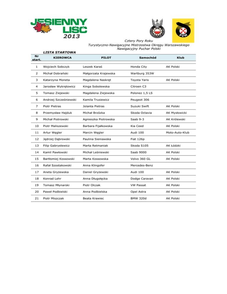 2013 Cztery Pory Roku Turystyczno-Nawigacyjne Mistrzostwa Okręgu Warszawskiego Nawigacyjny Puchar Polski LISTA STARTOWA Nr start. KIEROWCA PILOT Samochód Klub 1 Wojciech Sobczyk Leszek Karaś Honda City AK Polski 2 Michał Dobrański Małgorzata Krajewska Wartburg 353W 3 Katarzyna Moneta Magdalena Naskręt Toyota Yaris 4 Jarosław Wykrętowicz Kinga Sobolewska Citroen C3 5 Tomasz Ziejewski Magdalena Ziejewska Polonez 1,5 LS 6 Andrzej Szcześniewski Kamila Trusiewicz Peugeot 306 7 Piotr Pietras Jolanta Pietras Suzuki Swift AK Polski 8 Przemysław Hajduk Michał Brzózka Skoda Octavia AK Mysłowicki 9 Michał Piotrowski Agnieszka Piotrowska Saab 9-3 AK Królewski 10 Piotr Maliszewski Barbara Fijałkowska Kia Ceed AK Polski 11 Artur Węgler Marcin Węgler Audi 100 Moto-Auto-Klub 12 Jędrzej Dąbrowski Paulina Sieniawska Fiat 126p 13 Filip Gabryelewicz Marta Retmaniak Skoda S105 AK Łódzki 14 Kamil Pawłowski Michał Leśniewski Saab 9000 AK Polski 15 Bartłomiej Kossowski Marta Kossowska Volvo 360 GL AK Polski 16 Rafał Szostakowski Anna Klingofer Mercedes-Benz 17 Aneta Gryżewska Daniel Gryżewski Audi 100 AK Polski 18 Konrad Lehr Anna Długołęcka Dodge Caravan AK Polski 19 Tomasz Młynarski Piotr Olczak VW Passat AK Polski 20 Paweł Podbielski Anna Podbielska Opel Astra AK Polski 21 Piotr Miszczak Beata Krawiec BMW 320d AK Polski AK Polski