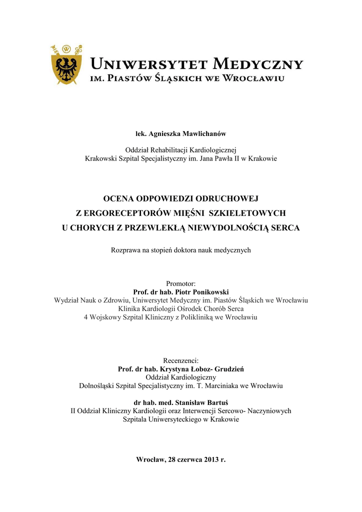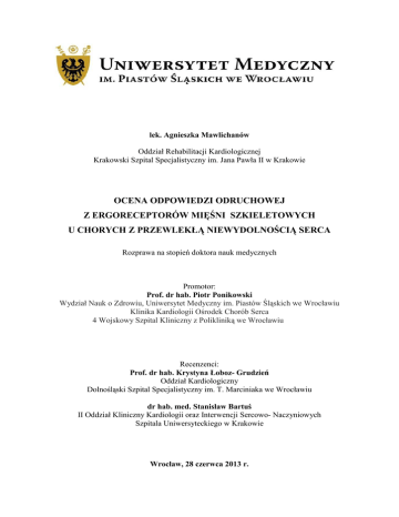 lek. Agnieszka Mawlichanów Oddział Rehabilitacji Kardiologicznej Krakowski Szpital Specjalistyczny im. Jana Pawła II w Krakowie OCENA ODPOWIEDZI ODRUCHOWEJ Z ERGORECEPTORÓW MIĘŚNI SZKIELETOWYCH U CHORYCH Z PRZEWLEKŁĄ NIEWYDOLNOŚCIĄ SERCA Rozprawa na stopień doktora nauk medycznych Promotor: Prof. dr hab. Piotr Ponikowski Wydział Nauk o Zdrowiu, Uniwersytet Medyczny im. Piastów Śląskich we Wrocławiu Klinika Kardiologii Ośrodek Chorób Serca 4 Wojskowy Szpital Kliniczny z Polikliniką we Wrocławiu Recenzenci: Prof. dr hab. Krystyna Łoboz- Grudzień Oddział Kardiologiczny Dolnośląski Szpital Specjalistyczny im. T. Marciniaka we Wrocławiu dr hab. med. Stanisław Bartuś II Oddział Kliniczny Kardiologii oraz Interwencji Sercowo- Naczyniowych Szpitala Uniwersyteckiego w Krakowie Wrocław, 28 czerwca 2013 r. NOTA BIOGRAFICZNA Imię i nazwisko: Agnieszka Mawlichanów Primo Voto: Kaczmarek Data i miejsce urodzenia: 11.11.1970 Kędzierzyn - Koźle WYKSZTAŁCENIE 1989-1995 Wydział Lekarski, Akademia Medyczna im. Piastów Śląskich we Wrocławiu 06.11.1998. uzyskanie I º specjalizacji z chorób wewnętrznych 26.11.2002 uzyskanie tytułu specjalisty II º z chorób wewnętrznych 27.10.2005 uzyskanie tytułu specjalisty kardiologa DOŚWIADCZENIE ZAWODOWE 10.1996-03.1999 Wojewódzki Szpital Chorób Infekcyjnych we Wrocławiu, Oddział Neuroinfekcji, młodszy asystent 04.1999-03.2004 4 Wojskowy Szpital Kliniczny we Wrocławiu, Klinika Kardiologii asystent, starszy asystent 05.2000-11.2000 staż naukowy w NHLI Heart Failure Unit Royal Brompton Hospital w Londynie 2004- 2007 108 Szpital Wojskowy z Przychodnią w Ełku Oddział Chorób Wewnętrznych/ Pododdział Kardiologii, starszy asystent 07.2007–10.2008 Uzdrowiskowy Szpital Kardiologiczny w Rabce Zdroju, Oddział Rehabilitacji Kardiologicznej, ordynator od 10.2008 Krakowski Szpital Specjalistyczny im. Jana Pawła II w Krakowie, Oddział Rehabilitacji Kardiologicznej, starszy asystent DOROBEK NAUKOWY Autorka i współautorka 13 publikacji, Prezentacje prac: American College of Cardiology – Orlando 2001 – European Society of Cardiology – Berlin 2002 – European Society of Cardiology – Wiedeń 2003 – kongresy Polskiego Towarzystwa Kardiologicznego STRESZCZENIE Wstęp: Nietolerancja wysiłku fizycznego, manifestująca się jako duszność i zmęczenie, to główne objawy niewydolności serca (NS). U chorych z NS wykazano, że wzmożona wentylacja wysiłkowa koreluje ze stopniem zaawansowania choroby oraz wiąże się ze złym rokowaniem. Nasilenie objawów NS tylko w niewielkim stopniu zależy od stopnia uszkodzenia lewej komory serca, co wskazuje na złożoną patogenezę objawów nietolerancji wysiłku. Uszkodzenie serca prowadzi do uruchomienia kaskady zaburzeń, które oprócz niekorzystnych efektów hemodynamicznych w układzie krążenia, przyczyniają się do postępującego uszkodzenia struktury i funkcji mięśni szkieletowych. U części chorych z zaawansowaną NS proces postępującej utraty masy mięśniowej może dominować w obrazie klinicznym, przybierając obraz tzw. wyniszczenia sercowego. Wraz z zanikiem tkanki mięśniowej w NS, dochodzi do dysfunkcji czynnościowej objawiającej się zmniejszeniem siły mięśni i zwiększeniem ich męczliwości. Jednym z następstw tej swoistej dla NS „miopatii” jest nadmierne pobudzenie zakończeń nerwowych w obrębie tkanki mięśniowej, zwanych ergoreceptorami mięśni szkieletowych. Ergoreceptory, wrażliwe na metabolity powstające w wyniku pracy mięśni, stanowią składową fizjologicznego mechanizmu odruchowego, którego zadaniem jest kontrola równowagi pomiędzy wielkością pracy mięśni a dostarczaniem odpowiedniej ilości tlenu i energii do miocytów. Nadmierna aktywacja ergoreceptorów może przyczyniać się do zwiększonej wentylacji wysiłkowej oraz wzmożonego napięcia układu współczulnego. Cel: Celem pracy była ocena odpowiedzi odruchowej z ergoreceptorów mięśni szkieletowych, zależności pomiędzy odpowiedzią z ergoreceptorów, stopniem nietolerancji wysiłku fizycznego oraz masą i funkcją mięśni u chorych z NS. Materiał i metody: W badaniu wzięło udział 69 chorych z przewlekłą NS i 24 osoby z grupy kontrolnej, odpowiednio dobrane pod względem wieku i indeksu masy ciała (BMI). U wszystkich badanych osób wykonano próbę spiroergomertyczną, w której oceniono szczytowe zużycia tlenu (pVO2) , próg przemiany beztlenowej (AT) oraz wyznaczono wentylację wysiłkową (współczynnik nachylenia liniowej regresji pomiędzy wentylacją a produkcją dwutlenku węgla - VE/VCO2). Ocenę ilości masy mięśniowej przeprowadzano metodą densytometrii (DEXA). Ocena odpowiedzi odruchowej z ergoreceptorów mięśniowych została przeprowadzona w oparciu o metodę opisaną przez Piepoli i wsp. (9). Przed rozpoczęciem testu dokonywano pomiaru maksymalnej siły mięśni prawego przedramienia za pomocą dynamometru. Osoba badana wykonywała w pozycji siedzącej dwie serie pięciominutowych izometrycznych ćwiczeń prawego przedramienia z siłą równą 30% ustalonej wcześniej maksymalnej siły przedramienia. Po jednej z serii na ramieniu ćwiczącej ręki zaciskano na 3 minuty mankiet (30 mmHg powyżej ciśnienia skurczowego) celem wywołania regionalnej okluzji krążenia (ROK) mającej na celu zatrzymanie metabolitów, które powstały w trakcie pracy mięśni i które pobudzały ergoreceptory. Podczas całego badania monitorowano zapis ekg, tętno i ciśnienie tętnicze krwi oraz rejestrowano zużycie tlenu (VO2), produkcję dwutlenku węgla (VCO2) i wentylację (VE). Porównanie wartości wentylacji oraz ciśnienia tętniczego krwi i częstości akcji serca podczas ROK, z odpowiednimi parametrami po wysiłku bez ROK, odpowiadało wielkości odpowiedzi z ergoreceptorów. Wyniki badania: 1) Chorzy z NS charakteryzowali się niższą maksymalną siłą mięśniową w porównaniu z osobami z grupy kontrolnej (K): (NS vs K: 176 ±