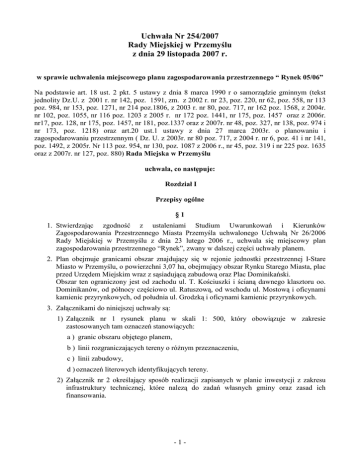 Uchwała Nr 254/2007 Rady Miejskiej w Przemyślu z dnia 29 listopada 2007 r. w sprawie uchwalenia miejscowego planu zagospodarowania przestrzennego “ Rynek 05/06” Na podstawie art. 18 ust. 2 pkt. 5 ustawy z dnia 8 marca 1990 r o samorządzie gminnym (tekst jednolity Dz.U. z 2001 r. nr 142, poz. 1591, zm. z 2002 r. nr 23, poz. 220, nr 62, poz. 558, nr 113 poz. 984, nr 153, poz. 1271, nr 214 poz.1806, z 2003 r. nr 80, poz. 717, nr 162 poz. 1568, z 2004r. nr 102, poz. 1055, nr 116 poz. 1203 z 2005 r. nr 172 poz. 1441, nr 175, poz. 1457 oraz z 2006r. nr17, poz. 128, nr 175, poz. 1457, nr 181, poz.1337 oraz z 2007r. nr 48, poz. 327, nr 138, poz. 974 i nr 173, poz. 1218) oraz art.20 ust.1 ustawy z dnia 27 marca 2003r. o planowaniu i zagospodarowaniu przestrzennym ( Dz. U. z 2003r. nr 80 poz. 717, z 2004 r. nr 6, poz. 41 i nr 141, poz. 1492, z 2005r. Nr 113 poz. 954, nr 130, poz. 1087 z 2006 r., nr 45, poz. 319 i nr 225 poz. 1635 oraz z 2007r. nr 127, poz. 880) Rada Miejska w Przemyślu uchwala, co następuje: Rozdział I Przepisy ogólne §1 1. Stwierdzając zgodność z ustaleniami Studium Uwarunkowań i Kierunków Zagospodarowania Przestrzennego Miasta Przemyśla uchwalonego Uchwałą Nr 26/2006 Rady Miejskiej w Przemyślu z dnia 23 lutego 2006 r., uchwala się miejscowy plan zagospodarowania przestrzennego “Rynek”, zwany w dalszej części uchwały planem. 2. Plan obejmuje granicami obszar znajdujący się w rejonie jednostki przestrzennej I-Stare Miasto w Przemyślu, o powierzchni 3,07 ha, obejmujący obszar Rynku Starego Miasta, plac przed Urzędem Miejskim wraz z sąsiadującą zabudową oraz Plac Dominikański. Obszar ten ograniczony jest od zachodu ul. T. Kościuszki i ścianą dawnego klasztoru oo. Dominikanów, od północy częściowo ul. Ratuszową, od wschodu ul. Mostową i oficynami kamienic przyrynkowych, od południa ul. Grodzką i oficynami kamienic przyrynkowych. 3. Załącznikami do niniejszej uchwały są: 1) Załącznik nr 1 rysunek planu w skali 1: 500, który obowiązuje w zakresie zastosowanych tam oznaczeń stanowiących: a ) granic obszaru objętego planem, b ) linii rozgraniczających tereny o róŜnym przeznaczeniu, c ) linii zabudowy, d ) oznaczeń literowych identyfikujących tereny. 2) Załącznik nr 2 określający sposób realizacji zapisanych w planie inwestycji z zakresu infrastruktury technicznej, które nalezą do zadań własnych gminy oraz zasad ich finansowania. -1- §2 1. Celem planu jest ustalenie przeznaczenia oraz zasad zabudowy i zagospodarowania terenu, wyznaczenie terenów dla rozwoju funkcji administracyjnych, usługowych, w zakresie usług w dziedzinie kultury a takŜe komercyjnych, rekreacji, edukacji i mieszkaniowych. 2. Ustala się następujące kategorie przeznaczenia terenu: 1) U –teren usług publicznych : kultury, rekreacji i rozrywki wraz z zielenią towarzyszącą, 2) UA – teren usług publicznych administracji, 3) UK – teren usług publicznych kultury i rekreacji, związanych z działalnością w zakresie turystyki i promocji miasta, 4) UO – teren usług publicznych oświaty i edukacji 5) U/M – teren zabudowy mieszkaniowo- usługowej: administracji, kultury, finansów, handlu detalicznego, gastronomii, turystyki, rozrywki, sportu wraz z zabudową mieszkaniową, 6) ZP – zieleni urządzonej, 7) KDD – drogi publicznej dojazdowej, 8) KX – ciągi pieszo jezdne i piesze, 9) KRX -ciągi piesze. 3. Następujące określenia informacyjne występujące w planie oznaczają: 1) parking podziemny – miejsca parkingowe urządzone poniŜej poziomem terenu, 2) uciąŜliwość – zjawisko lub stan dokuczliwy dla otoczenia lub utrudniający Ŝycie, a polegający na emitowaniu hałasu, drgań, zanieczyszczeń, nieprzyjemnych zapachów i podobnych, 3) ogród zimowy – obiekt kubaturowy o lekkiej konstrukcji ścian, wypełnionych szkłem lub innym przezroczystym materiałem, stanowiący łącznik między istniejącym obiektem a przestrzenią otwartą. 4. W obszarze planu naleŜy uwzględnić warunki zagospodarowania i zabudowy terenów wynikające z przepisów ustawy Prawo geologiczne i górnicze oraz przepisów szczególnych w związku z połoŜeniem w obszarze górniczym gazu ziemnego „Przemyśl” 5. Utrzymuje się dotychczasowy podział terenów. 6. Dopuszczalne poziomy hałasu nie mogą przekraczać na obszarze objętym planem poziomu hałasu jak dla terenów przeznaczonych na cele mieszkaniowo-usługowe. 7. Dla całego obszaru objętego planem i przedstawionego na rysunku planu w jego granicach, mają zastosowanie przepisy z zakresu ochrony zabytków i opieki nad zabytkami, dotyczące ochrony układu urbanistycznego, ochrony archeologicznej i ochrony wszystkich obiektów architektonicznych usytuowanych w pierzejach Rynku, w obrębie Placu Dominikańskiego, przy ulicy Grodzkiej oraz Ratuszowej a takŜe przy przecznicach Rynku, tj. ulicy Mostowej oraz Asnyka i Fredry, w związku z wpisaniem go do rejestru zabytków pod numerem A-705/709 oraz na podstawie indywidualnych wpisów do rejestru zabytków, ustalonych dla poszczególnych obiektów historycznych: A-302, A-303, A-347,A-412,A-8/340/Z, A-914, A-416, A-153, A-919, A-67/108, A-920, A-306, A-921, A-794, A-103, A-97, A-104, A105, A-106, A-63, A-199 oraz zabytki ruchome ( pomniki )objęte wpisem do rejestru: B-166 i B-167. -2- 8. W odniesieniu do obszaru objętego planem o której mowa w ust 7 obowiązują następujące ustalenia : 1) Nakazuje się zachować wszystkie budynki istniejące w momencie uchwalenia planu. 2) Zakazuje się : a ) budowy obiektów gospodarczych i garaŜowych, b ) stosowania w elewacjach budynków okładzin z tworzyw sztucznych, c ) ustawiania trwałych przegród oraz innych elementów na całej głębokości podcienia (równieŜ w ramach ogródków kawiarnianych) uniemoŜliwiających komunikację wzdłuŜ podcieni. d ) stosowania pokrycia dachu z blachy trapezowej. 3) W odniesieniu do istniejących budynków wpisanych do rejestru zabytków nakazuje 