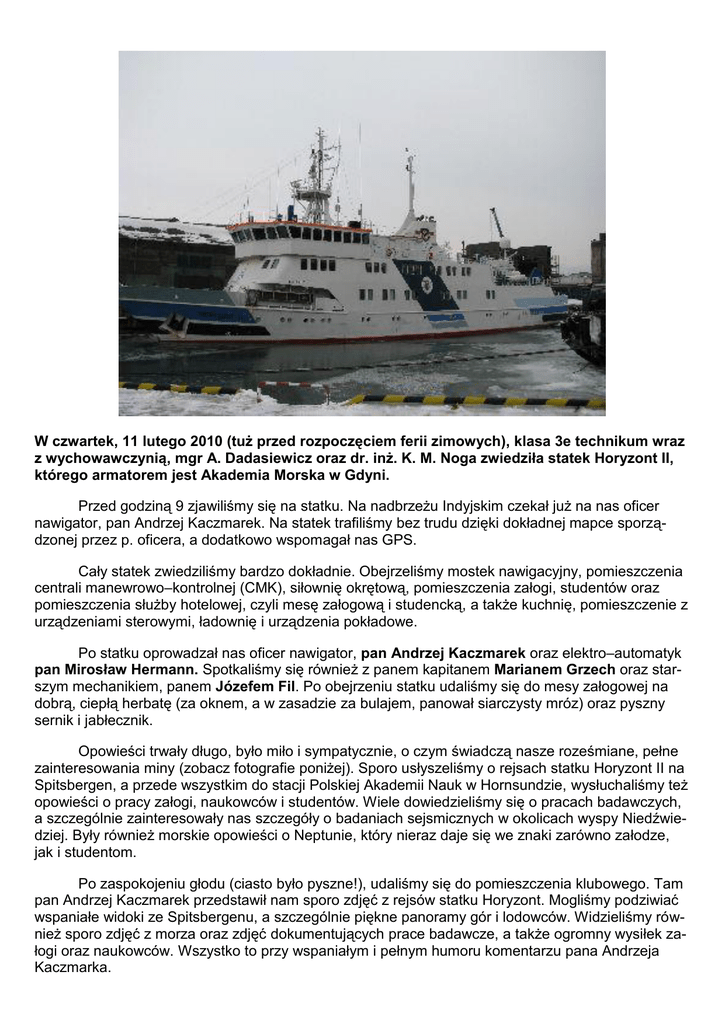 W czwartek, 11 lutego 2010 (tuż przed rozpoczęciem ferii zimowych), klasa 3e technikum wraz z wychowawczynią, mgr A. Dadasiewicz oraz dr. inż. K. M. Noga zwiedziła statek Horyzont II, którego armatorem jest Akademia Morska w Gdyni. Przed godziną 9 zjawiliśmy się na statku. Na nadbrzeżu Indyjskim czekał już na nas oficer nawigator, pan Andrzej Kaczmarek. Na statek trafiliśmy bez trudu dzięki dokładnej mapce sporządzonej przez p. oficera, a dodatkowo wspomagał nas GPS. Cały statek zwiedziliśmy bardzo dokładnie. Obejrzeliśmy mostek nawigacyjny, pomieszczenia centrali manewrowo–kontrolnej (CMK), siłownię okrętową, pomieszczenia załogi, studentów oraz pomieszczenia służby hotelowej, czyli mesę załogową i studencką, a także kuchnię, pomieszczenie z urządzeniami sterowymi, ładownię i urządzenia pokładowe. Po statku oprowadzał nas oficer nawigator, pan Andrzej Kaczmarek oraz elektro–automatyk pan Mirosław Hermann. Spotkaliśmy się również z panem kapitanem Marianem Grzech oraz starszym mechanikiem, panem Józefem Fil. Po obejrzeniu statku udaliśmy się do mesy załogowej na dobrą, ciepłą herbatę (za oknem, a w zasadzie za bulajem, panował siarczysty mróz) oraz pyszny sernik i jabłecznik. Opowieści trwały długo, było miło i sympatycznie, o czym świadczą nasze roześmiane, pełne zainteresowania miny (zobacz fotografie poniżej). Sporo usłyszeliśmy o rejsach statku Horyzont II na Spitsbergen, a przede wszystkim do stacji Polskiej Akademii Nauk w Hornsundzie, wysłuchaliśmy też opowieści o pracy załogi, naukowców i studentów. Wiele dowiedzieliśmy się o pracach badawczych, a szczególnie zainteresowały nas szczegóły o badaniach sejsmicznych w okolicach wyspy Niedźwiedziej. Były również morskie opowieści o Neptunie, który nieraz daje się we znaki zarówno załodze, jak i studentom. Po zaspokojeniu głodu (ciasto było pyszne!), udaliśmy się do pomieszczenia klubowego. Tam pan Andrzej Kaczmarek przedstawił nam sporo zdjęć z rejsów statku Horyzont. Mogliśmy podziwiać wspaniałe widoki ze Spitsbergenu, a szczególnie piękne panoramy gór i lodowców. Widzieliśmy również sporo zdjęć z morza oraz zdjęć dokumentujących prace badawcze, a także ogromny wysiłek załogi oraz naukowców. Wszystko to przy wspaniałym i pełnym humoru komentarzu pana Andrzeja Kaczmarka. Opowieści te mogłyby trwać bardzo długo, ale członkowie załogi mają przecież także inne obowiązki. Również niektórzy z nas mieli następnego dnia „pole do popisu”, niestety niektórych czekało jeszcze zaliczenie pierwszego semestru z „mikroklocków”. Dlatego też, po wysłuchaniu wspaniałych morskich opowieści podziękowaliśmy serdecznie za gościnę, zeszliśmy na ląd i przed statkiem Horyzont zrobiliśmy sobie pamiątkowe wspólne zdjęcie. Jeszcze raz dziękujemy załodze statku Horyzont II za gościnę i możliwość poznania statku. Prosimy obejrzeć fotografie z wycieczki >>>>