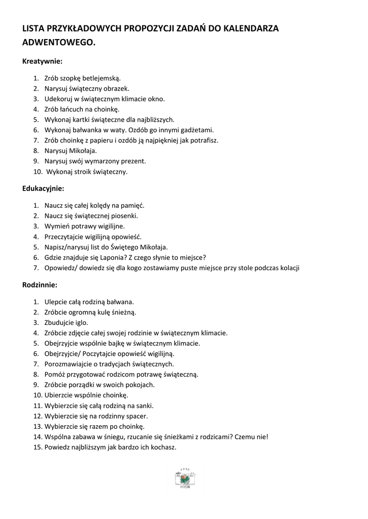 LISTA PRZYKŁADOWYCH PROPOZYCJI ZADAŃ DO KALENDARZA ADWENTOWEGO. Kreatywnie: 1. Zrób szopkę betlejemską. 2. Narysuj świąteczny obrazek. 3. Udekoruj w świątecznym klimacie okno. 4. Zrób łańcuch na choinkę. 5. Wykonaj kartki świąteczne dla najbliższych. 6. Wykonaj bałwanka w waty. Ozdób go innymi gadżetami. 7. Zrób choinkę z papieru i ozdób ją najpiękniej jak potrafisz. 8. Narysuj Mikołaja. 9. Narysuj swój wymarzony prezent. 10. Wykonaj stroik świąteczny. Edukacyjnie: 1. 2. 3. 4. 5. 6. 7. Naucz się całej kolędy na pamięć. Naucz się świątecznej piosenki. Wymień potrawy wigilijne. Przeczytajcie wigilijną opowieść. Napisz/narysuj list do Świętego Mikołaja. Gdzie znajduje się Laponia? Z czego słynie to miejsce? Opowiedz/ dowiedz się dla kogo zostawiamy puste miejsce przy stole podczas kolacji Rodzinnie: 1. Ulepcie całą rodziną bałwana. 2. Zróbcie ogromną kulę śnieżną. 3. Zbudujcie iglo. 4. Zróbcie zdjęcie całej swojej rodzinie w świątecznym klimacie. 5. Obejrzyjcie wspólnie bajkę w świątecznym klimacie. 6. Obejrzyjcie/ Poczytajcie opowieść wigilijną. 7. Porozmawiajcie o tradycjach świątecznych. 8. Pomóż przygotować rodzicom potrawę świąteczną. 9. Zróbcie porządki w swoich pokojach. 10. Ubierzcie wspólnie choinkę. 11. Wybierzcie się całą rodziną na sanki. 12. Wybierzcie się na rodzinny spacer. 13. Wybierzcie się razem po choinkę. 14. Wspólna zabawa w śniegu, rzucanie się śnieżkami z rodzicami? Czemu nie! 15. Powiedz najbliższym jak bardzo ich kochasz.