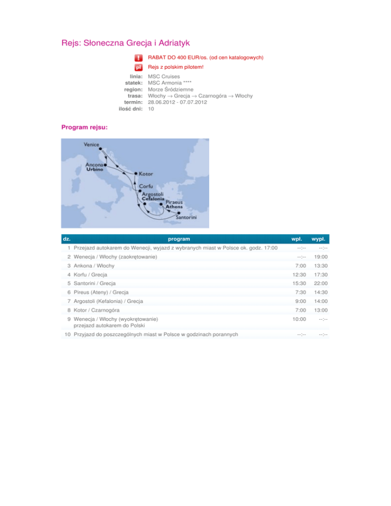 Rejs: Słoneczna Grecja i Adriatyk RABAT DO 400 EUR/os. (od cen katalogowych) Rejs z polskim pilotem! linia: statek: region: trasa: termin: ilość dni: MSC Cruises MSC Armonia **** Morze Śródziemne Włochy → Grecja → Czarnogóra → Włochy 28.06.2012 - 07.07.2012 10 Program rejsu: dz. program wpł. wypł. 1 Przejazd autokarem do Wenecji, wyjazd z wybranych miast w Polsce ok. godz. 17:00 --:-- --:-- 2 Wenecja / Włochy (zaokrętowanie) --:-- 19:00 3 Ankona / Włochy 7:00 13:30 4 Korfu / Grecja 12:30 17:30 5 Santorini / Grecja 15:30 22:00 6 Pireus (Ateny) / Grecja 7:30 14:30 7 Argostoli (Kefalonia) / Grecja 9:00 14:00 8 Kotor / Czarnogóra 7:00 13:00 10:00 --:-- --:-- --:-- 9 Wenecja / Włochy (wyokrętowanie) przejazd autokarem do Polski 10 Przyjazd do poszczególnych miast w Polsce w godzinach porannych 28 czerwiec 2012 (czwartek) - 7 lipiec 2012 (sobota) kategoria* cena katalogowa cena promocyjna kabina wewnętrzna 1.079 ÷ 1.319 615 ÷ 839 kabina zewnętrzna z oknem 1.429 ÷ 1.669 815 ÷ 1.059 kabina zewnętrzna z balkonem od 2179 od 1219 3 lub 4 osoba dorosła w kabinie 799 559 3 lub 4 dziecko w kabinie 199 199 (cena zawiera opłaty portowe i ubezpieczenie) opłaty portowe 125 125 przejazd autokarem (opcjonalnie) Zobacz pozostałe terminy: ok. 400 - 600 PLN/os. * Ceny za osobę w EUR w kabinie dwuosobowej 24.05.2012 | 28.06.2012 | 16.08.2012 | 13.09.2012 Informacje dodatkowe: cena za rejs obejmuje: rejs statkiem MSC Armonia ****, zakwaterowanie w kabinie wybranej kategorii (7 noclegów); serwis bagażowy i kabinowy; wyżywienie – 3 główne posiłki, przekąski między posiłkami, bufet lub przekąski o północy; korzystanie z basenu i innych urządzeń sportowo-rekreacyjnych; udział we wszystkich imprezach organizowanych na statku, opiekę polskiego pilota. cena nie obejmuje: opłat portowych i podatków; ubezpieczenia KL, NW, bagażu (125 EUR/os), kosztów dojazdu do portu; ewentualnych noclegów w hotelu przed/po rejsie i transferów (na zapytanie); wycieczek fakultatywnych; korzystania z punktów usługowych (pralnia, fotograf, salon piękności i odnowy biologicznej, internet); napojów do obiadów i kolacji, drinków oraz napiwków obowiązkowych dla obsługi statku (ok. 7€/dzień/osobę dorosłą; 3,5€/dzień/dziecko). uwagi: kabiny 3/4 osobowe nie są dostępne we wszystkich kategoriach, a ich liczba jest ograniczona – sprzedaż tylko po potwierdzeniu; ceny wycieczek fakultatywnych, propozycje dojazdu do portu, hoteli przed/po rejsie na zapytanie. DOJAZD DO WENECJI: proponujemy Państwu przejazd do Wenecji renomowanymi międzynarodowymi liniami autobusowymi. Wyjazdy m.in. z Katowic, Poznania, Wrocławia. Cena przejazdu w obie strony ok. 400-600 PLN.