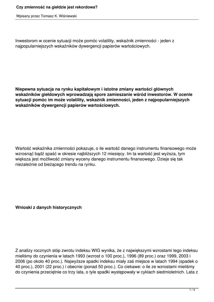 Czy zmienność na giełdzie jest rekordowa? Wpisany przez Tomasz K. Wiśniewski Inwestorom w ocenie sytuacji może pomóc volatility, wskaźnik zmienności - jeden z najpopularniejszych wskaźników dywergencji papierów wartościowych. Niepewna sytuacja na rynku kapitałowym i istotne zmiany wartości głównych wskaźników giełdowych wprowadzają spore zamieszanie wśród inwestorów. W ocenie sytuacji pomóc im może volatility, wskaźnik zmienności, jeden z najpopularniejszych wskaźników dywergencji papierów wartościowych. Wartość wskaźnika zmienności pokazuje, o ile wartość danego instrumentu finansowego może wzrosnąć bądź spaść w okresie najbliższych 12 miesięcy. Im ta wartość jest wyższa, tym większa jest możliwość zmiany wyceny danego instrumentu finansowego. Dzieje się tak niezależnie od bieżącego trendu na rynku. Wnioski z danych historycznych Z analizy rocznych stóp zwrotu indeksu WIG wynika, że z największymi wzrostami tego indeksu mieliśmy do czynienia w latach 1993 (wzrost o 100 proc.), 1996 (89 proc.) oraz 1999, 2003 i 2006 (po około 40 proc.). Najwyższe spadki indeksu miały zaś miejsce w latach 1994 (spadek o 40 proc.), 2001 (22 proc.) i obecnie (ponad 50 proc.). Co ciekawe: o ile ze wzrostami mieliśmy do czynienia przeciętnie co trzy lata, o tyle spadki występowały w cyklach siedmioletnich. Lata z 1/4 Czy zmienność na giełdzie jest rekordowa? Wpisany przez Tomasz K. Wiśniewski dodatnimi stopami zwrotu występowały prawie dwa razy częściej niż lata ze spadkami, przy tym wzrosty były zazwyczaj dwukrotnie wyższe niż spadki. Obserwację historycznych i bieżących wartości wskaźnika zmienności warto prowadzić równolegle z innymi charakterystykami rynku, w szczególności dziennymi stopami zwrotu. Najwyższa w dotychczasowej historii dzienna zmiana indeksu WIG miała miejsce na sesji 21 kwietnia 1994 r., kiedy to główny indeks giełdowy wzrósł po serii spektakularnych spadków aż o 15,9 proc. Z drugiej strony, najwyższy spadek indeksu WIG został zanotowany na sesji 11 kwietnia 1994 r. i wyniósł 10,7 proc. Kwiecień 1994 r. charakteryzował się w ogóle jedną z najwyższych wartości zmian sesyjnych w 18-letniej historii GPW. Pomiędzy 21 marca, a 28 kwietnia 1994 r. indeks WIG siedmiokrotnie spadł powyżej 8 proc., a tylko czterokrotnie wzrósł powyżej 5 proc. W sumie, na przestrzeni 18 sesji, wartość WIG zmalała aż o 45 proc.! Rekordy wskaźnika zmienności Za tak dynamicznymi dziennymi stopami zwrotu musiały oczywiście pójść duże wzrosty wartości wskaźnika zmienności. Wskaźnik osiągał swoje historyczne maksima w drugiej połowie kwietnia i w maju 1994 r. Wówczas na przestrzeni 16 sesji zmienność przekraczała 100 proc., co oznaczało, że w okresie najbliższych 12 miesięcy należało się liczyć ze wzrostem lub spadkiem rynku w powyższym przedziale. W historii giełdy jedynie wówczas i w połowie 1993 roku zmienność kształtowała się na poziomie 100 proc. 2/4 Czy zmienność na giełdzie jest rekordowa? Wpisany przez Tomasz K. Wiśniewski W późniejszym okresie wskaźnik ten spadł do pułapu około 60 proc., zaś od połowy 1995 r. do połowy 1997 r. nie przekraczał on poziomu 30 proc. Fakt ten jest szczególnie ciekawy z punktu widzenia rekordowych wzrostów, jakie miały miejsce w 1996 r. - w ich trakcie zmienność była stosunkowo niska. Prowadzi to do kolejnej konkluzji, iż ze wzrostami mamy do czynienia podczas niskiej zmienności. Kolejne duże wahania dziennych stóp zwrotu nastąpiły jesienią 1998 r. oraz na początku 2000 r. Warto zwrócić uwagę, że wysokie dzienne zmiany notowań były częściej efektem czynników negatywnych (kryzys w Rosji, koniec hossy internetowej) niż pozytywnych (poza latem 1993 r., choć wówczas także pojawiły się czynniki negatywne związane z puczem w Rosji). Od lutego 2000 r. do sierpnia 2008 r. dzienne zmiany indeksu WIG kształtowały się w przedziale +/- 5 proc. Oczywiście w tym okresie występowały pojedyncze sesje, kiedy dzienne zmiany przekraczały ten przedział, jednak nie miało to charakteru regularnego, nie trwało dłużej niż 2-3 sesje z rzędu. Dopiero jesień tego roku dramatycznie wybiła indeks WIG z blisko 8-letniego letargu. W okresie od kwietnia 2000 do maja 2006 r. uroczniony wskaźnik zmienności dla WIG ani razu nie przekroczył poziomu 30 proc. Dopiero na przełomie maja i czerwca 2006 r. wzrósł do 32 proc., aby następnie wrócić do przedziału 14-26 proc. Po raz kolejny zmienność wzrosła do 37 proc. w sierpniu 2007 r. i do 40 proc. w lutym b.r. Kolejna fala wzrostów zmienności została zapoczątkowana pod koniec sierpnia b.r., kiedy to wskaźnik wzrósł z 17 do ponad 50 proc. pod koniec października b.r. Ostatni raz zmienność na tak wysokim poziomie w przypadku WIG została odnotowana na początku 1999 r., czyli ponad 8 lat temu. Okres dynamicznych zmian na rynku kapitałowym, dużych sesyjnych wzrostów i spadków, często prowadzi do zwiększenia zainteresowania wskaźnikami, których rolą jest mierzenie tego typu tendencji. Funkcje te doskonale spełnia wskaźnik zmienności, który na podstawie historycznych obserwacji dziennych stóp zwrotu antycypuje przyszłe trendy rynkowe. Z analizy zmienności indeksu WIG za okres 18 lat wynika, iż historycznie najwyższa zmienność 3/4 Czy zmienność na giełdzie jest rekordowa? Wpisany przez Tomasz K. Wiśniewski dla tego indeksu miała miejsce w kwietniu 1994 r., kiedy wskaźnik ten wyniósł ponad 120 proc., zaś najniższa wartość tego wskaźnika wyniosła niespełna 7 proc. pod koniec września 2004 r. Dodatkowo na podstawie historycznych obserwacji można wyciągnąć kilka ciekawych wniosków. Po pierwsze: w większości przypadków duża zmienność była związana częściej z dużymi spadkami indeksu niż jego wzrostami. Tak było m.in. w latach 1994 i 2000. Z drugiej strony, największe wzrosty rynku były zazwyczaj z