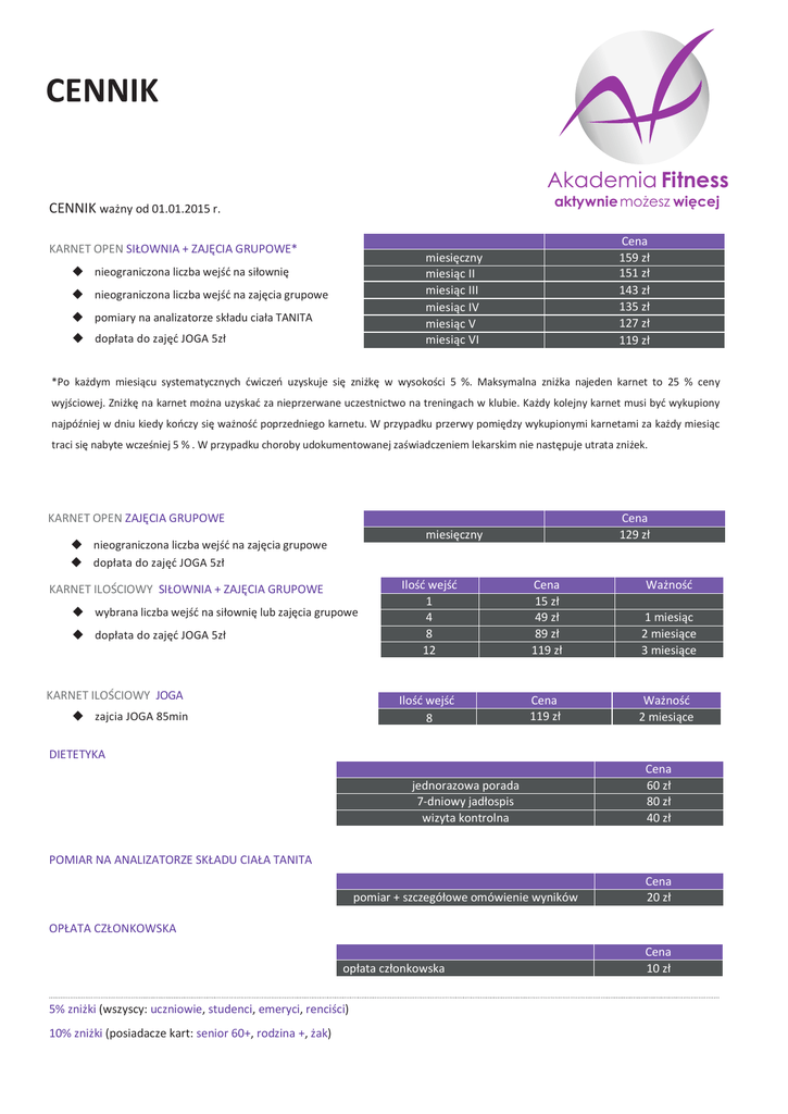 CENNIK Akademia Fitness aktywnie możesz więcej CENNIK ważny od 01.01.2015 r. KARNET OPEN SIŁOWNIA + ZAJĘCIA GRUPOWE* Cena 159 zł 151 zł 143 zł 135 zł 127 zł 119 zł miesięczny miesiąc II miesiąc III miesiąc IV miesiąc V miesiąc VI nieograniczona liczba wejść na siłownię nieograniczona liczba wejść na zajęcia grupowe pomiary na analizatorze składu ciała TANITA dopłata do zajęć JOGA 5zł *Po każdym miesiącu systematycznych ćwiczeń uzyskuje się zniżkę w wysokości 5 %. Maksymalna zniżka najeden karnet to 25 % ceny wyjściowej. Zniżkę na karnet można uzyskać za nieprzerwane uczestnictwo na treningach w klubie. Każdy kolejny karnet musi być wykupiony najpóźniej w dniu kiedy kończy się ważność poprzedniego karnetu. W przypadku przerwy pomiędzy wykupionymi karnetami za każdy miesiąc traci się nabyte wcześniej 5 % . W przypadku choroby udokumentowanej zaświadczeniem lekarskim nie następuje utrata zniżek. KARNET OPEN ZAJĘCIA GRUPOWE Cena 129 zł miesięczny nieograniczona liczba wejść na zajęcia grupowe dopłata do zajęć JOGA 5zł KARNET ILOŚCIOWY SIŁOWNIA + ZAJĘCIA GRUPOWE wybrana liczba wejść na siłownię lub zajęcia grupowe dopłata do zajęć JOGA 5zł KARNET ILOŚCIOWY JOGA zajcia JOGA 85min Ilość wejść 1 4 8 12 Cena 15 zł 49 zł 89 zł 119 zł 1 miesiąc 2 miesiące 3 miesiące Ilość wejść 8 Cena 119 zł Ważność 2 miesiące DIETETYKA Ważność jednorazowa porada 7-dniowy jadłospis wizyta kontrolna Cena 60 zł 80 zł 40 zł pomiar + szczegółowe omówienie wyników Cena 20 zł POMIAR NA ANALIZATORZE SKŁADU CIAŁA TANITA OPŁATA CZŁONKOWSKA opłata członkowska 5% zniżki (wszyscy: uczniowie, studenci, emeryci, renciści) 10% zniżki (posiadacze kart: senior 60+, rodzina +, żak) Cena 10 zł