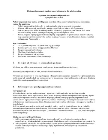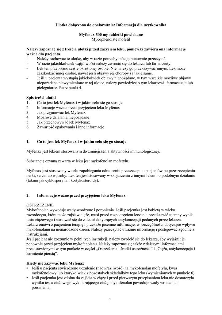 Ulotka dołączona do opakowania: Informacja dla użytkownika Myfenax 500 mg tabletki powlekane Mycophenolate mofetil Należy zapoznać się z treścią ulotki przed zażyciem leku, ponieważ zawiera ona informacje ważne dla pacjenta. Należy zachować tę ulotkę, aby w razie potrzeby móc ją ponownie przeczytać. W razie jakichkolwiek wątpliwości należy zwrócić się do lekarza lub farmaceuty. Lek ten przepisano ściśle określonej osobie. Nie należy go przekazywać innym. Lek może zaszkodzić innej osobie, nawet jeśli objawy jej choroby są takie same. Jeśli u pacjenta wystąpią jakiekolwiek objawy niepożądane, w tym wszelkie możliwe objawy niepożądane niewymienione w tej ulotce, należy powiedzieć o tym lekarzowi, farmaceucie lub pielęgniarce. Patrz punkt 4. Spis treści ulotki 1. Co to jest lek Myfenax i w jakim celu się go stosuje 2. Informacje ważne przed przyjęciem leku Myfenax 3. Jak przyjmować lek Myfenax Możliwe działania niepożądane 4. 5. Jak przechowywać lek Myfenax Zawartość opakowania i inne informacje 6. 1. Co to jest lek Myfenax i w jakim celu się go stosuje Myfenax jest lekiem stosowanym do zmniejszenia aktywności immunologicznej. Substancją czynną zawartą w leku jest mykofenolan mofetylu. Myfenax jest stosowany w celu zapobiegania odrzuceniu przeszczepu u pacjentów po przeszczepieniu nerki, serca lub wątroby. Lek ten jest stosowany w skojarzeniu z innymi lekami o podobnym działaniu (takimi jak cyklosporyna i kortykosteroidy). 2. Informacje ważne przed przyjęciem leku Myfenax OSTRZEŻENIE Mykofenolan wywołuje wady wrodzone i poronienia. Jeśli pacjentka jest kobietą w wieku rozrodczym, która może zajść w ciążę, musi przed rozpoczęciem leczenia przedstawić ujemny wynik testu ciążowego i stosować się do zaleceń dotyczących antykoncepcji podanych przez lekarza. Lekarz omówi z pacjentem terapię i przekaże pisemne informacje, w szczególności dotyczące wpływu mykofenolanu na nienarodzone dzieci. Należy przeczytać uważnie informację i postępować zgodnie z instrukcjami. Jeśli pacjent nie zrozumie w pełni tych instrukcji, należy zwrócić się do lekarza, aby wyjaśnił je ponownie przed przyjęciem mykofenolanu. Należy zapoznać się także z dalszymi informacjami przedstawionymi w tym punkcie w części „Ostrzeżenia i środki ostrożności” i „Ciąża, antykoncepcja i karmienie piersią”. Kiedy nie zażywać leku Myfenax • Jeśli u pacjenta stwierdzono uczulenie (nadwrażliwość) na mykofenolan mofetylu, kwas mykofenolowy lub którykolwiek z pozostałych składników tego leku (wymienionych w punkcie 6). • Jeśli pacjentka jest zdolna do zajścia w ciążę i przed pierwszym przepisaniem leku nie dostarczyła wyniku testu ciążowego wykluczającego ciążę, mykofenolan powoduje wady wrodzone i poronienia. 1 • W przypadku ciąży, planowania ciąży lub podejrzenia ciąży. • W przypadku niestosowania skutecznej antykoncepcji (patrz Ciąża, antykoncepcja i karmienie piersią). • W trakcie karmienia piersią. Nie należy stosować tego leku, jeśli którykolwiek z powyższych przypadków dotyczy pacjenta. W razie wątpliwości, należy przed przyjęciem leku Myfenax skonsultować się z lekarzem lub farmaceutą. Ostrzeżenia i środki ostrożności W następujących sytuacjach należy natychmiast omówić to z lekarzem: gdy występują jakiekolwiek objawy zakażenia (np. gorączka, ból gardła), bądź siniaki lub krwawienie z niewiadomej przyczyny. gdy obecnie występują lub kiedykolwiek u pacjenta występowały problemy dotyczące przewodu pokarmowego, na przykład choroba wrzodowa żołądka. gdy pacjentka planuje ciążę lub jeśli pacjentka zaszła w ciążę podczas przyjmowania leku Myfenax. Lek Myfenax osłabia mechanizmy obronne organizmu. Z tego powodu zwiększone jest ryzyko wystąpienia raka skóry. Dlatego należy ograniczyć narażenie skóry na działanie promieni słonecznych i promieni ultrafioletowych (UV) nosząc odpowiednią odzież ochronną i stosując filtry słoneczne o wysokim wskaźniku ochrony. Pacjent nie może oddawać krwi podczas leczenia lekiem Myfenax i co najmniej przez 6 tygodni po zakończeniu leczenia. Mężczyźni nie mogą oddawać nasienia w trakcie leczenia lekiem Myfenax i przez co najmniej 90 dni po zakończeniu leczenia. Dzieci i młodzież Myfenax stosowany jest u dzieci i młodzieży (w wieku od 2 do 18 lat) aby zapobiec odrzuceniu przeszczepionej nerki. Myfenax nie powinien być stosowany u dzieci i młodzieży (w wieku od 2 do 18 lat) po przeszczepieniu serca lub wątroby. Myfenax nie powinien być stosowany u dzieci w wieku poniżej 2 lat. Myfenax a inne leki Należy powiedzieć lekarzowi lub farmaceucie o wszystkich przyjmowanych ostatnio lekach, również tych, które wydawane są bez recepty. W następujących sytuacjach przed rozpoczęciem przyjmowania leku Myfenax należy skonsultować się z lekarzem: gdy pacjent stosuje inne preparaty zawierające: azatioprynę lub inne leki immunosupresyjne (leki, które czasami otrzymują pacjenci po zabiegu transplantacji), cholestyraminę (zazwyczaj stosowana u pacjentów, którzy mają duże stężenie cholesterolu we krwi), ryfampicynę (antybiotyk), leki zobojętniające sok żołądkowy lub inhibitory pompy protonowej (stosowane w razie problemów z kwasowością w żołądku, takich jak niestrawność), leki wiążące fosforany (stosowane u pacjentów z przewlekłą niewydolnością nerek w celu zmniejszenia wchłaniania fosforanów) lub jakiekolwiek inne leki (uwzględniając również leki sprzedawane bez recepty), o których lekarz prowadzący nie został poinformowany. gdy pacjent powinien otrzymać szczepionkę (zawierającą żywe bakterie). Lekarz zaleci odpowiednie postępowanie. Ciąża, antykoncepcja i karmienie piersią Antykoncepcja u kobiet przyjmujących lek Myfenax Jeśli pacjentka jest kobietą w wieku rozrodczym, która może zajść w ciążę, w trakcie leczenia l