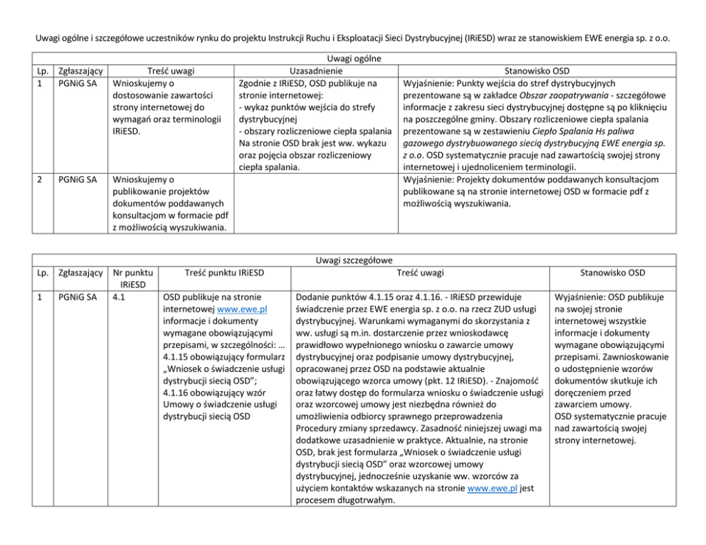 Uwagi ogólne i szczegółowe uczestników rynku do projektu Instrukcji Ruchu i Eksploatacji Sieci Dystrybucyjnej (IRiESD) wraz ze stanowiskiem EWE energia sp. z o.o. Lp. Zgłaszający Treść uwagi 1 PGNiG SA Wnioskujemy o dostosowanie zawartości strony internetowej do wymagań oraz terminologii IRiESD. 2 PGNiG SA Uwagi ogólne Uzasadnienie Zgodnie z IRiESD, OSD publikuje na stronie internetowej: - wykaz punktów wejścia do strefy dystrybucyjnej - obszary rozliczeniowe ciepła spalania Na stronie OSD brak jest ww. wykazu oraz pojęcia obszar rozliczeniowy ciepła spalania. Wnioskujemy o publikowanie projektów dokumentów poddawanych konsultacjom w formacie pdf z możliwością wyszukiwania. Stanowisko OSD Wyjaśnienie: Punkty wejścia do stref dystrybucyjnych prezentowane są w zakładce Obszar zaopatrywania - szczegółowe informacje z zakresu sieci dystrybucyjnej dostępne są po kliknięciu na poszczególne gminy. Obszary rozliczeniowe ciepła spalania prezentowane są w zestawieniu Ciepło Spalania Hs paliwa gazowego dystrybuowanego siecią dystrybucyjną EWE energia sp. z o.o. OSD systematycznie pracuje nad zawartością swojej strony internetowej i ujednoliceniem terminologii. Wyjaśnienie: Projekty dokumentów poddawanych konsultacjom publikowane są na stronie internetowej OSD w formacie pdf z możliwością wyszukiwania. Uwagi szczegółowe Lp. Zgłaszający 1 PGNiG SA Nr punktu IRiESD 4.1 Treść punktu IRiESD Treść uwagi Stanowisko OSD OSD publikuje na stronie internetowej www.ewe.pl informacje i dokumenty wymagane obowiązującymi przepisami, w szczególności: … 4.1.15 obowiązujący formularz „Wniosek o świadczenie usługi dystrybucji siecią OSD”; 4.1.16 obowiązujący wzór Umowy o świadczenie usługi dystrybucji siecią OSD Dodanie punktów 4.1.15 oraz 4.1.16. - IRiESD przewiduje świadczenie przez EWE energia sp. z o.o. na rzecz ZUD usługi dystrybucyjnej. Warunkami wymaganymi do skorzystania z ww. usługi są m.in. dostarczenie przez wnioskodawcę prawidłowo wypełnionego wniosku o zawarcie umowy dystrybucyjnej oraz podpisanie umowy dystrybucyjnej, opracowanej przez OSD na podstawie aktualnie obowiązującego wzorca umowy (pkt. 12 IRiESD). - Znajomość oraz łatwy dostęp do formularza wniosku o świadczenie usługi oraz wzorcowej umowy jest niezbędna również do umożliwienia odbiorcy sprawnego przeprowadzenia Procedury zmiany sprzedawcy. Zasadność niniejszej uwagi ma dodatkowe uzasadnienie w praktyce. Aktualnie, na stronie OSD, brak jest formularza „Wniosek o świadczenie usługi dystrybucji siecią OSD” oraz wzorcowej umowy dystrybucyjnej, jednocześnie uzyskanie ww. wzorców za użyciem kontaktów wskazanych na stronie www.ewe.pl jest procesem długotrwałym. Wyjaśnienie: OSD publikuje na swojej stronie internetowej wszystkie informacje i dokumenty wymagane obowiązującymi przepisami. Zawnioskowanie o udostępnienie wzorów dokumentów skutkuje ich doręczeniem przed zawarciem umowy. OSD systematycznie pracuje nad zawartością swojej strony internetowej. 2 PGNiG SA 21.1.3 W nominacjach i renominacjach ilości paliwa gazowego określane są w m3 w liczbach naturalnych 3 PGNiG SA 21.3.1 ZUD może dokonać renominacji godzinowych ilości paliwa gazowego określonych w zatwierdzonej przez OSD nominacji dla danej doby gazowej. Renominacja może zostać złożona do godziny 14:00 doby gazowej, której renominacja dotyczy. Renominacja godzinowych ilości paliwa gazowego może być złożona najpóźniej na dwie (2) godziny przed pierwszą godziną, dla której będzie zmieniana nominacja. Stoimy na stanowisku, że nominacje powinny być składane w kWh tak jak ma to miejsce w innych systemach dystrybucyjnych i przesyłowym. Moc umowna podawana jest w instrukcji w kWh (w tym kwalifikacja punktów do nominacji). Przekroczenie mocy jest powodem odrzucenia nominacji (punkt 21.1.4). Stoimy na stanowisku, że nie można ograniczać prawa ZUD do składania renominacji jedynie do godziny 14:00. System przesyłowy zezwala składać renominacje do godziny 3 w nocy doby gazowej której dotyczy z zastrzeżeniem 2 godzin wyprzedzenia (ostatnia efektywna godzina to 5:00 danej doby gazowej). System dystrybucyjny PSG Sp. z o.o. zezwala na składanie renominacji do 1 w nocy doby której dotyczy renominacja z zastrzeżeniem 2 godzin wyprzedzenia (czyli ostatnia renominacja dotyczy zmian od 3 w nocy). Pozwala to realnie wpływać na bilans oraz nominacje. Zastrzeżeniem czasu do godziny 14:00 w praktyce pozbawia ZUD możliwości wpływu na nominacje i bilans w danej dobie. Ponieważ IRiESD przewiduje kary za niedotrzymanie nominacji to powinna również przewidywać możliwość jego uniknięcia takie jak zapewniają inne instrukcje zatwierdzone już do stosowania przez Prezesa URE. Uwaga uwzględniona Wyjaśnienie: OSD umożliwia składanie renominacji w miarę posiadanych możliwości.