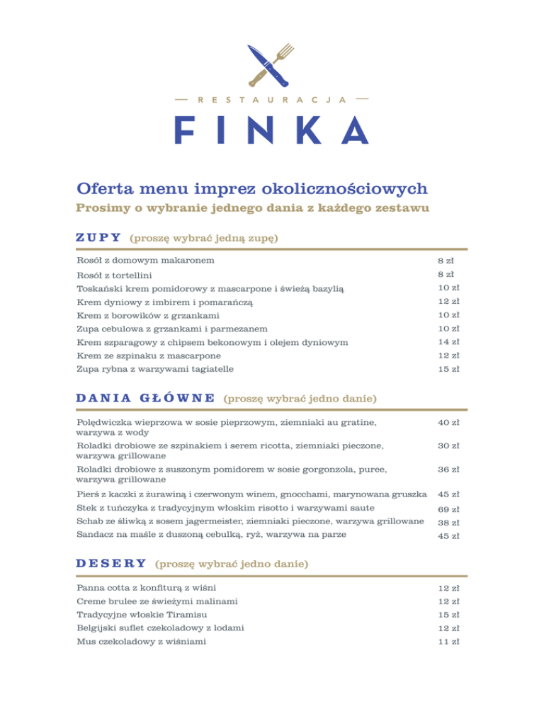 Oferta menu imprez okolicznościowych Prosimy o wybranie jednego dania z każdego zestawu Z U P Y (proszę wybrać jedną zupę) Rosół z domowym makaronem 8 zł Rosół z tortellini 8 zł Toskański krem pomidorowy z mascarpone i świeżą bazylią 10 zł Krem dyniowy z imbirem i pomarańczą 12 zł Krem z borowików z grzankami 10 zł Zupa cebulowa z grzankami i parmezanem 10 zł Krem szparagowy z chipsem bekonowym i olejem dyniowym 14 zł Krem ze szpinaku z mascarpone 12 zł Zupa rybna z warzywami tagiatelle 15 zł D A N I A G Ł Ó W N E (proszę wybrać jedno danie) Polędwiczka wieprzowa w sosie pieprzowym, ziemniaki au gratine, warzywa z wody 40 zł Roladki drobiowe ze szpinakiem i serem ricotta, ziemniaki pieczone, warzywa grillowane 30 zł Roladki drobiowe z suszonym pomidorem w sosie gorgonzola, puree, warzywa grillowane 36 zł Pierś z kaczki z żurawiną i czerwonym winem, gnocchami, marynowana gruszka 45 zł Stek z tuńczyka z tradycyjnym włoskim risotto i warzywami saute 69 zł Schab ze śliwką z sosem jagermeister, ziemniaki pieczone, warzywa grillowane 38 zł Sandacz na maśle z duszoną cebulką, ryż, warzywa na parze 45 zł D E S E R Y (proszę wybrać jedno danie) Panna cotta z konfiturą z wiśni 12 zł Creme brulee ze świeżymi malinami 12 zł Tradycyjne włoskie Tiramisu 15 zł Belgijski suflet czekoladowy z lodami 12 zł Mus czekoladowy z wiśniami 11 zł MENU DLA DZIECI w cenie 45 zł/osoba Zupa: Rosołek z makaronem Danie główne: Fileciki drobiowe z dodatkami (frytki lub ziemniaki i surówka) Deser: jw. PRZEKĄSKI ZIMNE (proszę wybrać 5 przekąsek i 1 sałatkę) 35zł/osoba Tatar z wołowiny Hereford Pierś kacza z żurawiną Ruloniki z szynki z kremem chrzanowym Szpinakowe roladki z wędzonym łososiem Carpaccio wołowe Skandynawski chleb domowy z łososiem Sałatka z gruszką i gorgonzolą Sałatka z kozim serem Sałatka Cezar Sałatka z arbuzem i oliwkami Caprese Tatar z łososia na cykorii Pieczywo Masło NAPOJE pakiet na osobę w cenie od 15 do 20zł (zależy od czasu trwania imprezy) Kawa i herbata – bez ograniczeń Napoje owocowe – bez ograniczeń Woda z cytryną – bez ograniczeń