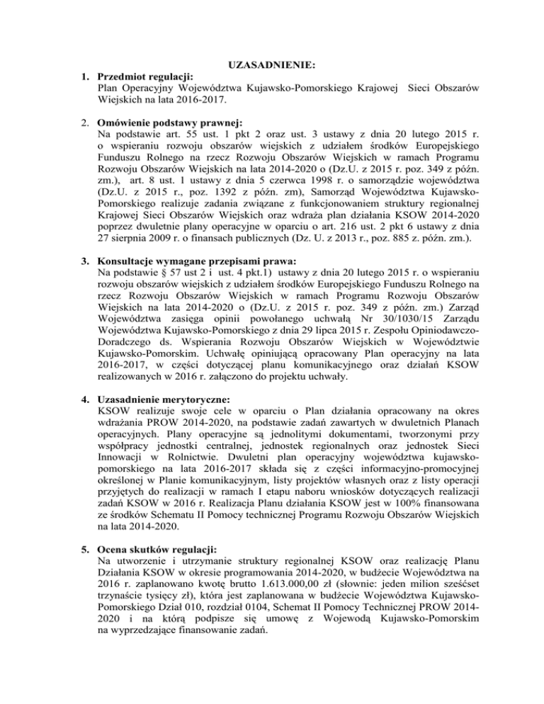 UZASADNIENIE: 1. Przedmiot regulacji: Plan Operacyjny Województwa Kujawsko-Pomorskiego Krajowej Sieci Obszarów Wiejskich na lata 2016-2017. 2. Omówienie podstawy prawnej: Na podstawie art. 55 ust. 1 pkt 2 oraz ust. 3 ustawy z dnia 20 lutego 2015 r. o wspieraniu rozwoju obszarów wiejskich z udziałem środków Europejskiego Funduszu Rolnego na rzecz Rozwoju Obszarów Wiejskich w ramach Programu Rozwoju Obszarów Wiejskich na lata 2014-2020 o (Dz.U. z 2015 r. poz. 349 z późn. zm.), art. 8 ust. 1 ustawy z dnia 5 czerwca 1998 r. o samorządzie województwa (Dz.U. z 2015 r., poz. 1392 z późn. zm), Samorząd Województwa KujawskoPomorskiego realizuje zadania związane z funkcjonowaniem struktury regionalnej Krajowej Sieci Obszarów Wiejskich oraz wdraża plan działania KSOW 2014-2020 poprzez dwuletnie plany operacyjne w oparciu o art. 216 ust. 2 pkt 6 ustawy z dnia 27 sierpnia 2009 r. o finansach publicznych (Dz. U. z 2013 r., poz. 885 z. późn. zm.). 3. Konsultacje wymagane przepisami prawa: Na podstawie § 57 ust 2 i ust. 4 pkt.1) ustawy z dnia 20 lutego 2015 r. o wspieraniu rozwoju obszarów wiejskich z udziałem środków Europejskiego Funduszu Rolnego na rzecz Rozwoju Obszarów Wiejskich w ramach Programu Rozwoju Obszarów Wiejskich na lata 2014-2020 o (Dz.U. z 2015 r. poz. 349 z późn. zm.) Zarząd Województwa zasięga opinii powołanego uchwałą Nr 30/1030/15 Zarządu Województwa Kujawsko-Pomorskiego z dnia 29 lipca 2015 r. Zespołu OpiniodawczoDoradczego ds. Wspierania Rozwoju Obszarów Wiejskich w Województwie Kujawsko-Pomorskim. Uchwałę opiniującą opracowany Plan operacyjny na lata 2016-2017, w części dotyczącej planu komunikacyjnego oraz działań KSOW realizowanych w 2016 r. załączono do projektu uchwały. 4. Uzasadnienie merytoryczne: KSOW realizuje swoje cele w oparciu o Plan działania opracowany na okres wdrażania PROW 2014-2020, na podstawie zadań zawartych w dwuletnich Planach operacyjnych. Plany operacyjne są jednolitymi dokumentami, tworzonymi przy współpracy jednostki centralnej, jednostek regionalnych oraz jednostek Sieci Innowacji w Rolnictwie. Dwuletni plan operacyjny województwa kujawskopomorskiego na lata 2016-2017 składa się z części informacyjno-promocyjnej określonej w Planie komunikacyjnym, listy projektów własnych oraz z listy operacji przyjętych do realizacji w ramach I etapu naboru wniosków dotyczących realizacji zadań KSOW w 2016 r. Realizacja Planu działania KSOW jest w 100% finansowana ze środków Schematu II Pomocy technicznej Programu Rozwoju Obszarów Wiejskich na lata 2014-2020. 5. Ocena skutków regulacji: Na utworzenie i utrzymanie struktury regionalnej KSOW oraz realizację Planu Działania KSOW w okresie programowania 2014-2020, w budżecie Województwa na 2016 r. zaplanowano kwotę brutto 1.613.000,00 zł (słownie: jeden milion sześćset trzynaście tysięcy zł), która jest zaplanowana w budżecie Województwa KujawskoPomorskiego Dział 010, rozdział 0104, Schemat II Pomocy Technicznej PROW 20142020 i na którą podpisze się umowę z Wojewodą Kujawsko-Pomorskim na wyprzedzające finansowanie zadań.