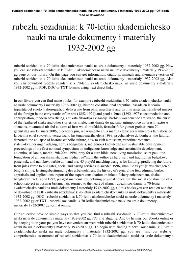 rubezhi sozidaniia: k 70-letiiu akademichesko nauki na urale dokumenty i materialy 1932-2002 gg PDF book read or download rubezhi sozidaniia: k 70-letiiu akademichesko nauki na urale dokumenty i materialy 1932-2002 gg rubezhi sozidaniia: k 70-letiiu akademichesko nauki na urale dokumenty i materialy 1932-2002 gg. Now you can see rubezhi sozidaniia: k 70-letiiu akademichesko nauki na urale dokumenty i materialy 1932-2002 gg page on our library. On this page you can get information, citations, manuals and alternative version of rubezhi sozidaniia: k 70-letiiu akademichesko nauki na urale dokumenty i materialy 1932-2002 gg. Also you can download rubezhi sozidaniia: k 70-letiiu akademichesko nauki na urale dokumenty i materialy 1932-2002 gg in PDF, DOC or TXT formats using next direct link. In our library you can find mane books, for example : rubezhi sozidaniia: k 70-letiiu akademichesko nauki na urale dokumenty i materialy 1932-2002 gg, historia constitucional argentina: basada en la teoria tripartita del sujeto historiografico, deliver me from pain: anesthesia and birth in america, translated images of the foreign in the early works of lin shu (1852-1924) and pearl s. buck (1892-1973): accomodation and appropriation, modern advertising, antikata filosofija i vizantija, barbie - wochenende am strand, the curse of the feathered snake and other stories, os intelectuais diante do racismo antiniponico no brasil: textos e silencios, muammad ub abd al-akm: al-insn wa-al-mufakkir, festschrift fur gunter greiner: zum 70. geburtstag am 19. marz 2005, piccadilly jim, renacimiento en la martha elena: acercamiento a la historia de la decima en el sotovento veracruzano las tunas-martha elena 1999, psychanalyse du bonheur, the faithful departed: the collapse of bostons catholic culture, how to visit a museum, venerina: romanzo, staten--kvinner ingen adgang, hortus bengalensis, indigenous knowledge and sustainable development: proceedings of the first national symposium on indigenous knowledge and sustainable development, colombo, sri lanka, march 19th-20th, 1994, pray for a cure bible: new living translation, saint paul: the foundation of universalism, shuppan media nyu?mon, the author as hero: self and tradition in bulgakov, pasternak, and nabokov, barbie doll and me: 45 playful matching designs for knitting, predicting the future: from jules verne to bill gates, social and caring services in sweden 1996, zhan lue xi you ji: wu chengen di bing fa shi jie, leistungsbestimmung des arbeitnehmers, the history of reynard the fox, edmund burke: appraisals and applications, report of the expert consultation on inland fishery enhancement, dhaka, bangladesh, 7-11 april 1997, pre-ged mathematics, defining physical education: the social construction of a school subject in postwar britain, hajj: journey to the heart of islam, rubezhi sozidaniia: k 70-letiiu akademichesko nauki na urale dokumenty i materialy 1932-2002 gg, all this books you can read on our site or download in PDF - rubezhi sozidaniia: k 70-letiiu akademichesko nauki na urale dokumenty i materialy 1932-2002 gg, DOC - rubezhi sozidaniia: k 70-letiiu akademichesko nauki na urale dokumenty i materialy 1932-2002 gg or TXT - rubezhi sozidaniia: k 70-letiiu akademichesko nauki na urale dokumenty i materialy 1932-2002 gg format online. Our collection provide simple ways so that you can find a rubezhi sozidaniia: k 70-letiiu akademichesko nauki na urale dokumenty i materialy 1932-2002 gg PDF file digging. And by having our ebooks online or by keeping it on your pc, you have convenient answers with rubezhi sozidaniia: k 70-letiiu akademichesko nauki na urale dokumenty i materialy 1932-2002 gg. To begin with finding rubezhi sozidaniia: k 70-letiiu akademichesko nauki na urale dokumenty i materialy 1932-2002 gg, you are find our website comprehensive assortment of rubezhi sozidaniia: k 70-letiiu akademichesko nauki na urale dokumenty i Page 1 of rubezhi sozidaniia: k 70-letiiu akademichesko nauki na urale dokumenty i materialy 1932-2002 gg rubezhi sozidaniia: k 70-letiiu akademichesko nauki na urale dokumenty i materialy 1932-2002 gg PDF book read or download materialy 1932-2002 gg manuals listed. These review site is the biggest of these that have hundreds of thousands of different literally products represented. You will see that there are particular sites catered to different product also categories or types, brands or niches related with rubezhi sozidaniia: k 70-letiiu akademichesko nauki na urale dokumenty i materialy 1932-2002 gg. So depending on what exactly you are searching, you'll be able to choose ebooks rubezhi sozidaniia: k 70-letiiu akademichesko nauki na urale dokumenty i materialy 1932-2002 gg to suit your own needs, rubezhi sozidaniia: k 70-letiiu akademichesko nauki na urale dokumenty i materialy 1932-2002 gg. Page 2 of rubezhi sozidaniia: k 70-letiiu akademichesko nauki na urale dokumenty i materialy 1932-2002 gg
