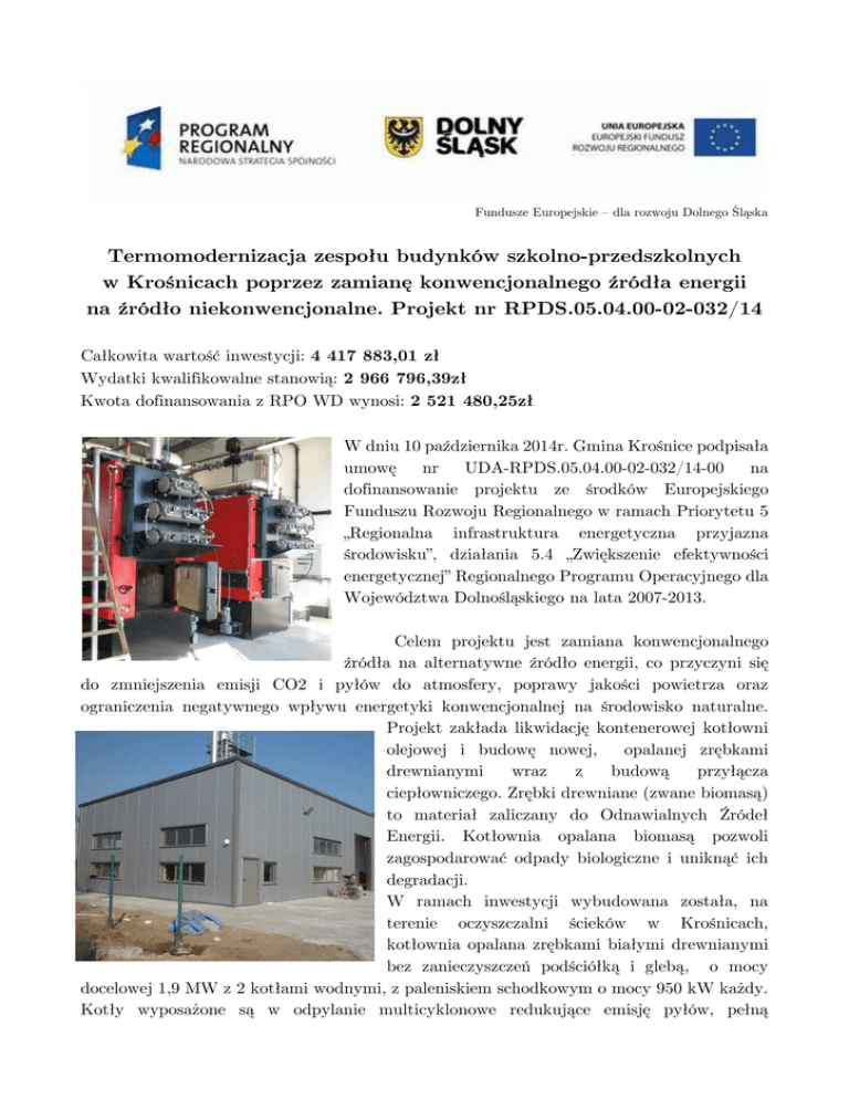 Fundusze Europejskie – dla rozwoju Dolnego Śląska Termomodernizacja zespołu budynków szkolno-przedszkolnych w Krośnicach poprzez zamianę konwencjonalnego źródła energii na źródło niekonwencjonalne. Projekt nr RPDS.05.04.00-02-032/14 Całkowita wartość inwestycji: 4 417 883,01 zł Wydatki kwalifikowalne stanowią: 2 966 796,39zł Kwota dofinansowania z RPO WD wynosi: 2 521 480,25zł W dniu 10 października 2014r. Gmina Krośnice podpisała umowę nr UDA-RPDS.05.04.00-02-032/14-00 na dofinansowanie projektu ze środków Europejskiego Funduszu Rozwoju Regionalnego w ramach Priorytetu 5 „Regionalna infrastruktura energetyczna przyjazna środowisku”, działania 5.4 „Zwiększenie efektywności energetycznej” Regionalnego Programu Operacyjnego dla Województwa Dolnośląskiego na lata 2007-2013. Celem projektu jest zamiana konwencjonalnego źródła na alternatywne źródło energii, co przyczyni się do zmniejszenia emisji CO2 i pyłów do atmosfery, poprawy jakości powietrza oraz ograniczenia negatywnego wpływu energetyki konwencjonalnej na środowisko naturalne. Projekt zakłada likwidację kontenerowej kotłowni olejowej i budowę nowej, opalanej zrębkami drewnianymi wraz z budową przyłącza ciepłowniczego. Zrębki drewniane (zwane biomasą) to materiał zaliczany do Odnawialnych Źródeł Energii. Kotłownia opalana biomasą pozwoli zagospodarować odpady biologiczne i uniknąć ich degradacji. W ramach inwestycji wybudowana została, na terenie oczyszczalni ścieków w Krośnicach, kotłownia opalana zrębkami białymi drewnianymi bez zanieczyszczeń podściółką i glebą, o mocy docelowej 1,9 MW z 2 kotłami wodnymi, z paleniskiem schodkowym o mocy 950 kW każdy. Kotły wyposażone są w odpylanie multicyklonowe redukujące emisję pyłów, pełną automatykę sterującą oraz sondę O2 umożliwiającą kontrolę procesu spalania. Kotły znajdują się w budynku żelbetowo-stalowym o kubaturze 1400m³. W ramach projektu powstał również zadaszony magazyn opału o pow. około 200m². Ponadto zakres projektu obejmował również roboty związane z wykonaniem ogrodzenia, oświetleniem terenu oraz drogi wewnętrznej wraz z placem manewrowym. Wykonawcą robót budowlanych została firma NOMAR Zakład Projektowania i kompletacji Dostaw Marek Nowak z Wrocławia, z którą podpisano umowę w dniu 29 sierpnia 2014r. Nadzór nad robotami prowadzony był przez Biuro Inżynierskie „THULIE” na podstawie umowy z dnia 2 września 2014r. Realizacja projektu, której celem jest zastąpienie paliwa stałego w formie oleju opałowego i gazu zrębkami drewnianymi, będzie miała zasadniczy wpływ na wykorzystanie odnawialnych źródeł energii przez gminę, poprawę stanu środowiska naturalnego oraz znaczne obniżenie kosztów wyprodukowania jednego GJ energii. Projekt przyczyni się również do zwiększenia ilości miejsc pracy, gdyż przewiduje zatrudnienie dwóch osób do obsługi kotłowni. Projekt współfinansowany przez Unię Europejską z Europejskiego Funduszu Rozwoju Regionalnego w ramach Regionalnego Programu Operacyjnego dla Województwa Dolnośląskiego na lata 2007-2013.