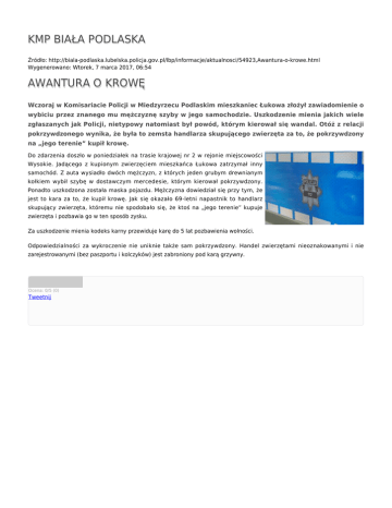 KMP BIAŁA PODLASKA Źródło: http://biala-podlaska.lubelska.policja.gov.pl/lbp/informacje/aktualnosci/54923,Awantura-o-krowe.html Wygenerowano: Wtorek, 7 marca 2017, 06:54 AWANTURA O KROWĘ Wczoraj w Komisariacie Policji w Miedzyrzecu Podlaskim mieszkaniec Łukowa złożył zawiadomienie o wybiciu przez znanego mu mężczyznę szyby w jego samochodzie. Uszkodzenie mienia jakich wiele zgłaszanych jak Policji, nietypowy natomiast był powód, którym kierował się wandal. Otóż z relacji pokrzywdzonego wynika, że była to zemsta handlarza skupującego zwierzęta za to, że pokrzywdzony na „jego terenie” kupił krowę. Do zdarzenia doszło w poniedziałek na trasie krajowej nr 2 w rejonie miejscowości Wysokie. Jadącego z kupionym zwierzęciem mieszkańca Łukowa zatrzymał inny samochód. Z auta wysiadło dwóch mężczyzn, z których jeden grubym drewnianym kołkiem wybił szybę w dostawczym mercedesie, którym kierował pokrzywdzony. Ponadto uszkodzona została maska pojazdu. Mężczyzna dowiedział się przy tym, że jest to kara za to, że kupił krowę. Jak się okazało 69-letni napastnik to handlarz skupujący zwierzęta, któremu nie spodobało się, że ktoś na „jego terenie” kupuje zwierzęta i pozbawia go w ten sposób zysku. Za uszkodzenie mienia kodeks karny przewiduje karę do 5 lat pozbawienia wolności. Odpowiedzialności za wykroczenie nie uniknie także sam pokrzywdzony. Handel zwierzętami nieoznakowanymi i nie zarejestrowanymi (bez paszportu i kolczyków) jest zabroniony pod karą grzywny. Ocena: 0/5 (0) Tweetnij