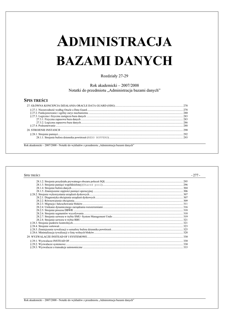 ADMINISTRACJA BAZAMI DANYCH Rozdziaáy 27-29 Rok akademicki – 2007/2008 Notatki do przedmiotu „Administracja bazami danych” SPIS TREĝCI 27. GàÓWNA KONCEPCJA DZIAàANIA ORACLE DATA GUARD (ODG) ................................................................................................... 278 § 27.1. NiezawodnoĞü wedáug Oracle a Data Guard ............................................................................................................................................ 278 § 27.2. Funkcjonowanie i ogólny zarys mechanizmu. ......................................................................................................................................... 280 § 27.3. Logiczna i fizyczna zastĊpcza baza danych ............................................................................................................................................. 283 27.3.1. Fizyczna zapasowa baza danych ..................................................................................................................................................... 283 27.3.2. Logiczna zapasowa baza danych ..................................................................................................................................................... 286 § 27.4. Podsumowanie .......................................................................................................................................................................................... 288 28. STROJENIE INSTANCJI ................................................................................................................................................................................... 290 § 28.1. Strojenie pamiĊci....................................................................................................................................................................................... 292 28.1.1. Strojenie bufora dziennika powtórzeĔ (REDO BUFFERS) ............................................................................................................ 293 Rok akademicki – 2007/2008 - Notatki do wykáadów z przedmiotu „Administracja bazami danych” SPIS TREĝCI 28.1.2. Strojenie przydziaáu prywatnego obszaru poleceĔ SQL ................................................................................................................. 295 28.1.3. Strojenie pamiĊci wspóádzielonej (Shared pool)...................................................................................................................... 296 28.1.4. Strojenie bufora danych ................................................................................................................................................................... 304 28.1.5. Zmniejszenie zajĊtoĞci pamiĊci operacyjnej ................................................................................................................................... 306 § 28.2. Strojenie wykorzystania urządzeĔ dyskowych ......................................................................................................................................... 307 28.2.1. Diagnostyka obciąĪenia urządzeĔ dyskowych ................................................................................................................................ 307 28.2.2. RównowaĪenie obciąĪenia............................................................................................................................................................... 309 28.2.3. Migracja i áaĔcuchowanie bloków................................................................................................................................................... 311 28.2.4. Unikanie dynamicznego zarządzania rozszerzeniami ..................................................................................................................... 316 28.2.5. Strojenie procesu DBWR ................................................................................................................................................................ 318 28.2.6. Strojenie segmentów wycofywania ................................................................................................................................................. 318 28.2.7. Strojenie serwera w trybie SMU- System Management Undo ....................................................................................................... 319 28.2.8. Strojenie serwera w trybie RBU ...................................................................................................................................................... 321 § 28.3. Strojenie punktów kontrolnych................................................................................................................................................................. 321 § 28.4. Strojenie sortowaĔ .................................................................................................................................................................................... 323 § 28.5. Zmniejszenie rywalizacji o semafory bufora dziennika powtórzeĔ ......................................................................................................... 325 § 28.6. Minimalizacja rywalizacji o listĊ wolnych bloków .................................................................................................................................. 328 29. WYZWALACZE INSTEAD OF I SYSTEMOWE ............................................................................................................................................ 330 § 29.1. Wyzwalacze INSTEAD OF ...................................................................................................................................................................... 330 § 29.2. Wyzwalacze systemowe ...............................................................................................................................