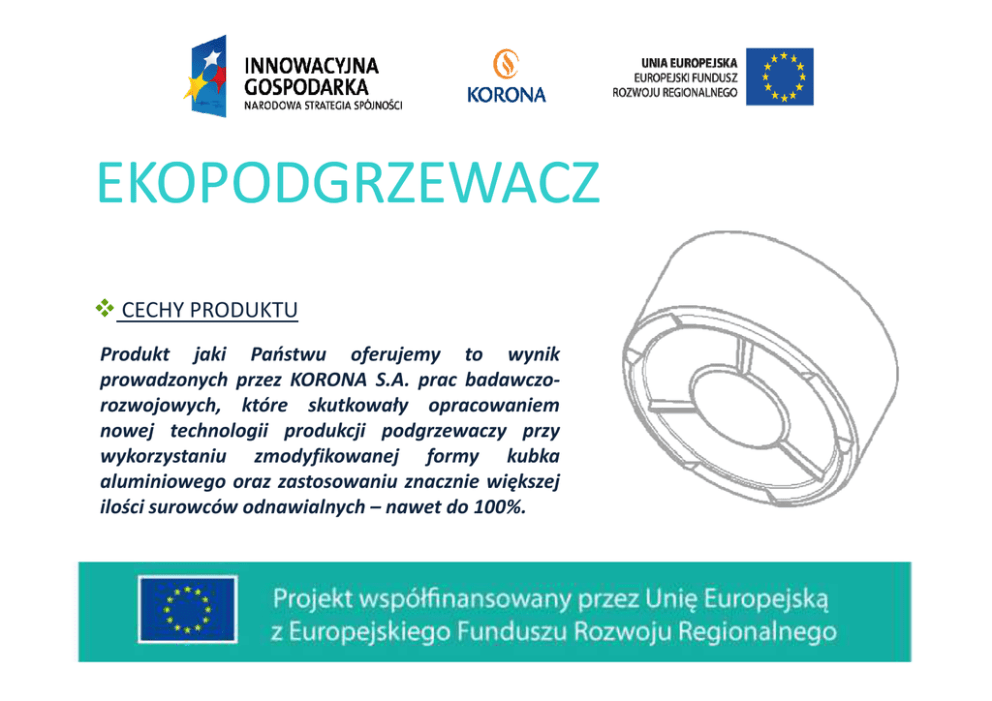 EKOPODGRZEWACZ CECHY PRODUKTU Produkt jaki Państwu oferujemy to wynik prowadzonych przez KORONA S.A. prac badawczorozwojowych, które skutkowały opracowaniem nowej technologii produkcji podgrzewaczy przy wykorzystaniu zmodyfikowanej formy kubka aluminiowego oraz zastosowaniu znacznie większej ilości surowców odnawialnych – nawet do 100%. NOWA FORMA KUBKA MNIEJSZE RESZTKI Opracowany przez pracowników KORONA S.A. kubek charakteryzuje się m.in. istnieniem kanalików odprowadzających mieszankę surowcową do części centralnej kubka. Po wypaleniu pozostaje znacznie mniej resztek niż przy tradycyjnych rozwiązaniach. ok. 0,5-0,6g zamiast 2,0g BEZPIECZEŃSTWO Zmniejszona została wysokość kubka, co docelowo ograniczy ilość odpadów produkcyjnych jak i użytkowych. 16,6 mm Zmiana dna kubka nadała mu większej stabilności podczas procesu spalania, a tym samym znacznie ograniczone zostało ryzyko przesuwania się pływaka z knotem. • podgrzewacz tradycyjny • Ekopodgrzewacz REDUKCJA WAGI PRODUKTU 13 gr. 12 gr. Dzięki obniżeniu wysokości kubka możliwe stało się bardziej efektywne wykorzystanie środków transportu (więcej produktu na palecie transportowej) oraz zmniejszona została ilość wytwarzanych odpadów opakowaniowych. Przykład: pakiet podgrzewaczy ‘100 • podgrzewacz tradycyjny: 360 opakowań na palecie • Ekopodgrzewacz: 390 opakowań na palecie DANE KONTAKTOWE KORONA SA Fabryczna 10 98-300 Wieluń Tel. 043 843 77 00 Fax. 043 843 77 88 15,5 mm Budowa kubka umożliwia również docelowe zmniejszenie wagi produktu do ok. 12 gram bez uszczerbku dla cech jakościowych oraz parametrów użytkowych. PRZEWAGA LOGISTYCZNA Budowa kubka zapewnia również odpowiednią wentylację dna, która zabezpiecza przed odparzeniem na powierzchni na której ustawione są podgrzewacze w trakcie procesu spalania. [email protected] www.korona.info