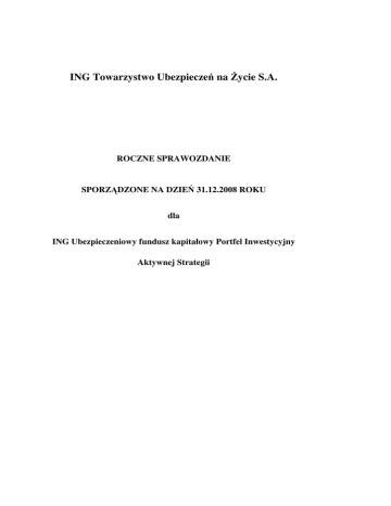 ING Towarzystwo Ubezpieczeń na Życie S.A. ROCZNE SPRAWOZDANIE SPORZĄDZONE NA DZIEŃ 31.12.2008 ROKU dla ING Ubezpieczeniowy fundusz kapitałowy Portfel Inwestycyjny Aktywnej Strategii ING Ubezpieczeniowy fundusz kapitałowy Portfel Inwestycyjny Aktywnej Strategii AKTYWA NETTO FUNDUSZU Aktywa netto funduszu (w zł) I. 1. 2. 3. 3.1. 3.2. 4. II. 1. 2. 3. III. Aktywa Lokaty Środki pieniężne Należności, w tym Z tytułu zbycia składników portfela inwestycyjnego Pozostałe należności Pozostałe aktywa Zobowiązania Z tytułu nabytych składników portfela inwestycyjnego Zobowiązania wobec ubezpieczających lub uprawnionych z umów ubezpieczenia Pozostałe zobowiązania Aktywa netto (I-II) stan na dzień 31.12.2007 415 343,25 415 333,22 0,00 10,03 0,00 10,03 0,00 477,40 0,00 0,00 477,40 414 865,85 stan na dzień 31.12.2008 2 575 291,40 2 517 722,04 1 234,47 56 334,89 56 334,89 0,00 0,00 4 506,64 0,00 0,00 4 506,64 2 570 784,76 stan na dzień 31.12.2007 0,00 417 088,63 417 961,94 417 946,06 0,00 15,88 7,94 7,94 873,31 0,00 0,00 299,38 0,00 0,00 0,00 stan na dzień 31.12.2008 414 865,85 2 823 815,27 3 135 765,65 3 090 332,24 0,00 45 433,41 2 262,24 43 171,17 311 950,38 154 256,58 0,00 32 416,40 45 318,11 0,00 0,00 573,93 0,00 0,00 0,00 0,00 -2 222,78 36 788,12 0,00 43 171,17 0,00 43 171,17 -655 298,34 0,00 0,00 0,00 0,00 0,00 0,00 0,00 0,00 0,00 0,00 0,00 0,00 0,00 0,00 -657 171,89 ZMIANY AKTYWÓW NETTO FUNDUSZU Zmiany aktywów netto funduszu (w zł) A. B. I. 1. 2. 3. 3a. 3b. II. 1. 2. 3. 4. 5. 6. 7. 8. 9. 9a. 9b. C. 1. 2. 3. 4. 5. 6. 7. 8. 9. 10. 11. 12. 13. 14. D. E. F. Aktywa netto funduszu na początek okresu Stan netto z działalności operacyjnej (I-II) Zwiększenia funduszu Tytułem składek zwiększających wartość funduszu Tytułem udzielonych gwarancji Pozostałe zwiększenia Przeniesienia z pozostałych funduszy Inne (w tym przydział środków własnych) Zmniejszenia funduszu Tytułem wykupu Tytułem wypłat pozostałych świadczeń ubezpieczeniowych Tytułem opłaty za ryzyko ubezpieczeniowe oraz innych opłat potrącanych z funduszu Tytułem zwrotu składek ubezpieczeniowych Tytułem prowizji od składek Tytułem pozostałych prowizji Tytułem opłat za zarządzanie funduszem oraz innych opłat tytułem administrowania funduszem Tytułem udzielonych gwarancji Pozostałe zmniejszenia Przeniesienia do pozostałych funduszy Inne (w tym wycofanie środków własnych) Przychody netto z działalności inwestycyjnej (po potrąceniu kosztów) z papierów wartościowych emitowanych, poręczonych lub gwarantowanych przez Skarb Państwa lub organizacje międzynarodowe, których członkiem jest Rzeczpospolita Polska z obligacji emitowanych lub poręczonych przez jednostki samorządu terytorialnego lub związki jednostek samorządu terytorialnego z listów zastawnych z innych dłużnych papierów wartościowych o stałej stopie dochodu z innych dłużnych papierów wartościowych o zmiennej stopie dochodu z akcji z udziałów z jednostek uczestnictwa lub certyfikatów inwestycyjnych w funduszach inwestycyjnych z instrumentów pochodnych, o ile służą zmniejszeniu ryzyka związanego z innymi aktywami stanowiącymi pokrycie rezerw techniczno-ubezpieczeniowych z innych papierów wartościowych o zmiennej stopie dochodu z pożyczek z nieruchomości z depozytów bankowych z lokat dokonanych za zezwoleniem organu nadzoru, zgodnie z art. 154 ust. 9 ustawy o działalności ubezpieczeniowej Pozostałe zwiększenia Pozostałe zmniejszenia Aktywa netto funduszu na koniec okresu sprawozdawczego -2 279,60 56,82 0,00 0,00 0,00 0,00 1 873,55 0,00 0,00 0,00 414 865,85 0,00 11,34 12 609,36 2 570 784,76 0,00 0,00 0,00 0,00 KOSZTY FUNDUSZU za okres 01.01.200731.12.2007 0,00 0,00 0,00 0,00 573,93 0,00 573,93 Koszty funduszu (w zł) 1. 2. 3. 4. 5. 6. 7. Koszty prowadzenia i obsługi rachunków bankowych Koszty nabycia jednostek rozrachunkowych Koszty przechowywania aktywów funduszu Koszty transakcyjne Koszty zarządzania i administrowania funduszem Pozostałe koszty RAZEM koszty funduszu (suma poz. 1-6): za okres 01.01.200831.12.2008 0,00 0,00 0,00 0,00 36 788,12 0,00 36 788,12 LICZBA I WARTOŚĆ JEDNOSTEK ROZRACHUNKOWYCH stan na dzień 31.12.2007 Liczba i wartość jednostek rozrachunkowych 1. 1.1 1.2 2. 2.1 2.2 2.3 2.4 Liczba jednostek rozrachunkowych: liczba jednostek rozrachunkowych na początek okresu sprawozdawczego liczba jednostek rozrachunkowych na koniec okresu sprawozdawczego Wartość jednostki rozrachunkowej (w zł): wartość jednostki rozrachunkowej na początek okresu sprawozdawczego minimalna wartość jednostki rozrachunkowej w okresie sprawozdawczym maksymalna wartość jednostki rozrachunkowej w okresie sprawozdawczym wartość jednostki rozliczeniowej na koniec okresu sprawozdawczego stan na dzień 31.12.2008 0,00000 44 460,79049 44 460,79049 383 573,52457 10,00000 9,24425 10,11031 9,33105 9,33105 6,19943 9,32051 6,70220 ZESTAWIENIE LOKAT FUNDUSZU stan na dzień 31.12.2007 Lokaty 1. 1.1. 1.1.1 1.1.2 1.1.3 1.1.4 1.1.5 1.1.6 1.1.7 1.1.8 1.1.9 1.1.10 1.1.11 1.2. 2. 3. 3.1. 3.2. 3.3. 3.4. Jednostki uczestnictwa lub certyfikaty inwestycyjne w funduszach inwestycyjnych Jednostki uczestnictwa Subfundusz Dłużnych Papierów Wartościowych SKARBIEC - DEPOZYTOWY ING Subfundusz Selektywny Plus Pioneer Obligacji FIO Subfundusz Akcji SKARBIEC - AKCJA Subfundusz UniKorona Pieniężny Subfundusz UniKorona Akcje ING FIO Akcji Legg Mason Akcji FIO Subfundusz UniKorona Obligacje DWS Polska FIO Akcji Plus ING FIO Obligacji Certyfikaty inwestycyjne Depozyty bankowe Razem lokaty, w tym: Ulokowane na terenie RP Ulokowane poza terenem RP, ale na terenie krajów członkowskich UE Ulokowane poza terenem RP i UE, ale na terenie krajów członkowskich OECD Ulokowane poza terenem RP, UE i OECD Ilość Wartość bilansowa (w szt.) (w zł) Udział w aktywach funduszu (w %) stan na dzień 31.12.2008 Udział w Wartość Ilość aktywach bilansowa funduszu (w szt.) (w zł) (w %) 4 311,27 415 318,23 100,00 27 3