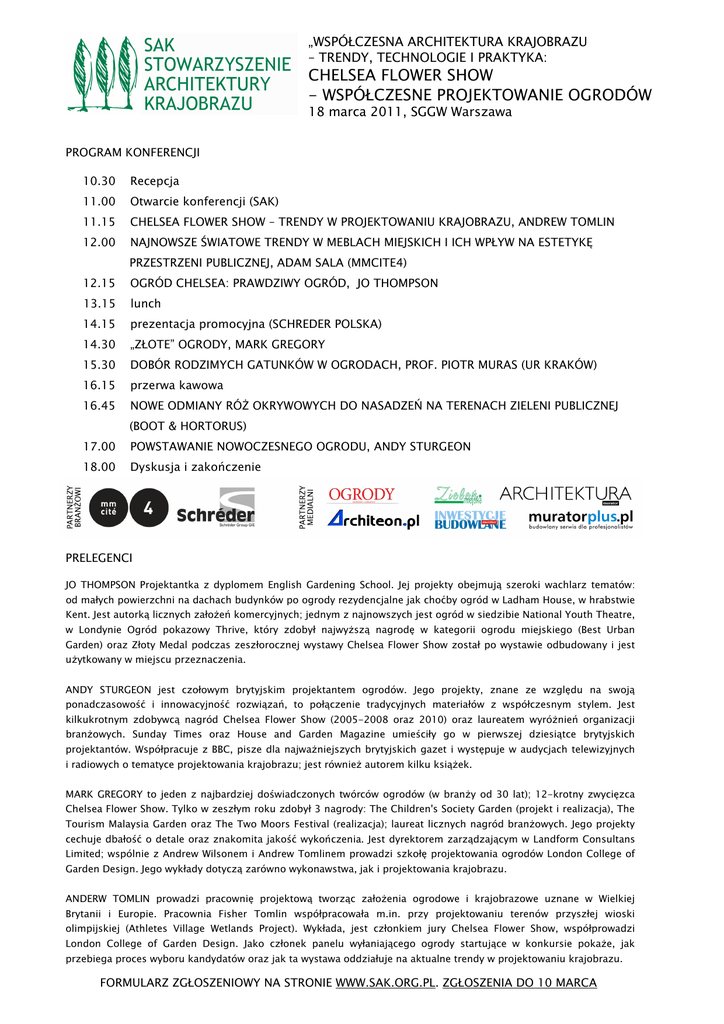 „WSPÓŁCZESNA ARCHITEKTURA KRAJOBRAZU – TRENDY, TECHNOLOGIE I PRAKTYKA: CHELSEA FLOWER SHOW - WSPÓŁCZESNE PROJEKTOWANIE OGRODÓW 18 marca 2011, SGGW Warszawa PROGRAM KONFERENCJI 10.30 Recepcja 11.00 Otwarcie konferencji (SAK) 11.15 CHELSEA FLOWER SHOW – TRENDY W PROJEKTOWANIU KRAJOBRAZU, ANDREW TOMLIN 12.00 NAJNOWSZE ŚWIATOWE TRENDY W MEBLACH MIEJSKICH I ICH WPŁYW NA ESTETYKĘ PRZESTRZENI PUBLICZNEJ, ADAM SALA (MMCITE4) 12.15 OGRÓD CHELSEA: PRAWDZIWY OGRÓD, JO THOMPSON 13.15 lunch 14.15 prezentacja promocyjna (SCHREDER POLSKA) 14.30 „ZŁOTE” OGRODY, MARK GREGORY 15.30 DOBÓR RODZIMYCH GATUNKÓW W OGRODACH, PROF. PIOTR MURAS (UR KRAKÓW) 16.15 przerwa kawowa 16.45 NOWE ODMIANY RÓś OKRYWOWYCH DO NASADZEŃ NA TERENACH ZIELENI PUBLICZNEJ (BOOT & HORTORUS) 17.00 POWSTAWANIE NOWOCZESNEGO OGRODU, ANDY STURGEON 18.00 Dyskusja i zakończenie PRELEGENCI JO THOMPSON Projektantka z dyplomem English Gardening School. Jej projekty obejmują szeroki wachlarz tematów: od małych powierzchni na dachach budynków po ogrody rezydencjalne jak choćby ogród w Ladham House, w hrabstwie Kent. Jest autorką licznych załoŜeń komercyjnych; jednym z najnowszych jest ogród w siedzibie National Youth Theatre, w Londynie Ogród pokazowy Thrive, który zdobył najwyŜszą nagrodę w kategorii ogrodu miejskiego (Best Urban Garden) oraz Złoty Medal podczas zeszłorocznej wystawy Chelsea Flower Show został po wystawie odbudowany i jest uŜytkowany w miejscu przeznaczenia. ANDY STURGEON jest czołowym brytyjskim projektantem ogrodów. Jego projekty, znane ze względu na swoją ponadczasowość i innowacyjność rozwiązań, to połączenie tradycyjnych materiałów z współczesnym stylem. Jest kilkukrotnym zdobywcą nagród Chelsea Flower Show (2005-2008 oraz 2010) oraz laureatem wyróŜnień organizacji branŜowych. Sunday Times oraz House and Garden Magazine umieściły go w pierwszej dziesiątce brytyjskich projektantów. Współpracuje z BBC, pisze dla najwaŜniejszych brytyjskich gazet i występuje w audycjach telewizyjnych i radiowych o tematyce projektowania krajobrazu; jest równieŜ autorem kilku ksiąŜek. MARK GREGORY to jeden z najbardziej doświadczonych twórców ogrodów (w branŜy od 30 lat); 12-krotny zwycięzca Chelsea Flower Show. Tylko w zeszłym roku zdobył 3 nagrody: The Children's Society Garden (projekt i realizacja), The Tourism Malaysia Garden oraz The Two Moors Festival (realizacja); laureat licznych nagród branŜowych. Jego projekty cechuje dbałość o detale oraz znakomita jakość wykończenia. Jest dyrektorem zarządzającym w Landform Consultans Limited; wspólnie z Andrew Wilsonem i Andrew Tomlinem prowadzi szkołę projektowania ogrodów London College of Garden Design. Jego wykłady dotyczą zarówno wykonawstwa, jak i projektowania krajobrazu. ANDERW TOMLIN prowadzi pracownię projektową tworząc załoŜenia ogrodowe i krajobrazowe uznane w Wielkiej Brytanii i Europie. Pracownia Fisher Tomlin współpracowała m.in. przy projektowaniu terenów przyszłej wioski olimpijskiej (Athletes Village Wetlands Project). Wykłada, jest członkiem jury Chelsea Flower Show, współprowadzi London College of Garden Design. Jako członek panelu wyłaniającego ogrody startujące w konkursie pokaŜe, jak przebiega proces wyboru kandydatów oraz jak ta wystawa oddziałuje na aktualne trendy w projektowaniu krajobrazu. FORMULARZ ZGŁOSZENIOWY NA STRONIE WWW.SAK.ORG.PL. ZGŁOSZENIA DO 10 MARCA