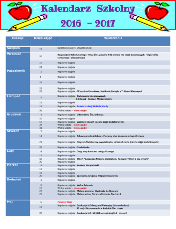 Kalendarz Szkolny 2016 - 2017 Miesiąc Sierpień Wrzesień Październik Listopad Grudzień Styczeń Luty Marzec Kwiecień Dzień Zajęć 27 Dodatkowe zapisy, Otwarta Szkoła 10 Rozpoczęcie Roku Szkolnego - Msza Św . godzina 9:00 am (nie ma zajęć dodatkowych: religii, kółka tanecznego i plastycznego) 17 Regularne zajęcia 24 Regularne zajęcia 1 Regularne zajęcia 8 Regularne zajęcia 15 Regularne zajęcia 22 29 Regularne zajęcia Regularne zajęcia – Wyjazd na Cmentarze, Spotkanie Zarządu z Trójkami Klasowymi 12 Regularne zajęcia - Ślubowanie klas pierwszych 6 listopad - Konkurs Miedzyszkolny Regularne zajęcia 19 Regularne zajęcia - Bankiet z okazji 40-lecia Szkoly 26 Wolna sobota – nie ma zajęć 5 3 Regularne zajęcia - Odwiedziny Św. Mikołaja 10 17 24 31 7 Regularne zajęcia Regularne zajęcia - Wigilie w klasach (nie ma zajęć dodatkowych) Wolna sobota – nie ma zajęć Wolna sobota – nie ma zajęć Regularne zajęcia 14 Regularne zajęcia - Zabawa przedszkolaków - Pierwszy etap konkursu ortograficznego 21 Regularne zajęcia - Program Świąteczny, wywiadówka, sprzedaż ciasta (nie ma zajęć dodatkowych) 28 Regularne zajęcia – Studniówka 4 Regularne zajęcia - Drugi etap konkursu ortograficznego 11 18 25 4 Regularne zajęcia Regularne zajęcia – Dzień Pluszowego Misia w przedszkolu, Konkurs: “Wiem o czy czytam” Regularne zajęcia Regularne zajęcia - Konkurs Recytatorski 11 Regularne zajęcia 18 25 Regularne zajęcia Regularne zajęcia - Spotkanie Zarządu z Trójkami Klasowymi 1 8 15 22 29 Maj Wydarzenia 6 13 20 Regularne zajęcia Regularne zajęcia - Walne Zebranie Wolna sobota – nie ma zajęć Regularne zajęcia - Matura pisemna, Wycieczka do Muzeum Regularne zajęcia - Matura ustna, Pierwsza Komunia Św. klas 2 Parada 3 Maja Regularne zajęcia - Graduacja kl.0-Program Wakacyjny (klasy młodsze) 17 maj - Bierzmowanie w Kościele Św. Izaaka Regularne zajęcia - Graduacja kl.8 i kl.3 LO (uczestniczą kl.5 - Liceum)