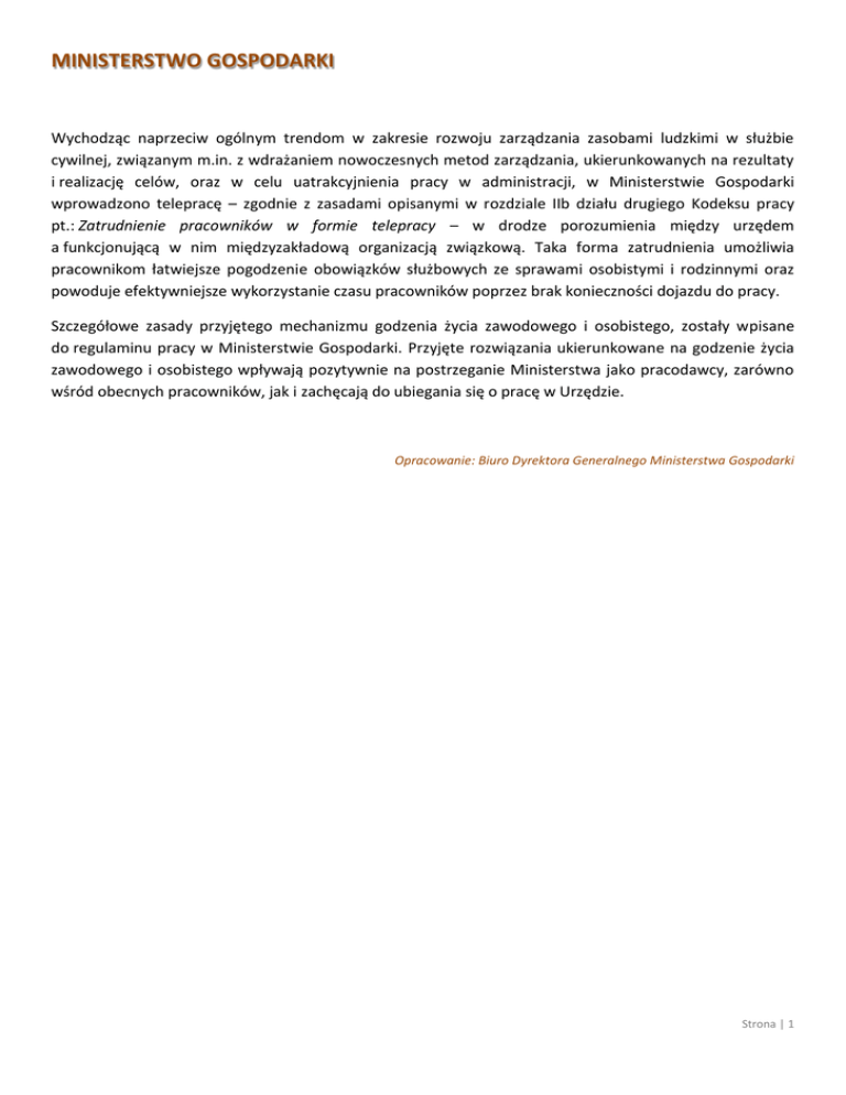 MINISTERSTWO GOSPODARKI Wychodząc naprzeciw ogólnym trendom w zakresie rozwoju zarządzania zasobami ludzkimi w służbie cywilnej, związanym m.in. z wdrażaniem nowoczesnych metod zarządzania, ukierunkowanych na rezultaty i realizację celów, oraz w celu uatrakcyjnienia pracy w administracji, w Ministerstwie Gospodarki wprowadzono telepracę – zgodnie z zasadami opisanymi w rozdziale IIb działu drugiego Kodeksu pracy pt.: Zatrudnienie pracowników w formie telepracy – w drodze porozumienia między urzędem a funkcjonującą w nim międzyzakładową organizacją związkową. Taka forma zatrudnienia umożliwia pracownikom łatwiejsze pogodzenie obowiązków służbowych ze sprawami osobistymi i rodzinnymi oraz powoduje efektywniejsze wykorzystanie czasu pracowników poprzez brak konieczności dojazdu do pracy. Szczegółowe zasady przyjętego mechanizmu godzenia życia zawodowego i osobistego, zostały wpisane do regulaminu pracy w Ministerstwie Gospodarki. Przyjęte rozwiązania ukierunkowane na godzenie życia zawodowego i osobistego wpływają pozytywnie na postrzeganie Ministerstwa jako pracodawcy, zarówno wśród obecnych pracowników, jak i zachęcają do ubiegania się o pracę w Urzędzie. Opracowanie: Biuro Dyrektora Generalnego Ministerstwa Gospodarki Strona | 1