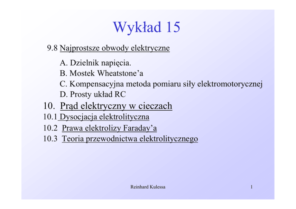 Wykład 15 9.8 Najprostsze obwody elektryczne A. Dzielnik napięcia. B. Mostek Wheatstone’a C. Kompensacyjna metoda pomiaru siły elektromotorycznej D. Prosty układ RC 10. Prąd elektryczny w cieczach 10.1 Dysocjacja elektrolityczna 10.2 Prawa elektrolizy Faraday’a 10.3 Teoria przewodnictwa elektrolitycznego Reinhard Kulessa 1 9.8 Najprostsze obwody elektryczne W tej części omówimy krótko kilka najprostszych obwodów elektrycznych. A. Dzielnik napięcia. I R U I = R U A U x = I ⋅ Rx Rx Ux = U ⋅ R Rx (9.29) V Reinhard Kulessa 2 U I’ W przypadku gdy obciążymy dzielnik oporem RA napięcie Ua ulegnie zmianie na UA’ , przy czym A R U A' = I A R 1' gdzie R1 IA R2 UA’ RA R1' = R1 R A ( R1 + R A ) I = U /( R + R2 ) ' ' 1 Napięcie UA’ będzie więc równe: R1RA U U U A' = I R = = R1RA R1 + RA R2 (R1 + RA ) R2 + 1+ R1 + RA R1RA ' ' 2 Reinhard Kulessa 3 B. Mostek Wheatstone’a Mostek Wheatstone’a jest najbardziej znanym układem do pomiaru oporu elektrycznego. C I=0 R0 Rx G I1 I2 I2 R1 A I R2 I1 B D U Opór mierzony wpinamy pomiędzy punktami C i B. R0 jest znanym oporem. Reinhard Kulessa 4 Suwak na oporze AB przesuwamy tak długo, aż w gałęzi CD nie popłynie prąd. Oznacza to równość potencjałów w punktach C i D. Rozważając oczko ACD otrzymujemy; R0 I 1 − R1 I 2 = 0 R0 I 1 = R1 I 2 . Z kolei rozważając oczko CBD otrzymujemy; Rx I1 − R2 I 2 = 0 Rx I1 = R2 I 2 . Dzieląc drugą linijkę tych równań przez siebie, otrzymujemy; R2 R x = R0 R1 Reinhard Kulessa (9.29) 5 C. Kompensacyjna metoda pomiaru siły elektromotorycznej Metoda ta jest podobna do wyznaczania oporów w oparciu o mostek Wheatstone’a. D Ux – szukana SEM I02 Ix Ux Rwx G Rg Ix I02 A I0 I01 Ix1 Ix2 U0 – znana SEM I0 R1 R2 C B Ix2 U0 Rw0 + Reinhard Kulessa 6 Zmieniamy ustawienie suwaka na oporze AB tak długo, aż w galwanometrze przestanie płynąć prąd. Wtedy wiemy, że; I x = I 02 Prąd w każdej gałęzi jest algebraiczną sumą prądów pochodzących od każdej siły elektromotorycznej oddzielnie, przy czym muszą zostać uwzględnione opory wewnętrzne wszystkich ogniw. Musimy również uwzględnić opór galwanometru. Dla prądów związanych z szukaną siłą elektromotoryczną otrzymamy w oparciu o Prawa Kirchoffa; I x = I x1 + I x 2 I x ( Rg + Rwx ) + I x1R1 = U x I x 2 ( R2 + Rw0 ) − I x1R1 = 0 Reinhard Kulessa . 7 Dla prądów wywołanych przez siłę elektromotoryczną U0 otrzymamy; I 0 = I 01 + I 02 I 02 ( Rg + Rwx ) − I 01R1 = 0 . I 0 ( R2 + Rw0 ) + I 01R1 = U0 Z układu podanych równań można znaleźć Ix1 i Ix2 w funkcji oporów i Ux , oraz I01 i I02 w funkcji tych samych oporów i U0. Z warunku znikania prądu w galwanometrze I 02 = I x otrzymujemy, Ux = Rw0 R1 U0 + R1 + R 2 . (9.30) Gdy Rw0 << R=R1+R2, metoda ta jest dokładna. Reinhard Kulessa 8 Zakładając wypadkowe prądy w poszczególnych gałęziach mamy; D I2 Ux Rwx I2 G Rg I1 I0 R1 A I0 U0 – znana SEM R2 B C + - U0Rw0 Zakładając kierunki prądu takie jak na rysunku, oraz że opór wewnętrzny galwanometru Rg = 0, możemy napisać Reinhard Kulessa 9 I 0 = I1 + I 2 − I 0 ( R2 + Rw0 ) − I1R1 = U0 I 2 Rwx − I1R1 = U x Ustawiając suwak w punkcie D tak, aby przez galwanometr nie płynął prąd, czyli I2 = 0, mamy I 0 = I1 U x = − I 1 R1 − U0 I1 = ( R1 + R2 + R w 0 ) R1 U x = U0 + Rw0 Reinhard R Kulessa 10 D. Prosty układ RC + Jeśli zamykamy obwód kluczem K, to w chwili t=0 łączymy nie naładowany kondensator ze źródłem siły elektromotorycznej U. UC R + - U W oparciu o II Prawo Kirchoffa mamy; I G U − U C − IR = 0 K Oznaczając chwilowe natężenie Prądu w obwodzie I, oraz chwilowe napięcie na okładkach kondensatora przez UC, otrzymamy: Reinhard Kulessa 11 dQ I= dt Q UC = C Po podstawieniu do poprzedniego równania otrzymamy: Q dQ U− −R =0 C dt Po przekształceniu i podzieleniu przez R otrzymamy: dQ 1 U + Q− =0 dt RC R Rozwiązanie tego równania ma postać: Q C = CU (1 − e Reinhard Kulessa − 1 t RC ) 12 Ponieważ : U C = QC / C , napięcie na kondensatorze, będzie się więc zmieniało zgodnie z równaniem: UC 1 t − = U 1 − e RC . (9.31) Iloczyn RC ma wymiar czasu i jest nazwany czasem relaksacji. Wstawiając wyrażenie na czasową zależność napięcia na kondensatorze do naszego wyjściowego równania, otrzymamy wzór na czasową zależność natężenia prądu ładującego kondensator. Reinhard Kulessa 13 U I = e R − 1 t RC Przebieg natężenia prądu w obwodzie w czasie ładowania kondensatora. Przebieg napięcia na kondensatora w czasie ładowania. UC I U U/R t t Reinhard Kulessa 14 10. Prąd elektryczny w cieczach 10.1 Dysocjacja elektrolityczna Powszechnie znany jest fakt, że wiele czystych cieczy źle przewodzi prąd elektryczny. Do wody destylowanej np.. wystarczy dodać roztworu NaCl czy H2SO4 , aby stała się ona dobrym przewodnikiem. Jeśli w takim roztworze umieścimy elektrody, to będą się na nich wydzielały składniki roztworów. Takie przewodniki nazywamy elektrolitami. Przepływ prądu w elektrolicie polega na poruszaniu się jonów pod wpływem przyłożonego pola elektrycznego. Rozpad związków chemicznych na cząsteczki składowe pod wpływem rozpuszczalnika nazywamy dysocjacją elektrolityczną. Reinhard Kulessa 15 Najbardziej znane są elektrolity następujących soli: CuSO 4 → Cu 2 + + SO 24 - H 2 SO 4 → 2H NaCl + + S0 24 - → Na + Cl - Ilościowo rozpad cząsteczek na jony określa współczynnik dysocjacji elektrolitycznej α. Należy pamiętać, że w roztworze cząsteczki nie tylko ulegają dysocjacji, lecz również rekombinacji, tak, że zwykle dochodzi do stanu równowagi. Jeżeli w jednostce objętości roztworu znajduje się n0 cząsteczek, a n1 z nich jest zdysocjowanych na jony, to n1 = α n0 (10.1) gdzie α jest współczynnikiem dysocjacji. Reinhard Kulessa 16 Dla czystej wody współczynnik dysocjacji α = 1.7·10-9. Dla 0.0001 mola/litr roztworu KCl, α = 0.993, a dla 1 mola/litr KCl, α =0.757. 10.2 Prawa elekt