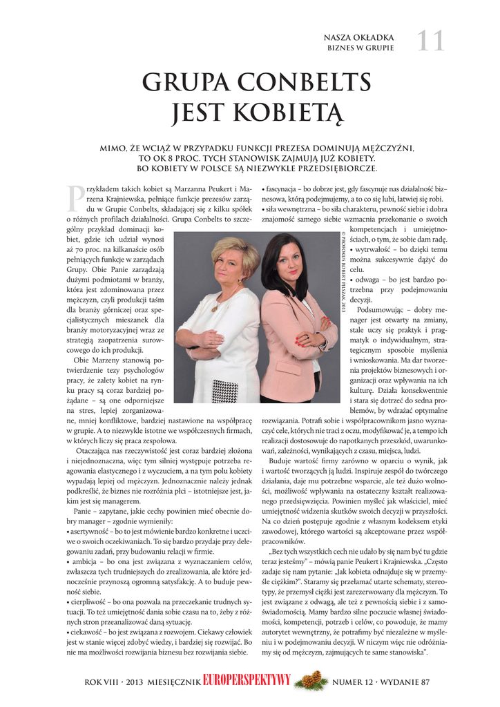 NASZA OKŁADKA BIZNES W GRUPIE 11 GRUPA CONBELTS JEST KOBIETĄ MIMO, ŻE WCIĄŻ W PRZYPADKU FUNKCJI PREZESA DOMINUJĄ MĘŻCZYŹNI, TO OK 8 PROC. TYCH STANOWISK ZAJMUJĄ JUŻ KOBIETY. BO KOBIETY W POLSCE SĄ NIEZWYKLE PRZEDSIĘBIORCZE. P Ü=8J:PE8:A8á9F;F9IQ<A<JK>;P=8J:PELA<E8J;Q@8ö8CEFȴǣ9@Qá nesowa, którą podejmujemy, a to co się lubi, łatwiej się robi. ÜJ@ö8N<NEǴKIQE8á9FJ@ö8:?8I8BK<ILG<NEFȴǣJ@<9@<@˓;F9I8 znajomość samego siebie wzmacnia przekonanie o swoich kompetencjach i umiejętnościach, o tym, że sobie dam radę. Ü NPKIN8öFȴǣ á 9F ;Q@ǴB@ K<DL można sukcesywnie dążyć do celu. Ü F;N8>8 á 9F A<JK 98I;QF GFtrzebna przy podejmowaniu decyzji. Podsumowując – dobry menager jest otwarty na zmiany, stale uczy się praktyk i pragmatyk o indywidualnym, strategicznym sposobie myślenia i wnioskowania. Ma dar tworzenia projektów biznesowych i organizacji oraz wpływania na ich kulturę. Działa konsekwentnie i stara się dotrzeć do sedna problemów, by wdrażać optymalne rozwiązania. Potrafi sobie i współpracownikom jasno wyznaczyć cele, których nie traci z oczu, modyfikować je, a tempo ich realizacji dostosowuje do napotkanych przeszkód, uwarunkowań, zależności, wynikających z czasu, miejsca, ludzi. Buduje wartość firmy zarówno w oparciu o wynik, jak i wartość tworzących ją ludzi. Inspiruje zespół do twórczego działania, daje mu potrzebne wsparcie, ale też dużo wolności, możliwość wpływania na ostateczny kształt realizowanego przedsięwzięcia. Powinien myśleć jak właściciel, mieć umiejętność widzenia skutków swoich decyzji w przyszłości. Na co dzień postępuje zgodnie z własnym kodeksem etyki zawodowej, którego wartości są akceptowane przez współpracowników. „Bez tych wszystkich cech nie udało by się nam być tu gdzie teraz jesteśmy” – mówią panie Peukert i Krajniewska. „Często zadaje się nam pytanie: „Jak kobieta odnajduje się w przemyśle ciężkim?”. Staramy się przełamać utarte schematy, stereotypy, że przemysł ciężki jest zarezerwowany dla mężczyzn. To jest związane z odwagą, ale też z pewnością siebie i z samoświadomością. Mamy bardzo silne poczucie własnej świadomości, kompetencji, potrzeb i celów, co powoduje, że mamy autorytet wewnętrzny, że potrafimy być niezależne w myśleniu i w podejmowaniu decyzji. W niczym więc nie odróżniamy się od mężczyzn, zajmujących te same stanowiska”. EUROPERSPEKTYWY 30,7***t.*&4*Ľ$;/*, ª130'0,6430#&351*-4;", rzykładem takich kobiet są Marzanna Peukert i Marzena Krajniewska, pełniące funkcje prezesów zarządu w Grupie Conbelts, składającej się z kilku spółek o różnych profilach działalności. Grupa Conbelts to szczególny przykład dominacji kobiet, gdzie ich udział wynosi aż 70 proc. na kilkanaście osób pełniących funkcje w zarządach Grupy. Obie Panie zarządzają dużymi podmiotami w branży, która jest zdominowana przez mężczyzn, czyli produkcji taśm dla branży górniczej oraz specjalistycznych mieszanek dla branży motoryzacyjnej wraz ze strategią zaopatrzenia surowcowego do ich produkcji. Obie Marzeny stanowią potwierdzenie tezy psychologów pracy, że zalety kobiet na rynku pracy są coraz bardziej pożądane – są one odporniejsze na stres, lepiej zorganizowane, mniej konfliktowe, bardziej nastawione na współpracę w grupie. A to niezwykle istotne we współczesnych firmach, w których liczy się praca zespołowa. Otaczająca nas rzeczywistość jest coraz bardziej złożona i niejednoznaczna, więc tym silniej występuje potrzeba reagowania elastycznego i z wyczuciem, a na tym polu kobiety wypadają lepiej od mężczyzn. Jednoznacznie należy jednak podkreślić, że biznes nie rozróżnia płci – istotniejsze jest, jakim jest się managerem. Panie – zapytane, jakie cechy powinien mieć obecnie dobry manager – zgodnie wymieniły: Ü8J<IKPNEFȴǣá9FKFA<JKD}N@<E@<98I;QFBFEBI<KE<@˓L:Q:@we o swoich oczekiwaniach. To się bardzo przydaje przy delegowaniu zadań, przy budowaniu relacji w firmie. Ü 8D9@:A8 á 9F FE8 A<JK QN@ǛQ8E8 Q˓ NPQE8:Q8E@<D :<C}N zwłaszcza tych trudniejszych do zrealizowania, ale które jednocześnie przynoszą ogromną satysfakcję. A to buduje pewność siebie. Ü:@<IGC@NFȴǣá9FFE8GFQN8C8E8GIQ<:Q<B8E@<KIL;EP:?JPtuacji. To też umiejętność dania sobie czasu na to, żeby z różnych stron przeanalizować daną sytuację. Ü:@<B8NFȴǣá9FA<JKQN@ǛQ8E8Q˓IFQNFA<D@<B8NP:QöFN@<B jest w stanie więcej zdobyć wiedzy, i bardziej się rozwijać. Bo nie ma możliwości rozwijania biznesu bez rozwijania siebie. /6.&3t8:%"/*&