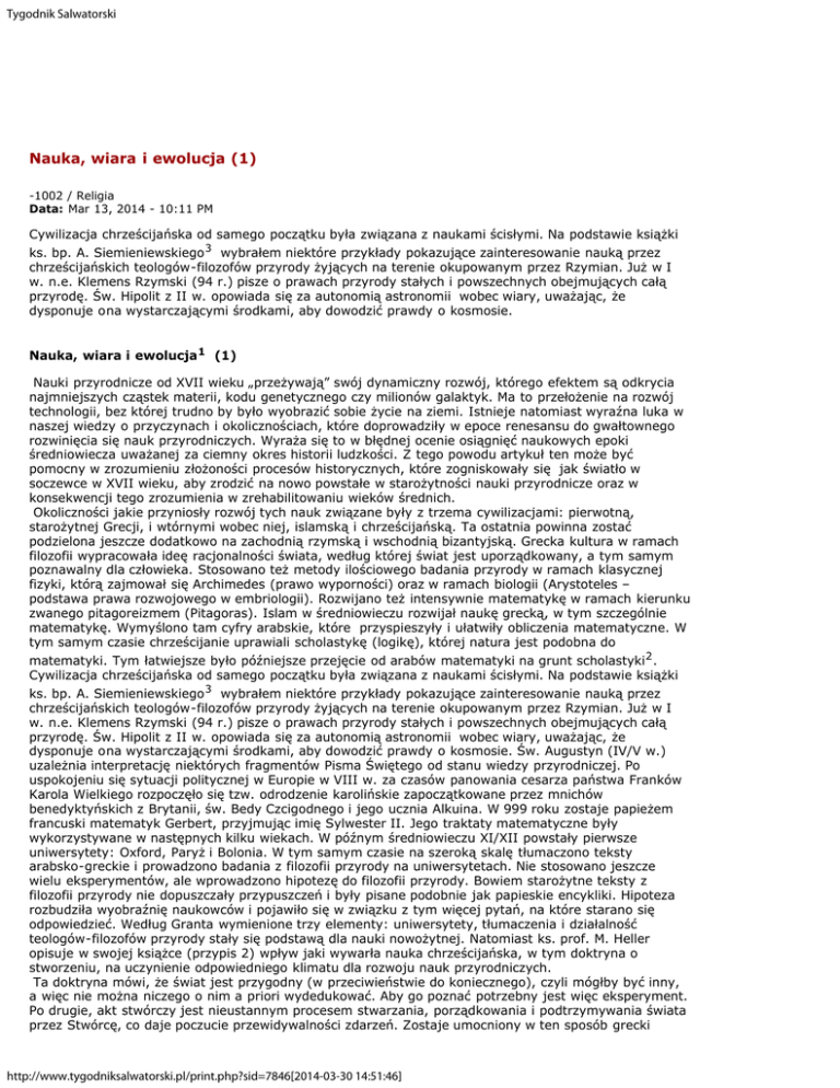Tygodnik Salwatorski Nauka, wiara i ewolucja (1) -1002 / Religia Data: Mar 13, 2014 - 10:11 PM Cywilizacja chrześcijańska od samego początku była związana z naukami ścisłymi. Na podstawie książki ks. bp. A. Siemieniewskiego 3 wybrałem niektóre przykłady pokazujące zainteresowanie nauką przez chrześcijańskich teologów-filozofów przyrody żyjących na terenie okupowanym przez Rzymian. Już w I w. n.e. Klemens Rzymski (94 r.) pisze o prawach przyrody stałych i powszechnych obejmujących całą przyrodę. Św. Hipolit z II w. opowiada się za autonomią astronomii wobec wiary, uważając, że dysponuje ona wystarczającymi środkami, aby dowodzić prawdy o kosmosie. Nauka, wiara i ewolucja 1 (1) Nauki przyrodnicze od XVII wieku „przeżywają” swój dynamiczny rozwój, którego efektem są odkrycia najmniejszych cząstek materii, kodu genetycznego czy milionów galaktyk. Ma to przełożenie na rozwój technologii, bez której trudno by było wyobrazić sobie życie na ziemi. Istnieje natomiast wyraźna luka w naszej wiedzy o przyczynach i okolicznościach, które doprowadziły w epoce renesansu do gwałtownego rozwinięcia się nauk przyrodniczych. Wyraża się to w błędnej ocenie osiągnięć naukowych epoki średniowiecza uważanej za ciemny okres historii ludzkości. Z tego powodu artykuł ten może być pomocny w zrozumieniu złożoności procesów historycznych, które zogniskowały się jak światło w soczewce w XVII wieku, aby zrodzić na nowo powstałe w starożytności nauki przyrodnicze oraz w konsekwencji tego zrozumienia w zrehabilitowaniu wieków średnich. Okoliczności jakie przyniosły rozwój tych nauk związane były z trzema cywilizacjami: pierwotną, starożytnej Grecji, i wtórnymi wobec niej, islamską i chrześcijańską. Ta ostatnia powinna zostać podzielona jeszcze dodatkowo na zachodnią rzymską i wschodnią bizantyjską. Grecka kultura w ramach filozofii wypracowała ideę racjonalności świata, według której świat jest uporządkowany, a tym samym poznawalny dla człowieka. Stosowano też metody ilościowego badania przyrody w ramach klasycznej fizyki, którą zajmował się Archimedes (prawo wyporności) oraz w ramach biologii (Arystoteles – podstawa prawa rozwojowego w embriologii). Rozwijano też intensywnie matematykę w ramach kierunku zwanego pitagoreizmem (Pitagoras). Islam w średniowieczu rozwijał naukę grecką, w tym szczególnie matematykę. Wymyślono tam cyfry arabskie, które przyspieszyły i ułatwiły obliczenia matematyczne. W tym samym czasie chrześcijanie uprawiali scholastykę (logikę), której natura jest podobna do matematyki. Tym łatwiejsze było późniejsze przejęcie od arabów matematyki na grunt scholastyki 2 . Cywilizacja chrześcijańska od samego początku była związana z naukami ścisłymi. Na podstawie książki ks. bp. A. Siemieniewskiego 3 wybrałem niektóre przykłady pokazujące zainteresowanie nauką przez chrześcijańskich teologów-filozofów przyrody żyjących na terenie okupowanym przez Rzymian. Już w I w. n.e. Klemens Rzymski (94 r.) pisze o prawach przyrody stałych i powszechnych obejmujących całą przyrodę. Św. Hipolit z II w. opowiada się za autonomią astronomii wobec wiary, uważając, że dysponuje ona wystarczającymi środkami, aby dowodzić prawdy o kosmosie. Św. Augustyn (IV/V w.) uzależnia interpretację niektórych fragmentów Pisma Świętego od stanu wiedzy przyrodniczej. Po uspokojeniu się sytuacji politycznej w Europie w VIII w. za czasów panowania cesarza państwa Franków Karola Wielkiego rozpoczęło się tzw. odrodzenie karolińskie zapoczątkowane przez mnichów benedyktyńskich z Brytanii, św. Bedy Czcigodnego i jego ucznia Alkuina. W 999 roku zostaje papieżem francuski matematyk Gerbert, przyjmując imię Sylwester II. Jego traktaty matematyczne były wykorzystywane w następnych kilku wiekach. W późnym średniowieczu XI/XII powstały pierwsze uniwersytety: Oxford, Paryż i Bolonia. W tym samym czasie na szeroką skalę tłumaczono teksty arabsko-greckie i prowadzono badania z filozofii przyrody na uniwersytetach. Nie stosowano jeszcze wielu eksperymentów, ale wprowadzono hipotezę do filozofii przyrody. Bowiem starożytne teksty z filozofii przyrody nie dopuszczały przypuszczeń i były pisane podobnie jak papieskie encykliki. Hipoteza rozbudziła wyobraźnię naukowców i pojawiło się w związku z tym więcej pytań, na które starano się odpowiedzieć. Według Granta wymienione trzy elementy: uniwersytety, tłumaczenia i działalność teologów-filozofów przyrody stały się podstawą dla nauki nowożytnej. Natomiast ks. prof. M. Heller opisuje w swojej książce (przypis 2) wpływ jaki wywarła nauka chrześcijańska, w tym doktryna o stworzeniu, na uczynienie odpowiedniego klimatu dla rozwoju nauk przyrodniczych. Ta doktryna mówi, że świat jest przygodny (w przeciwieństwie do koniecznego), czyli mógłby być inny, a więc nie można niczego o nim a priori wydedukować. Aby go poznać potrzebny jest więc eksperyment. Po drugie, akt stwórczy jest nieustannym procesem stwarzania, porządkowania i podtrzymywania świata przez Stwórcę, co daje poczucie przewidywalności zdarzeń. Zostaje umocniony w ten sposób grecki http://www.tygodniksalwatorski.pl/print.php?sid=7846[2014-03-30 14:51:46] Tygodnik Salwatorski pogląd o uporządkowaniu świata, a to oznacza możliwość jego poznawania. Po trzecie, człowiek według doktryny jest panem przyrody. Psalm 8, 6-10 o tym mówi: „Uczyniłeś go niewiele mniejszym od istot niebieskich, chwałą i czcią go uwieńczyłeś. Obdarzyłeś go władzą nad dziełami rąk Twoich; złożyłeś wszystko pod jego stopy: owce i bydło wszelakie, a nadto i polne stada, ptactwo powietrzne oraz ryby morskie, wszystko, co szlaki mórz przemierza. O Panie, nasz Panie, jak przedziwne Twe imię po wszystkiej ziemi!” Przyroda, traktowana przez starożytnych filozofów jako sacrum, zostaje w ten spos