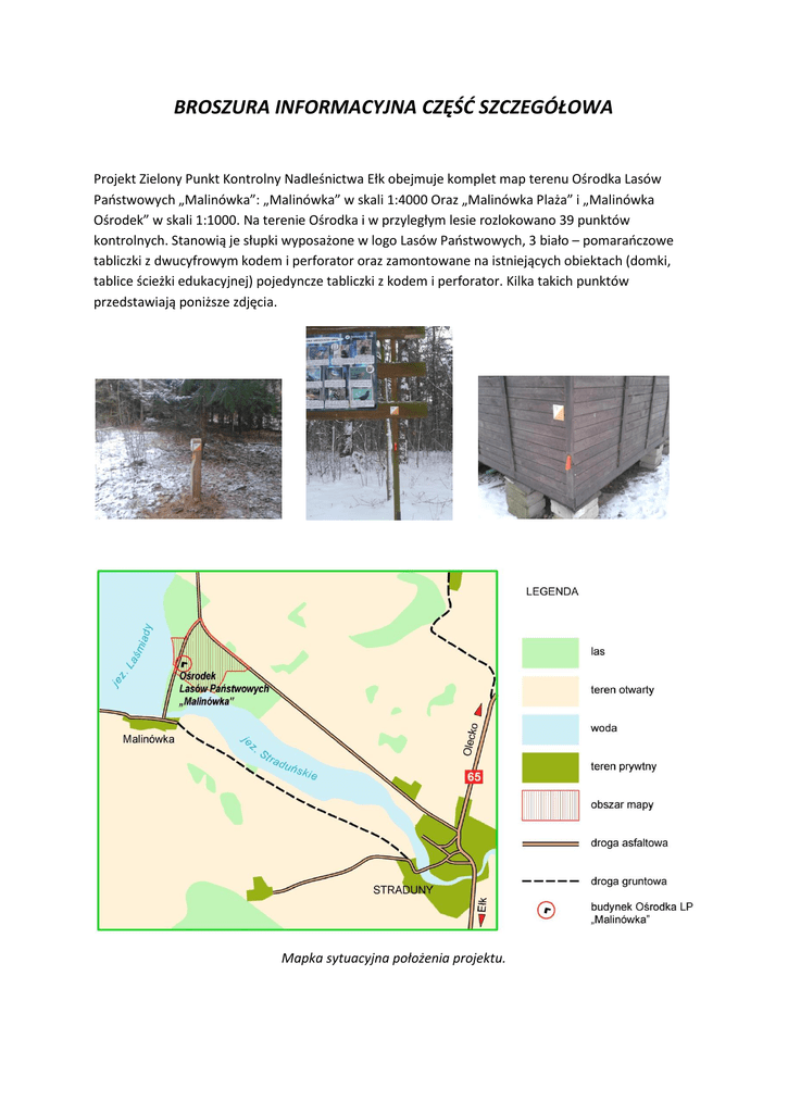 BROSZURA INFORMACYJNA CZĘŚĆ SZCZEGÓŁOWA Projekt Zielony Punkt Kontrolny Nadleśnictwa Ełk obejmuje komplet map terenu Ośrodka Lasów Państwowych „Malinówka”: „Malinówka” w skali 1:4000 Oraz „Malinówka Plaża” i „Malinówka Ośrodek” w skali 1:1000. Na terenie Ośrodka i w przyległym lesie rozlokowano 39 punktów kontrolnych. Stanowią je słupki wyposażone w logo Lasów Państwowych, 3 biało – pomarańczowe tabliczki z dwucyfrowym kodem i perforator oraz zamontowane na istniejących obiektach (domki, tablice ścieżki edukacyjnej) pojedyncze tabliczki z kodem i perforator. Kilka takich punktów przedstawiają poniższe zdjęcia. Mapka sytuacyjna położenia projektu. Proponowane trasy: Zbierz wszystkie PK (punkty kontrolne). Start i meta w tym samym miejscu 11 PK, trasa na terenie ośrodka. Wariant indywidualny. Uczestnik otrzymuje na starcie mapę z punktami i kartę startową. Musi odnaleźć i skasować na karcie startowej wszystkie w jak najkrótszym czasie. Kolejność zaliczania dowolna. Przy każdym punkcie na mapie opisany jego kod. Uczestnicy startują pojedynczo co 1 min. lub wszyscy jednocześnie. W przypadku startu interwałowego należy mierzyć czas pokonania trasy, przy jednoczesnym – pierwszy na mecie zwycięża (pod warunkiem, że ma zebrane wszystkie punkty). Wariant drużynowy. Drużyny 2-4 osobowe, start jednocześnie wszystkich razem. W momencie startu drużyna otrzymuje komplet map i kart startowych (po jednym dla każdego uczestnika). Zadaniem zespołu jest odnalezienie i skasowanie na kartach startowych wszystkich punktów. Po starcie członkowie drużyny dzielą się punktami, tak by „zebrać” je jak najszybciej. Każdy punkt kontrolny może być skasowany w drużynie tylko jeden raz. Gdy pierwsza drużyna pojawi się w komplecie na mecie zaczynamy odmierzać czas i notujemy czas przybycia kolejnych zespołów. Klasyfikujemy drużyny, które mają min. 5 punktów. Sprawdzamy karty startowe – w przypadku skasowania punktu więcej niż jeden raz za każde dodatkowe potwierdzenie PK dodajemy karę 15 sek., za brak PK – kara 1 min. Zwycięża zespół mający najmniejszy czas. Trasa leśna. Uczestnik pokonuje zadaną trasę w wyznaczonej kolejności. Należy odnaleźć i skasować na karcie startowej wszystkie punkty. Start co 1-2 min. Zwycięża zawodnik, który odnajdzie wszystkie PK w najkrótszym czasie. Uwaga na przejście przez ulicę!!! Po zakończeniu biegu można sprawdzić prawidłowość odnalezienia punktów porównując skasowane karty ze wzorem zamieszczonym poniżej. W czasie porównania korzystamy z kodów PK. W materiałach do pobrania jest mapa ze wszystkimi punktami oraz mapki bez punktów. Można samodzielnie zaprojektować trasy i bawić się w terenie.