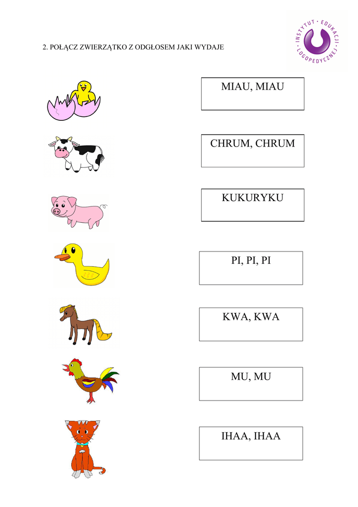 2. POŁĄCZ ZWIERZĄTKO Z ODGŁOSEM JAKI WYDAJE MIAU, MIAU CHRUM, CHRUM KUKURYKU PI, PI, PI KWA, KWA MU, MU IHAA, IHAA