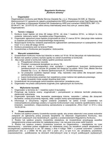 Regulamin Konkursu „Konkurs zimowy” Organizator Organizatorem konkursu jest Media Service Zawada Sp. z o.o. Warszawa 04-028, al. Stanów Zjednoczonych 51 wpisana do rejestru przedsiębiorców KRS prowadzonym przez Sąd Rejonowy dla m.st. Warszawy w Warszawie Wydział XIII Gospodarczy KRS pod numerem 000027679, NIP 11300-94-477, tel. 22 870 53 43, adres strony internetowej www.msz.com.pl zwana dalej Organizatorem. I. II. Termin i miejsce 1. Konkurs trwać będzie od dnia 28 lutego 2014r. do dnia 1 kwietnia 2014r., w którym to dniu zostanie dokonany wybór laureatów przez Organizatora. 2. Organizator zgłoszone prace będzie przyjmował do dnia 31 marca 2014r. (decyduje data nadania w urzędzie pocztowym lub bezpośredniego doręczenia). 3. Rozpoczęcie konkursu zostanie poprzedzone ogłoszeniem zamieszczonym w czasopiśmie „Winx Club” nr 2 z dnia 28 lutego 2014r. 4. Konkurs prowadzony jest na terenie Polski. 5. Uczestnictwo w Konkursie jest bezpłatne i dobrowolne. III. Warunki uczestnictwa 1. Uczestnikiem konkursu może być dziecko w wieku od 10 do 18 lat (decyduje rok kalendarzowy). 2. Rodzic lub opiekun prawny wyraża zgodę na udział Uczestnika w konkursie. 3. Aby wziąć udział w konkursie należy spełnić poniższe warunki: a) Przygotować zimowy rysunek, b) Przesłać rozwiązanie łamigłówki ze strony 19, c) pracę wraz z rozwiązaniem oraz wyciętym i wypełnionym kuponem konkursowym zamieszczonym na stronie 50 przesłać lub doręczyć na adres: Winx Club, Media Service Zawada Sp. z o.o., al. Stanów Zjednoczonych 51, 04-028 Warszawa, d) na przesyłce czytelnie napisać swoje imię, nazwisko oraz adres dla doręczeń (adres zamieszkania lub pobytu), e) kupon konkursowy powinien być wypełniony przez rodzica lub opiekuna prawnego. f) każdy Uczestnik może wysłać dowolną ilość prac. 4. Uczestnikowi nie przysługuje zwrot kosztów wykonania i przesłania prac. 5. Organizator ma prawo zatrzymania oryginału prac zgłoszonych do konkursu. IV. Wyłonienie laureata 1. Organizator w terminie do 1 kwietnia wyłoni 5 laureatów. 2. Przyjmuje się kryteria oceny: oryginalność i pomysłowość w doborze techniki plastycznej, staranność wykonania. 3. Organizator sporządzi listę laureatów zawierającą imiona, nazwiska i adresy dla doręczeń laureatów, rodzaj przyznanej nagrody, datę i podpis osoby sporządzającej listę. 4. Informacja o otrzymaniu nagród zostanie przesłana na adres e-mail Uczestnika lub rodzica/opiekuna prawnego podany w kuponie konkursowym oraz zostanie opublikowana wraz z imieniem, nazwiskiem, miejscowością zamieszkania w czasopiśmie „Winx Club” nr 4/14 z dnia 19.05.2014r. V. Prawa autorskie 1. Rodzic lub opiekun prawny Uczestnika wyraża zgodę, aby prawo własności oraz prawa autorskie związane ze zgłoszoną pracą przeszły bezpłatnie na własność Organizatora Konkursu, bez ograniczeń czasowych oraz terytorialnych, zgodnie z postanowieniami Regulaminu Konkursu. 2. Rodzic lub opiekun prawny Uczestnika oświadcza, że Uczestnikowi przysługują wszelkie nieograniczone prawa autorskie do nadesłanej pracy i nie narusza ona praw osób trzecich. 3. Rodzic lub opiekun prawny Uczestnika przenosi na Organizatora - nieodpłatnie na czas nieoznaczony – autorskie prawa majątkowe do nadesłanej pracy na wszelkich polach eksploatacji w szczególności wymienionych w art. 50 ustawy z dnia 4 lutego 1994 r. o prawie autorskim i prawach pokrewnych (Dz. U. z 2006r. Nr 90, poz. 631 z późn. zm.), w tym m.in. do: utrwalenia, powielenia, rozpowszechnia , publikowania na stronach internetowych oraz w innych publikacjach wydawanych przez Organizatora we wszystkich technikach znanych w dniu złożenia oświadczenia – uprawnienie to dotyczy wielokrotnego publikowania i nie jest ograniczone w czasie i co do terytorium. Przeniesienie praw autorskich następuje w dniu wyłonienia laureatów. VI. Nagrody 1. Laureaci konkursu otrzymają nagrody w postaci: a) 5 zestawów (gra PC + Minirutin) ufundowanych przez firmę Bio garden Sp. z o.o. o wartości jednostkowej 40 zł brutto ( 32,52 zł netto + 0,23 zł VAT). 2. Nagroda nie może zostać zamieniona na nagrodę pieniężną lub inną rzeczową. 3. Jeden uczestnik może zostać laureatem jednej nagrody. 4. Odbiór nagrody: nagroda zostanie przesłana pocztą – listem poleconym w terminie 6 tygodni od daty opublikowania listy laureatów w numerze 4/2014 z dnia 19.05.2014 r. na podany adres dla doręczeń. VII. Reklamacje 1. Każdemu Uczestnikowi przysługuje prawo wniesienia reklamacji związanej z niniejszym Konkursem w terminie do 15 dni roboczych po zakończeniu konkursu. 2. Reklamacje należy zgłaszać na adres Organizatora. 3. Zainteresowani, zostaną powiadomieni o rozpatrzeniu reklamacji w ciągu 14 dni od daty jej otrzymania. Przetwarzanie danych osobowych Uczestników Konkursu VIII. 1. Organizator, którego dane podane są na wstępie, oświadcza, że na podstawie art. 24 ust. 1 ustawy 2. 3. 4. 5. z dnia 29 sierpnia 1997 r. o ochronie danych osobowych (tj. z 2002 r. Nr 101, poz. 926 z późn. zm.) jest administratorem podanych przez Uczestnika danych osobowych. Uczestnik konkursu poda prawdziwe dane osobowe, tj.: imię, nazwisko, adres dla doręczeń, wiek, adres e-mail. Przekazane dane będą chronione zgodnie z ustawą z dnia 29 sierpnia 1997 r. o ochronie danych osobowych (tekst jedn. Dz. U. z 2002 r., Nr 101, poz. 926, z późn. zm.). Przetwarzanie danych, w tym ich zbieranie, przechowywanie jest dokonywane w celach związanych z realizacją Konkursu, w tym w celu jednorazowej publikacji danych Uczestnika (imienia, nazwiska, miejscowości zamieszkania, wieku, zdjęcia laureata oraz zdjęcia pracy konkursowej) w ogłoszeniu o laureatach konkursu oraz w celach marketingowych, przez Media Service Zawada sp. z o.o. al. Stanów Zjednoczonych 51, 04-028 Warszawa, w tym udostępnienia renomowanym podmiotom współpracującym z administratorem danych, na warunkach określonych w ustawie z
