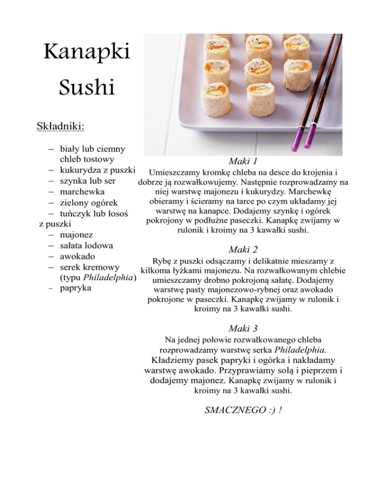 Kanapki Sushi Składniki: biały lub ciemny chleb tostowy Maki 1 kukurydza z puszki Umieszczamy kromkę chleba na desce do krojenia i szynka lub ser dobrze ją rozwałkowujemy. Następnie rozprowadzamy na niej warstwę majonezu i kukurydzy. Marchewkę marchewka obieramy i ścieramy na tarce po czym układamy jej zielony ogórek warstwę na kanapce. Dodajemy szynkę i ogórek tuńczyk lub łosoś pokrojony w podłużne paseczki. Kanapkę zwijamy w z puszki rulonik i kroimy na 3 kawałki sushi. majonez sałata lodowa Maki 2 awokado Rybę z puszki odsączamy i delikatnie mieszamy z serek kremowy kilkoma łyżkami majonezu. Na rozwałkowanym chlebie (typu Philadelphia) umieszczamy drobno pokrojoną sałatę. Dodajemy papryka warstwę pasty majonezowo-rybnej oraz awokado pokrojone w paseczki. Kanapkę zwijamy w rulonik i kroimy na 3 kawałki sushi. Maki 3 Na jednej połowie rozwałkowanego chleba rozprowadzamy warstwę serka Philadelphia. Kładziemy pasek papryki i ogórka i nakładamy warstwę awokado. Przyprawiamy solą i pieprzem i dodajemy majonez. Kanapkę zwijamy w rulonik i kroimy na 3 kawałki sushi. SMACZNEGO :) !