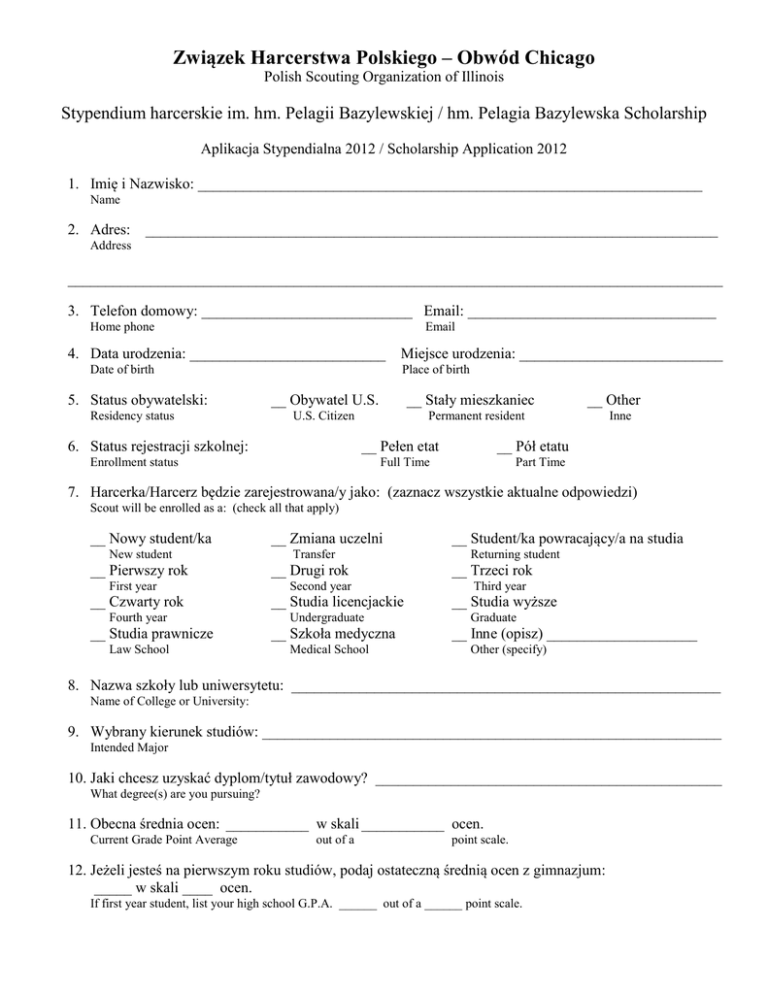 Związek Harcerstwa Polskiego – Obwód Chicago Polish Scouting Organization of Illinois Stypendium harcerskie im. hm. Pelagii Bazylewskiej / hm. Pelagia Bazylewska Scholarship Aplikacja Stypendialna 2012 / Scholarship Application 2012 1. Imię i Nazwisko: ___________________________________________________________________ Name 2. Adres: ____________________________________________________________________________ Address _______________________________________________________________________________________ 3. Telefon domowy: ____________________________ Email: _________________________________ Home phone Email 4. Data urodzenia: __________________________ Date of birth 5. Status obywatelski: Residency status Miejsce urodzenia: ___________________________ Place of birth __ Stały mieszkaniec __ Obywatel U.S. U.S. Citizen __ Pełen etat 6. Status rejestracji szkolnej: __ Other Permanent resident Enrollment status Inne __ Pół etatu Full Time Part Time 7. Harcerka/Harcerz będzie zarejestrowana/y jako: (zaznacz wszystkie aktualne odpowiedzi) Scout will be enrolled as a: (check all that apply) __ Nowy student/ka New student __ Pierwszy rok First year __ Czwarty rok Fourth year __ Studia prawnicze Law School __ Zmiana uczelni Transfer __ Drugi rok Second year __ Studia licencjackie Undergraduate __ Szkoła medyczna Medical School __ Student/ka powracający/a na studia Returning student __ Trzeci rok Third year __ Studia wyższe Graduate __ Inne (opisz) ____________________ Other (specify) 8. Nazwa szkoły lub uniwersytetu: _________________________________________________________ Name of College or University: 9. Wybrany kierunek studiów: _____________________________________________________________ Intended Major 10. Jaki chcesz uzyskać dyplom/tytuł zawodowy? ______________________________________________ What degree(s) are you pursuing? 11. Obecna średnia ocen: ___________ w skali ___________ ocen. Current Grade Point Average out of a point scale. 12. Jeżeli jesteś na pierwszym roku studiów, podaj ostateczną średnią ocen z gimnazjum: _____ w skali ____ ocen. If first year student, list your high school G.P.A. ______ out of a ______ point scale. 13. Szkolenie: podaj kolejno wszystkie uczęszczane szkoły, poczynając od szkoły podstawowej, łącznie z gimnazjum, kolegium, technikum, szkołami zawodowymi i służbą wojskową. Educational background: list, in order, all schools attended beginning with elementary school and including high school, college, technical, professional and military service. Nazwa szkoły Lata uczęszczania Dyplom/Certyfikat Daty School Name Years Attended Degree/Diploma Dates _____________________________________________________________________________ _____________________________________________________________________________ _____________________________________________________________________________ 14. Podaj wszystkie szczególne osiągnięcia (odznaczenia, wyróżnienia lub nagrody). Udział w konkursach/olimpiadach w szkole (proszę podać nazwę, tematykę, ewentualne miejsce zajęte i rok uczestnictwa). List any recognition (Honors, Prizes, or Awards) for excellence. List any contests (list name, theme, place attained and year of participation. _____________________________________________________________________________ _____________________________________________________________________________ _____________________________________________________________________________ 15. Dodatkowe zaangażowanie w szkole i poza szkołą (działalność w akcjach, członkostwo w klubach / organizacjach). Podaj także wszystkie funkcje pełnione w organizacjach lub klubach szkolnych lub pozaszkolnych. List any school, community or other non-school related activities, including offices held in or outside of school. _____________________________________________________________________________ _____________________________________________________________________________ 16. Znajomość języków obcych (biegła, dobra, podstawowa). List any languages that you can speak and level of fluency. _____________________________________________________________________________ _____________________________________________________________________________ Odpowiedzi na następujące dwa pytania muszą być spisane i wydrukowane na osobnej kartce. Odpowiedzi mogą być po polsku lub po angielsku. Obowiązują odpowiedzi na oba pytania. Response to the following two essay questions must be printed on a separate sheet. They may be in either Polish or English. Responses to BOTH questions mandatory. Nazwisko, Imię ________________________________ 17. Podaj swój życiorys w Harcerstwie: ile lat jesteś członkiem/kinią, do których drużyn i gromad należałeś/aś, jaki masz stopień, jaką masz funkcję? Opisz jak Harcerstwo wpłynęło na twoje życie i dlaczego dalej jesteś członkiem. Jak i dlaczego zachęcałbyś innych do zapisania się do Harcerstwa? Jak wyobrażasz swoją rolę w Harcerstwie za 5 lat? List your history in Harcerstwo. How many years, which drużyna / gromada, when did you join, what stopnie have you earned, what funkcje do you now hold ? How has Harcerstwo affected your life and why are you still active ? Why and how would you encourage others to become members? Where do you see yourself in Harcerstwo in the next 5 years? 18. Jak i do jakiego stopnia uczestniczysz w zajęciach polonijnych i w życiu Polonii? Opisz jak ta działalność na ciebie wpłynęła. To what extent have you participated in Polish–American activities, and how has your involvement impacted you ? Oświadczam, że przedstawione dane są zgodne z faktami. Jestem świadomy/a, iż podaniem nieprawdziwych danych, tracę wszelkie uprawnienia do korzystania z pomocy funduszu stypendialnego i jestem odpowiedzialny/a za zwrócenie wszystkich pieniędzy nagrodzonych przez stypendium. Również potwierdzam, że załączyłem/am wszelkie potrzebne dodatkowe dokumenty i opinie o zasadn