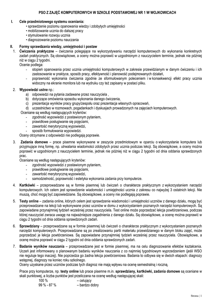 PSO Z ZAJĘĆ KOMPUTEROWYCH W SZKOLE PODSTAWOWEJ NR 1 W WOJKOWICACH I. II. Cele przedmiotowego systemu oceniania: • sprawdzenie poziomu opanowania wiedzy i zdobytych umiejętności • mobilizowanie ucznia do dalszej pracy • stymulowanie rozwoju ucznia • diagnozowanie poziomu nauczania Formy sprawdzania wiedzy, umiejętności i postaw 1. Ćwiczenia praktyczne – ćwiczenia polegające na wykorzystywaniu narzędzi komputerowych do wykonania konkretnych zadań praktycznych. Są obowiązkowe, a oceny można poprawić w uzgodnionym z nauczycielem terminie, jednak nie później niż w ciągu 2 tygodni. Ocenie podlega: - stopień opanowania przez ucznia umiejętności komputerowych w zakresie przewidzianym w danym ćwiczeniu i ich zastosowanie w praktyce, sposób pracy, efektywność i planowość podejmowanych działań, - poprawność wykonania ćwiczenia zgodnie ze sformułowanym poleceniem i w konsekwencji efekt pracy ucznia widoczny na ekranie monitora lub na wydruku czy też zapisany w postaci pliku. 2. Wypowiedzi ustne np.: a) odpowiedzi na pytania zadawane przez nauczyciela , b) dotyczące omówienia sposobu wykonania danego ćwiczenia, c) prezentacja wyników pracy grupy/zespołu oraz prezentacja własnych opracowań, d) uczestnictwo w rozmowach, pogadankach i dyskusjach prowadzonych na zajęciach komputerowych. Oceniane są według następujących kryteriów: - zgodność wypowiedzi z postawionym pytaniem, - prawidłowe posługiwanie się pojęciami, - zawartość merytoryczną wypowiedzi, - sposób formułowania wypowiedzi. Oceny otrzymane z odpowiedzi nie podlegają poprawie. 3. Zadania domowe – prace pisemne wykonywane w zeszycie przedmiotowym w oparciu o wykorzystanie komputera lub przyjmujące inną formę, np. utrwalania wiadomości zdobytych przez ucznia podczas lekcji. Są obowiązkowe, a oceny można poprawić w uzgodnionym z nauczycielem terminie, jednak nie później niż w ciągu 2 tygodni od dnia oddania sprawdzonych prac. Oceniane są według następujących kryteriów: - zgodność wypowiedzi z postawionym pytaniem, - prawidłowe posługiwanie się pojęciami, - zawartość merytoryczną wypowiedzi, - samodzielność, poprawność i estetyka wykonania zadania przy komputerze. 4. Kartkówki – przeprowadzane są w formie pisemnej lub ćwiczeń o charakterze praktycznym z wykorzystaniem narzędzi komputerowych. Ich celem jest sprawdzenie wiadomości i umiejętności ucznia z zakresu co najwyżej 3 ostatnich lekcji. Nie muszą, choć mogą być zapowiedziane. Są obowiązkowe, a oceny nie podlegają poprawie. 5. Testy online – zadania online, których celem jest sprawdzenie wiadomości i umiejętności uczniów z danego działu, mogą być przeprowadzane na lekcji lub wykonywane przez uczniów w domu z wykorzystaniem poznanych narzędzi komputerowych. Są zapowiadane przynajmniej tydzień wcześniej przez nauczyciela. Test online może poprzedzać lekcja powtórzeniowa, podczas której nauczyciel zwraca uwagę na najważniejsze zagadnienia z danego działu. Są obowiązkowe, a ocenę można poprawić w ciągu 2 tygodni od dnia oddania sprawdzonych zadań. 6. Sprawdziany – przeprowadzane są w formie pisemnej lub ćwiczeń o charakterze praktycznym z wykorzystaniem poznanych narzędzi komputerowych. Przeprowadzane są po zrealizowaniu partii materiału przewidzianego w danym bloku zajęć, może poprzedzać je lekcja powtórzeniowa. Są zapowiadane przynajmniej tydzień wcześniej przez nauczyciela. Obowiązkowe, a ocenę można poprawić w ciągu 2 tygodni od dnia oddania sprawdzonych zadań. 7. Badanie wyników nauczania – przeprowadzane jest w formie pisemnej, ma na celu diagnozowanie efektów kształcenia. Uczeń jest informowany o planowanym badaniu wyników nauczania z co najmniej tygodniowym wyprzedzeniem (jeśli WSO nie reguluje tego inaczej). Nie poprzedza go żadna lekcja powtórzeniowa. Badania to odbywa się w dwóch etapach: diagnozy wstępnej, diagnozy na koniec roku szkolnego. Oceny uzyskane przez uczniów podczas tych diagnoz nie mają wpływu na ocenę semestralną i roczną. Prace przy komputerze, np. testy online lub prace pisemne m.in. sprawdziany, kartkówki, zadania domowe są oceniane w skali punktowej, a liczba punktów jest przeliczana na ocenę według następującej skali: 100 % – celujący 99 % - 87 % – bardzo dobry Strona | 1 86 % - 75 % – dobry 74 % - 51 % – dostateczny 50 % - 31 % – dopuszczający 30 % - 0 % – niedostateczny W ocenianiu również uwzględnia się indywidualne predyspozycje i możliwości ucznia, wkład pracy włożony przez niego w wykonanie określonego zadania oraz zaangażowanie, czy systematyczność i samodzielność w pracy. 8. Postawy ucznia (plusy i minusy) Plusy uczeń może otrzymać za: aktywność na lekcji, prace (zadania) domowe, udział w pracy grupy/zespołu i inne. Minusy uczeń może otrzymać za: brak pracy domowej, brak zeszytu przedmiotowego, zeszytu ćwiczeń lub innego środka dydaktycznego potrzebnego do lekcji, wskazanego przez nauczyciela i inne (zgłaszane nauczycielowi na początku zajęć). Zdobycie trzech (+) jest równoznaczne z otrzymaniem oceny bardzo dobrej z aktywności, trzy (-) - oceny niedostatecznej za braki, która nie podlega poprawie. 9. Inne formy aktywności a) Udział w konkursach szkolnych i pozaszkolnych b) Prace (zadania) domowe nadobowiązkowe III. Zasady ustalania ocen bieżącej, semestralnej i rocznej Na zajęciach komputerowych obowiązuje wagowy system oceniania. Uczeń może zdobyć oceny o następujących wagach: WAGA 5: testy online, sprawdziany WAGA 4: kartkówki, wypowiedzi ustne WAGA 3: ćwiczenia praktyczne, prace domowe, prace dodatkowe, udział w konkursach, aktywność, braki Ocena semestralna i roczna jest uwarunkowana otrzymaną średnią ważoną z przedmiotu - zajęcia komputerowe. IV. Umowy z uczniami: 1. Na prośbę ucznia lub rodzica/opiekuna prawnego otrzymane przez niego oceny mogą być wpisywane do zeszytu przedmiotowego lub